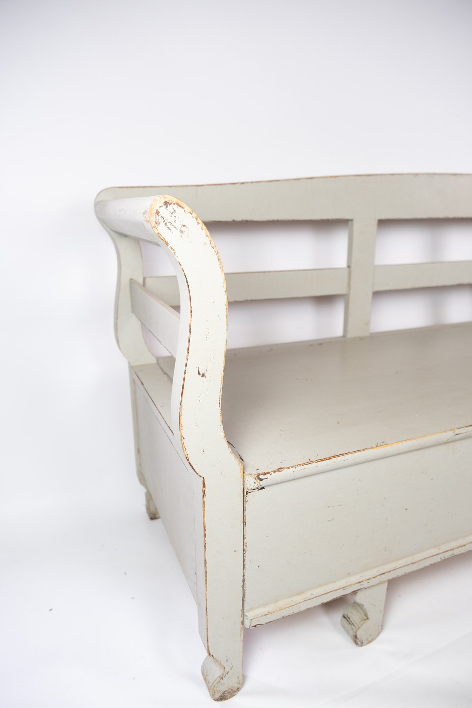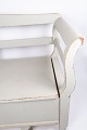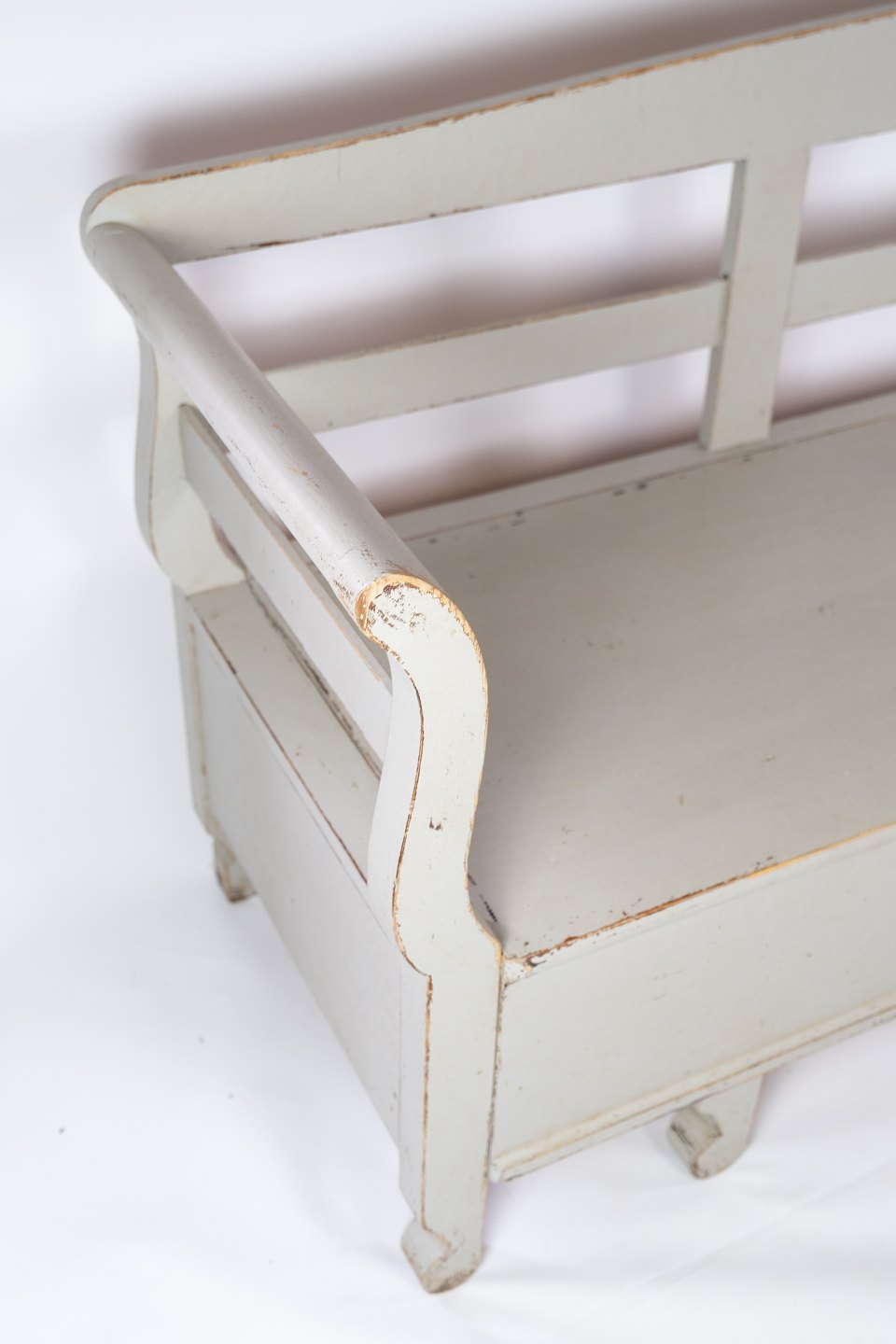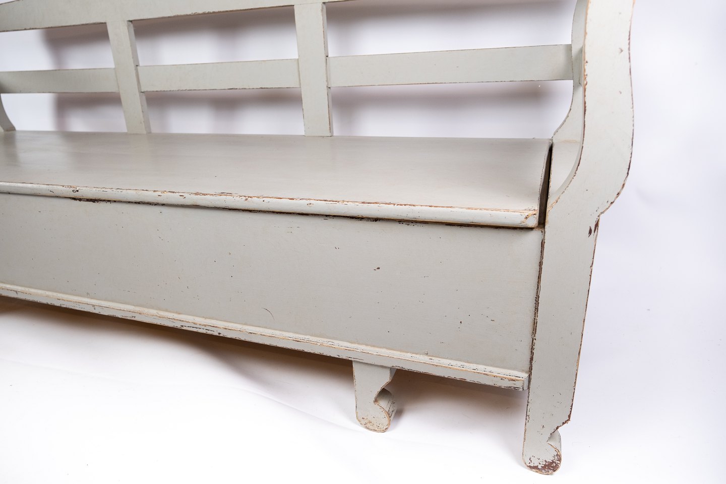 Grey painted gustavian wooden bench with storage and in great antique condition from the 1840s.