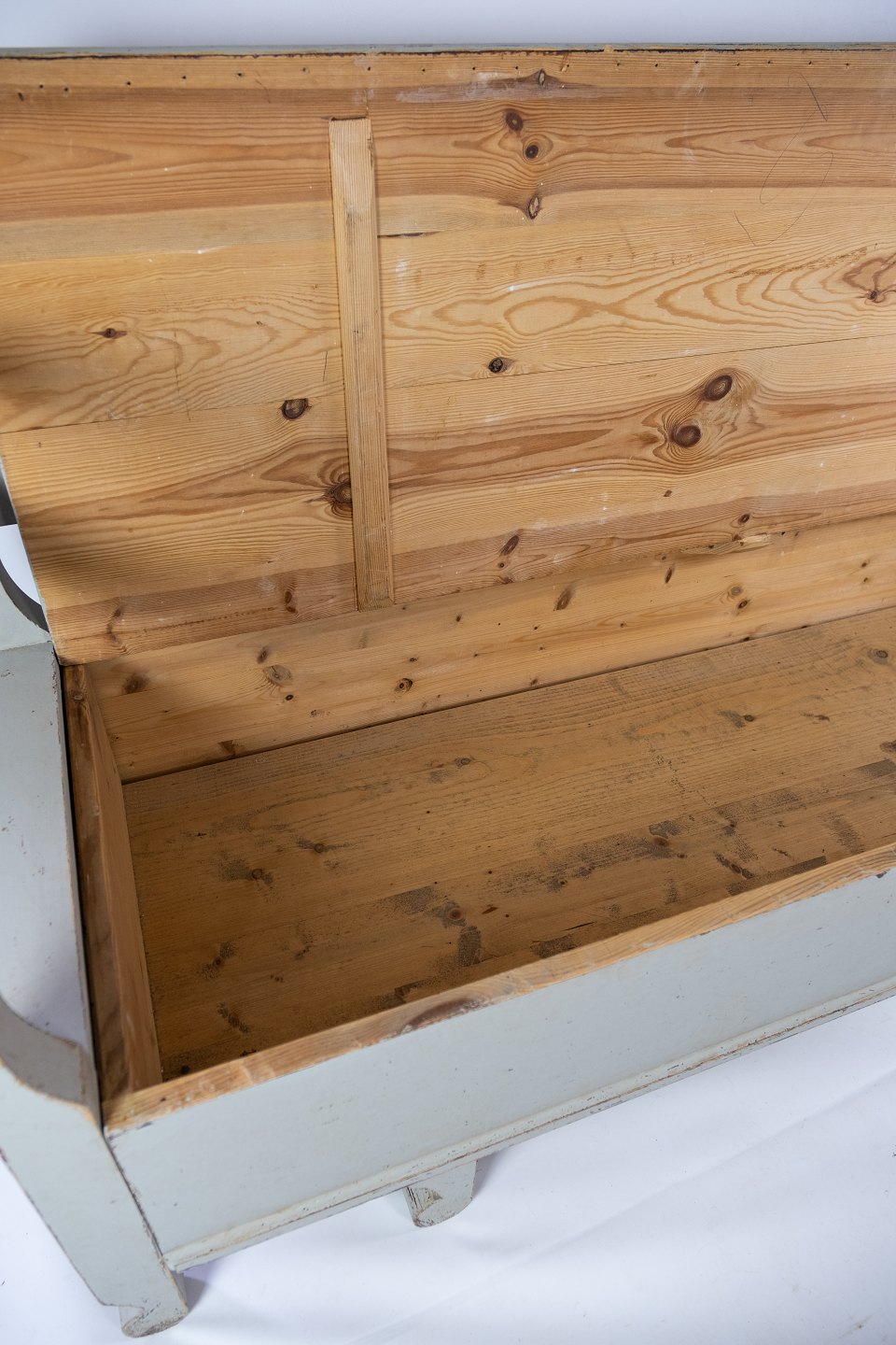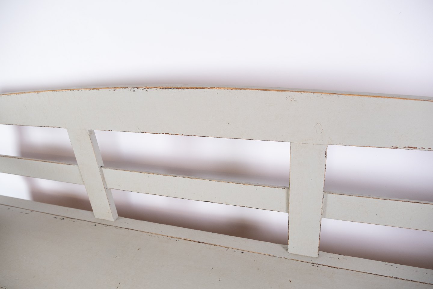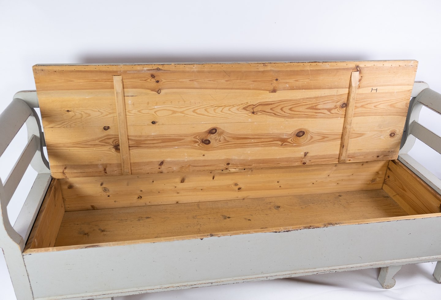 Grey painted gustavian wooden bench with storage and in great antique condition from the 1840s.