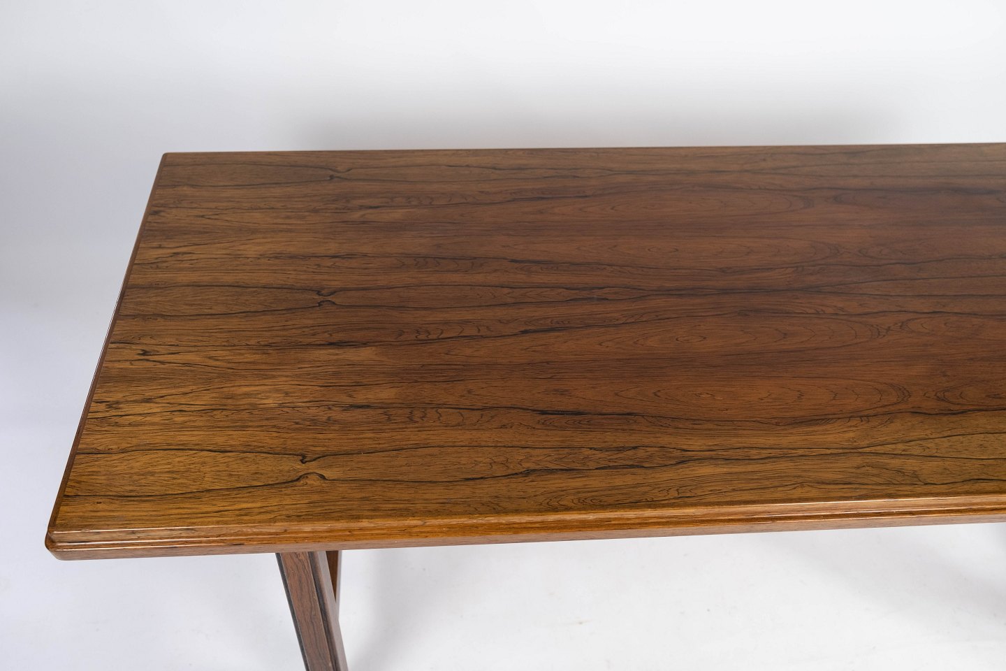 The coffee table is a beautiful example of Danish design from the 1960s, made of rosewood. It is a piece of furniture that exudes elegance and timeless beauty with its beautiful wooden structure and well-crafted details. Rosewood is known for its durability and rich colors, making it a popular choice among furniture makers of this era.