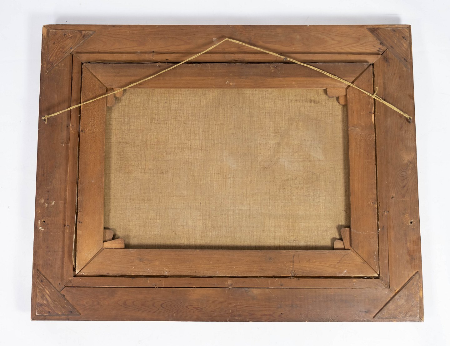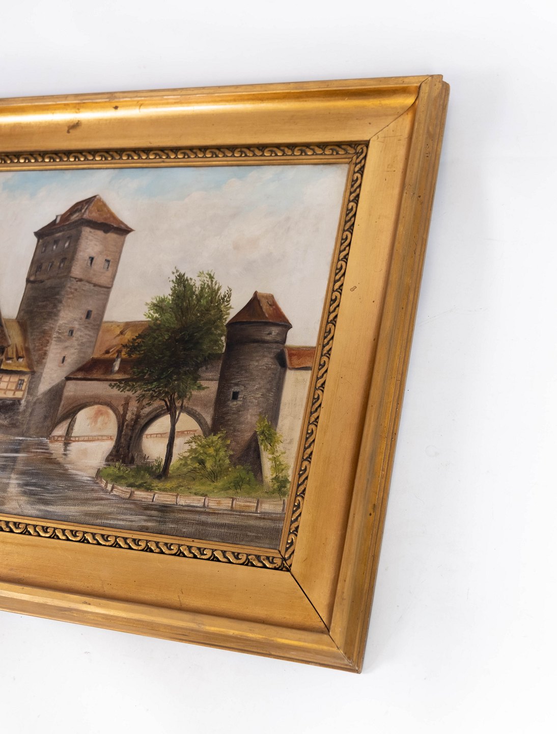 Oliemaleri med by motiv og forgyldt ramme, med ukendt signatur fra omkring 1910.
