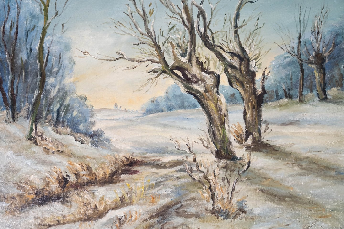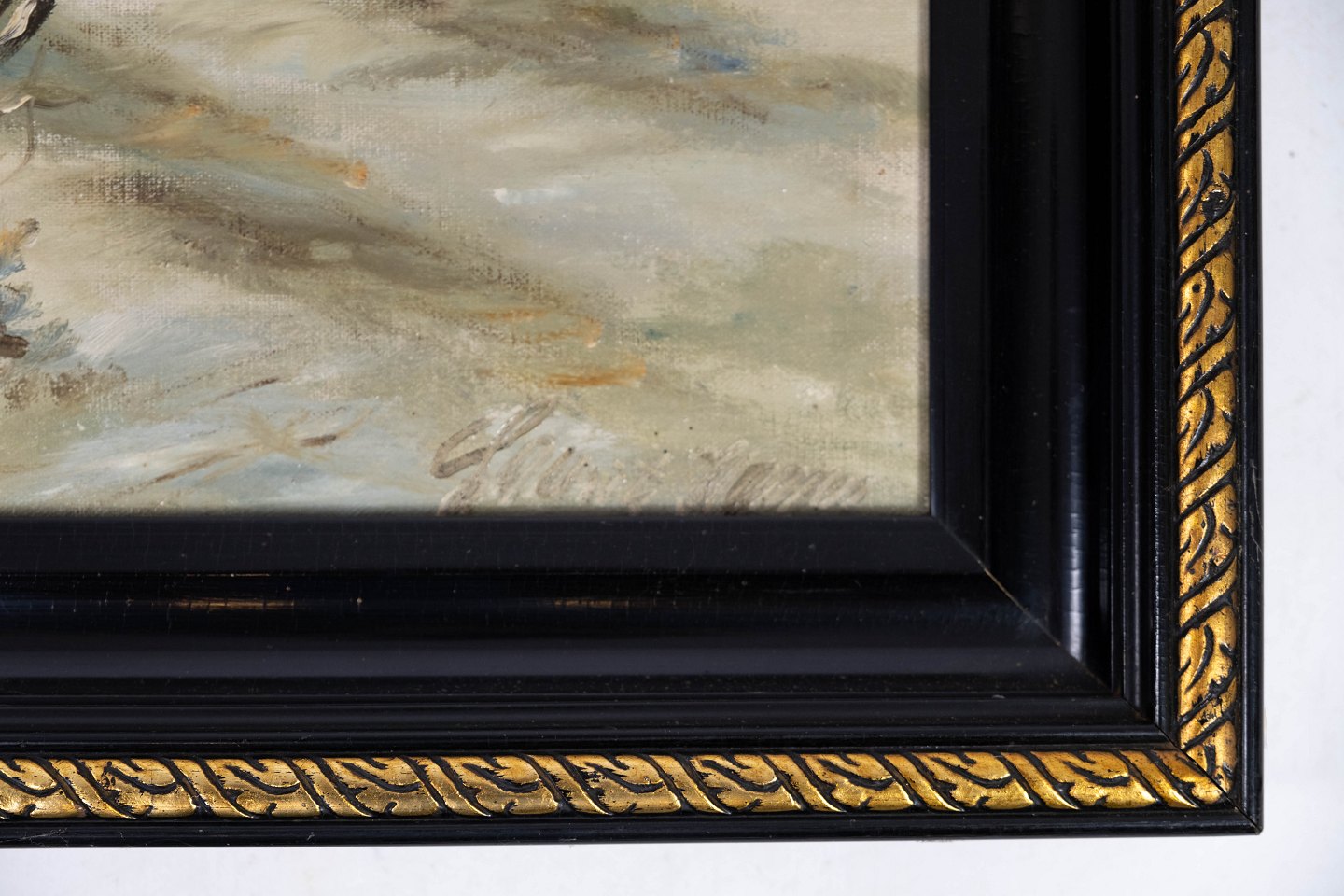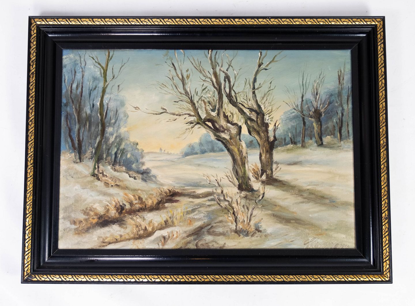Oliemaleri med vintermotiv og sort malet ramme, med ukendt signatur fra 1920erne.