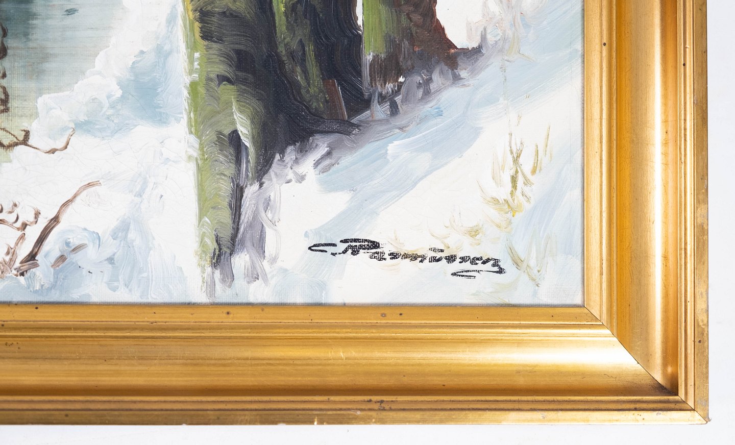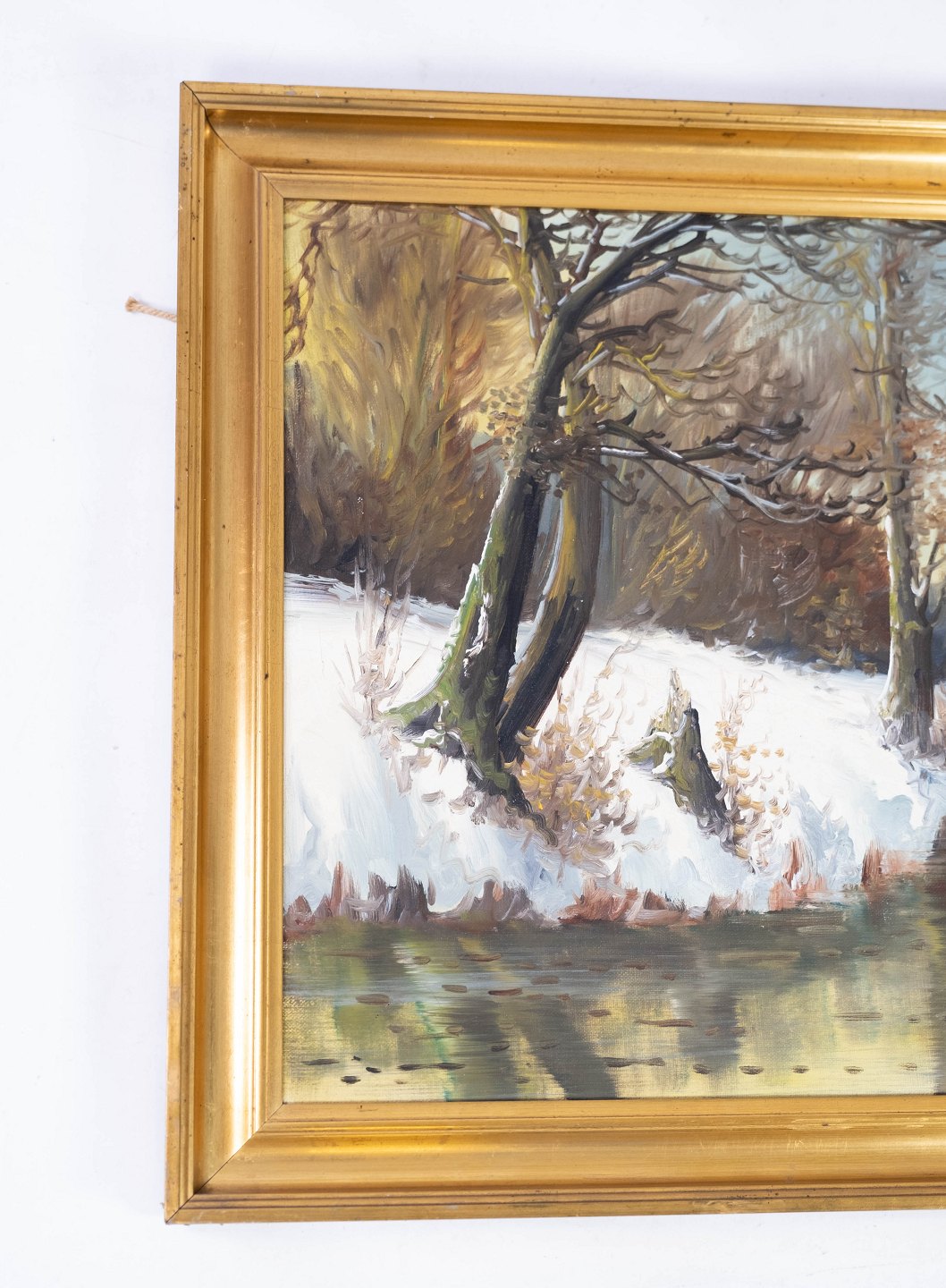Oliemaleri med vinter motiv og forgyldt ramme, ukendt signatur fra 1930erne.