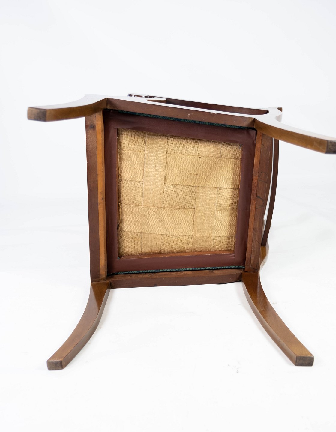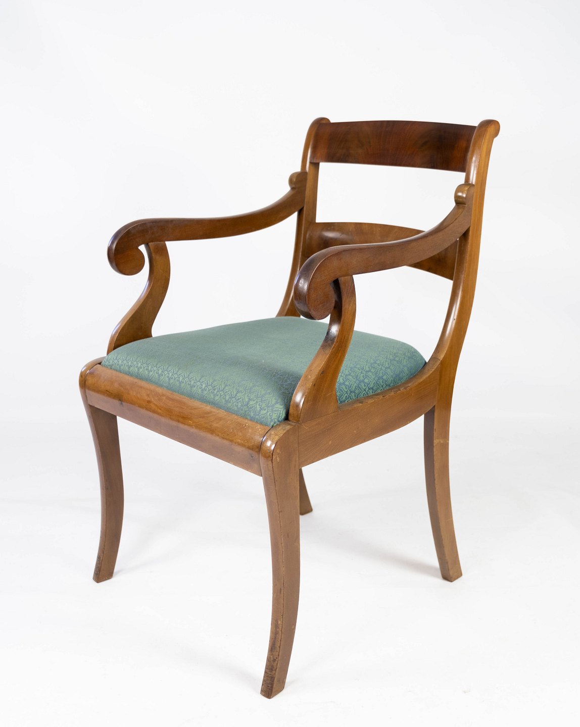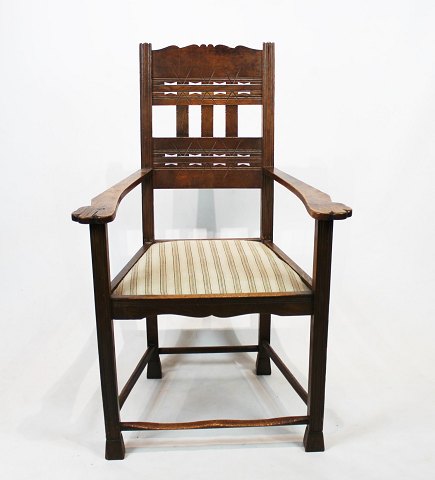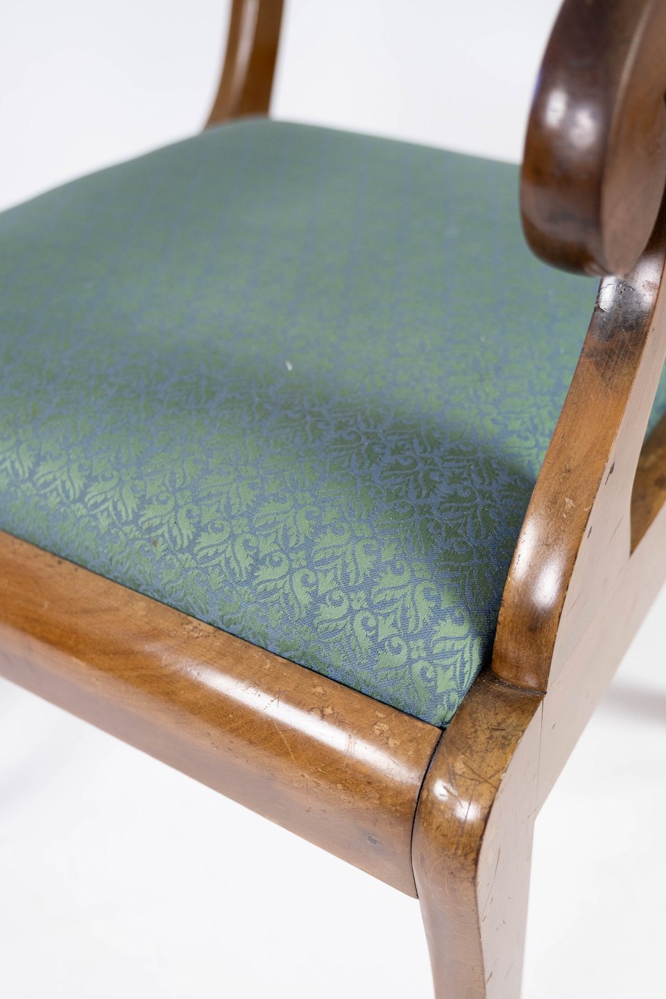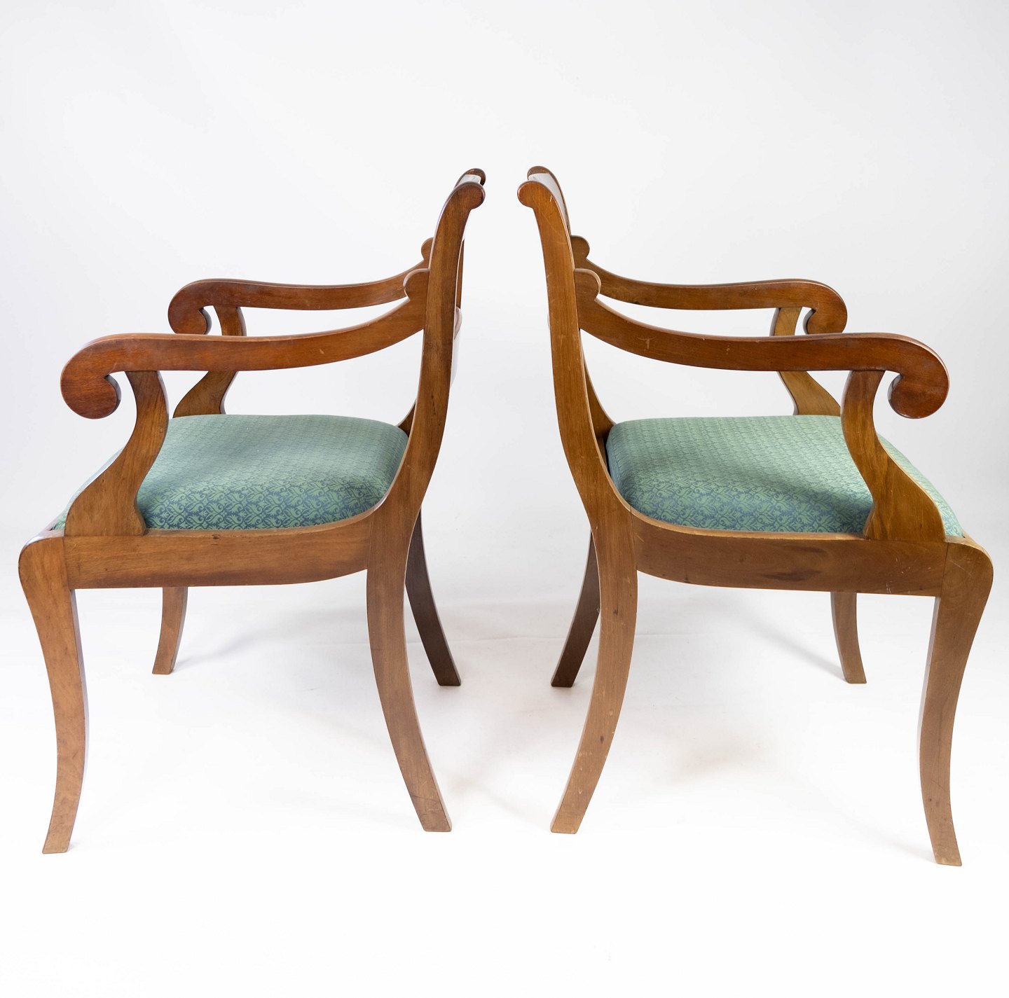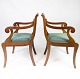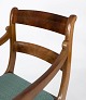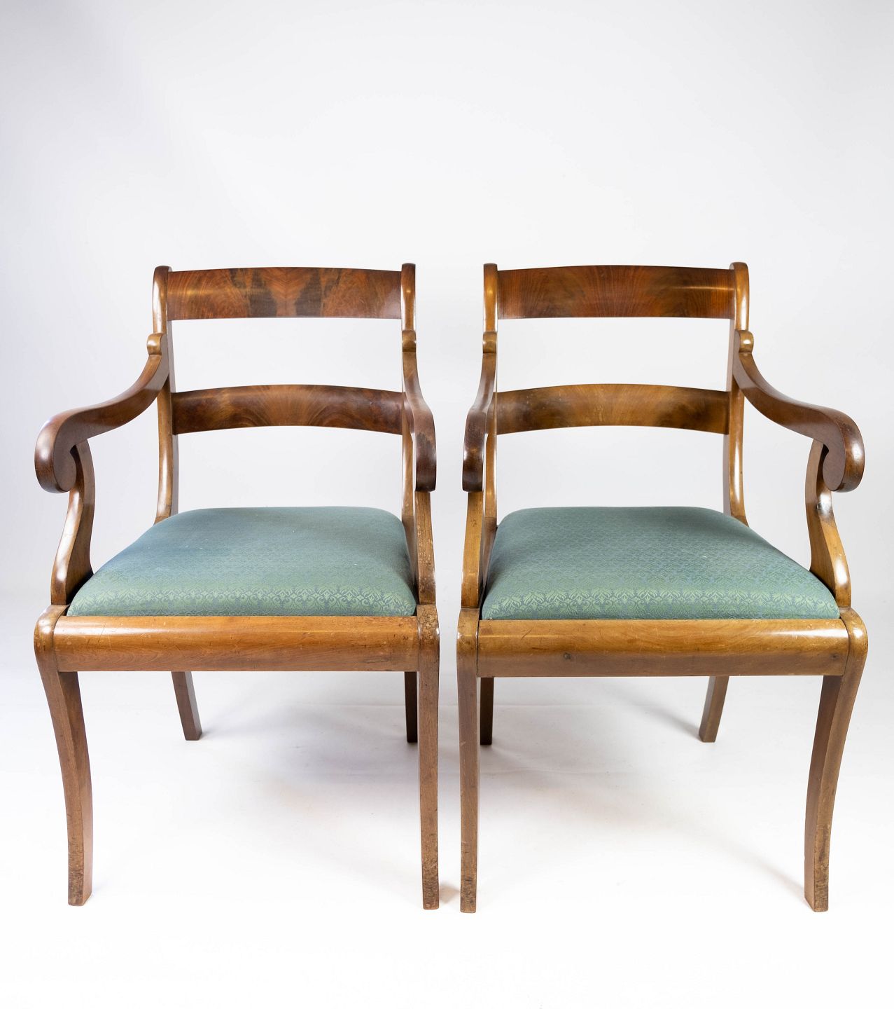 A pair of armchairs in mahogany and upholstered with dark fabric, both are in great vintage condition from the 1890s.
