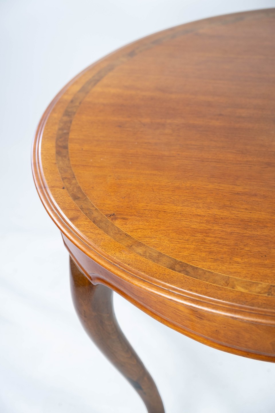 Round dining table of mahogany with inlaid wood of walnut, in great vintage condition from 1880.