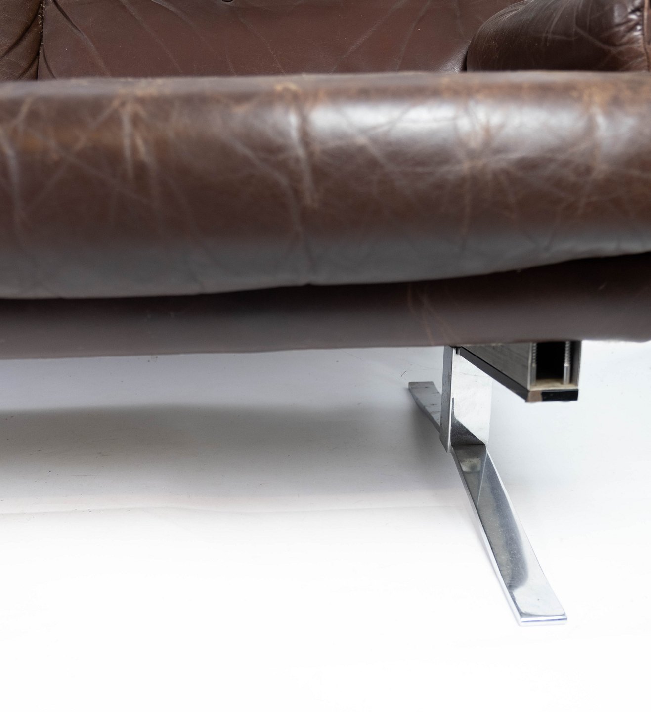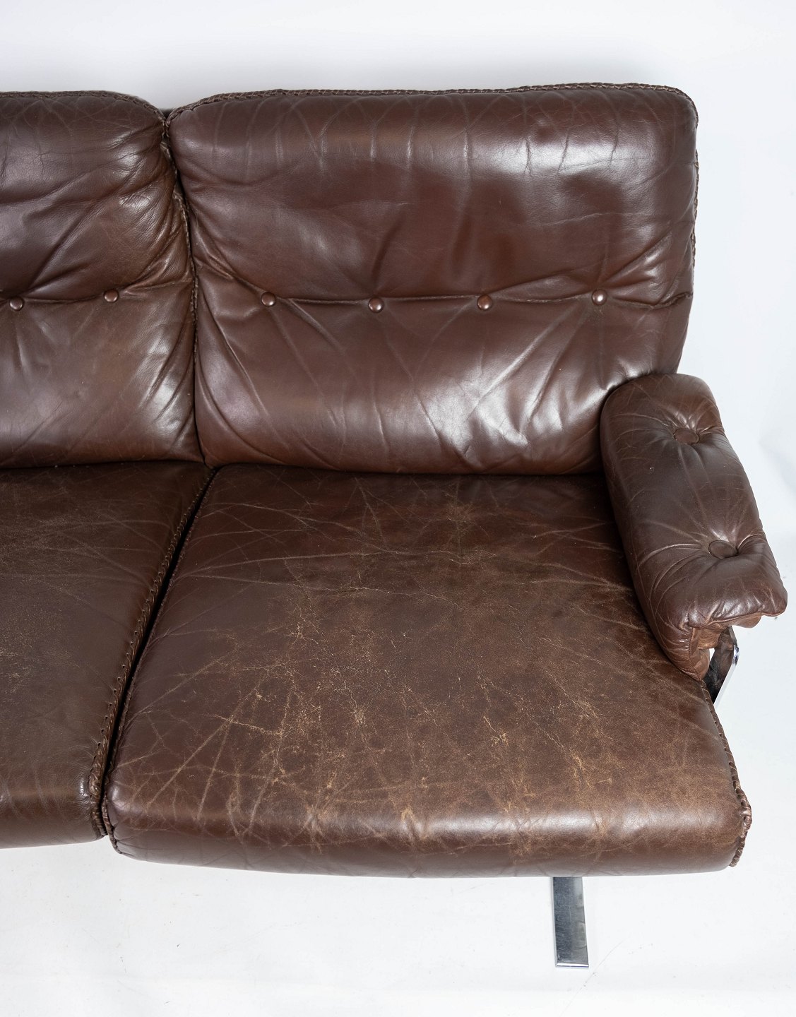 The three-seater sofa in brown patinated leather with a metal frame, designed by Arne Norell in 1970, is a distinctive example of Scandinavian furniture design from the 20th century. Norell was known for his talent for creating furniture that combined comfort, functionality and unique aesthetics, and this sofa is no exception.