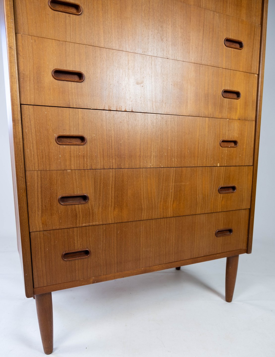 Denne kommode af teak, designet af danske håndværkere omkring 1960, er et klassisk eksempel på dansk møbeldesign fra denne æra. Teaktræet tilføjer en varm og naturlig tone til møblet og bringer samtidig en følelse af holdbarhed og tidløshed.