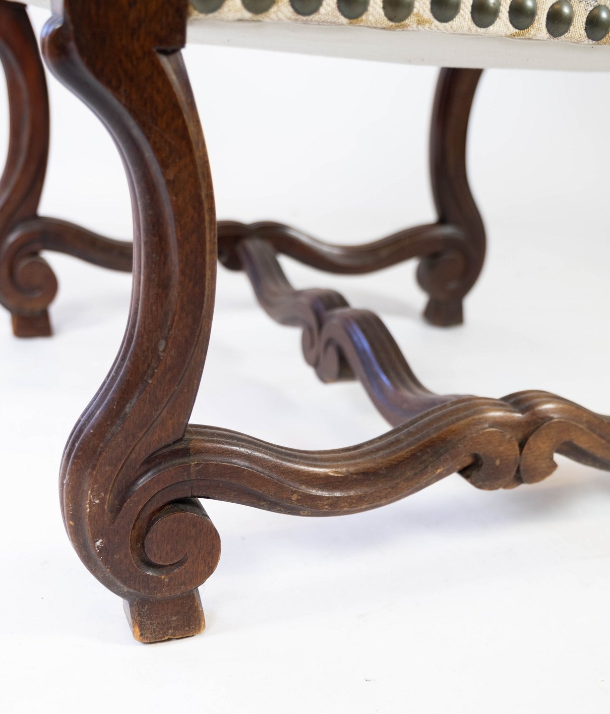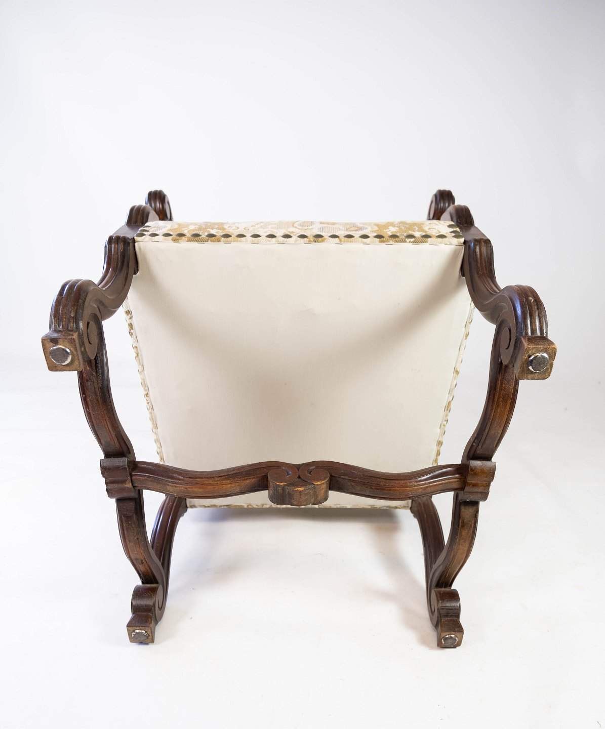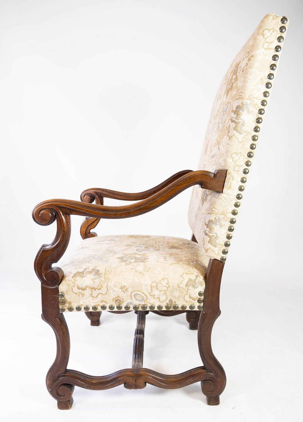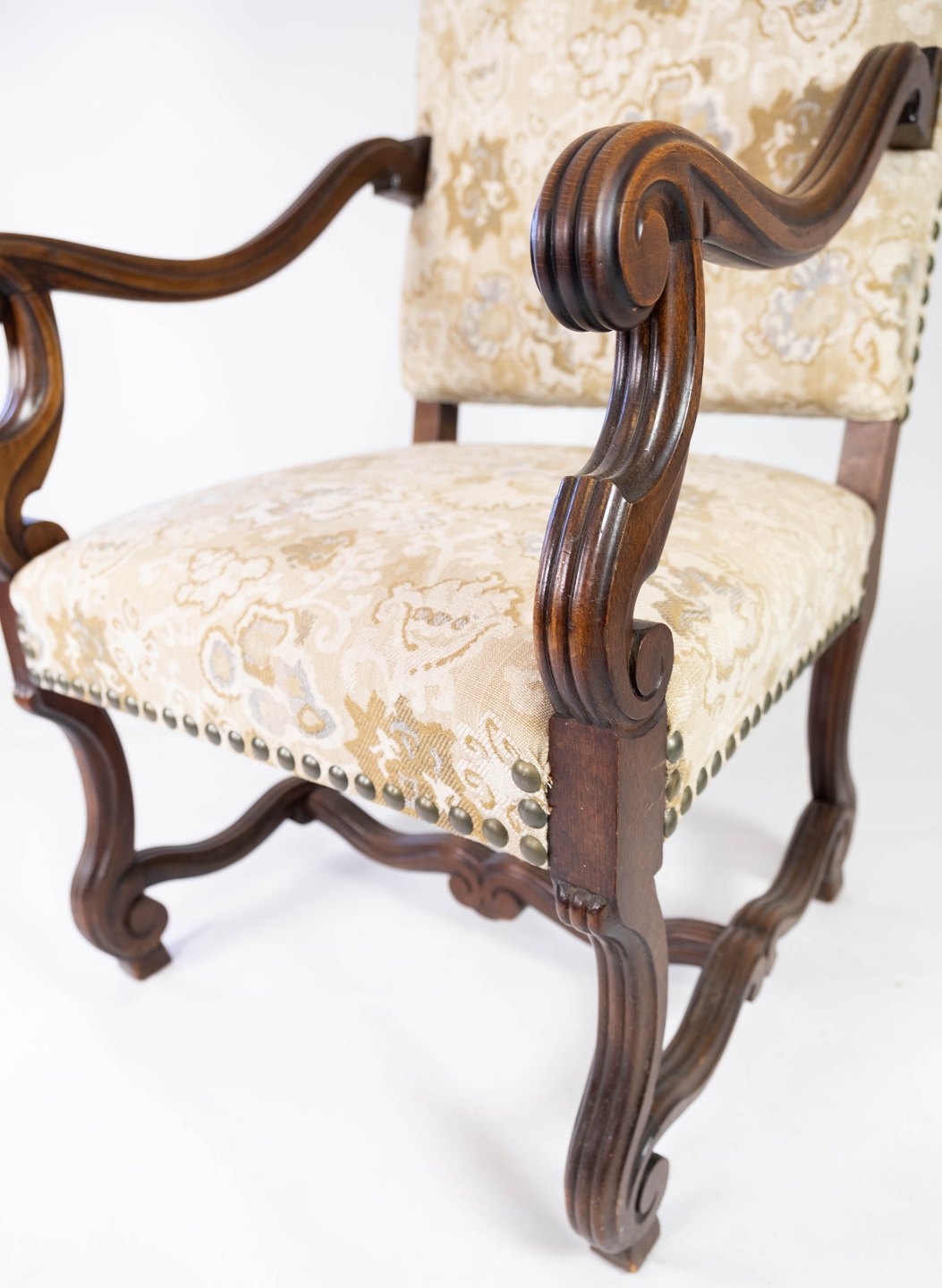Armstol af mørk eg og polstret med lyst stof, i flot antik stand fra 1910.