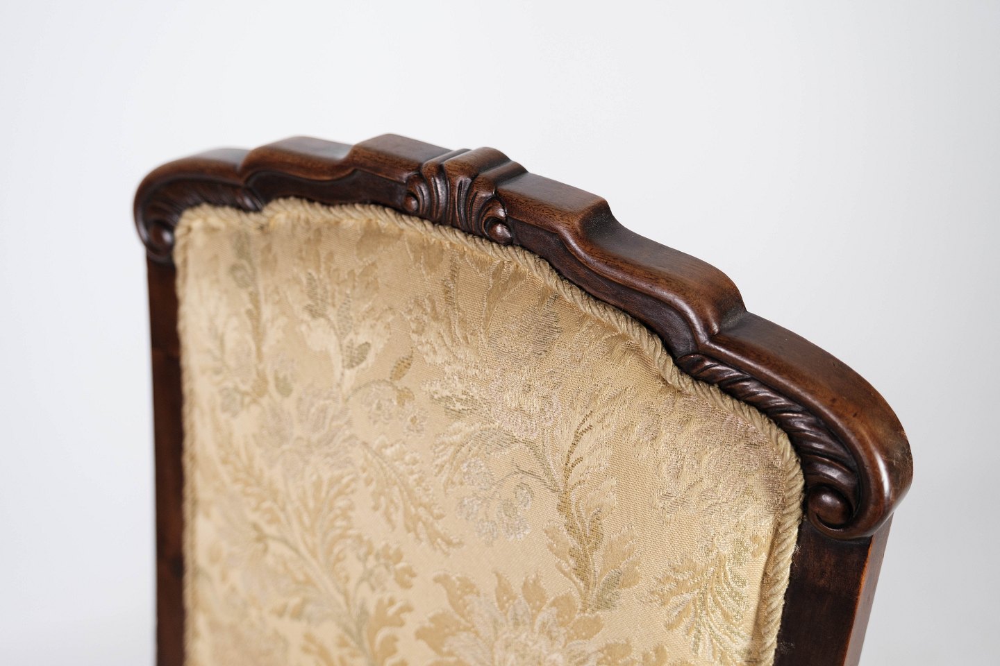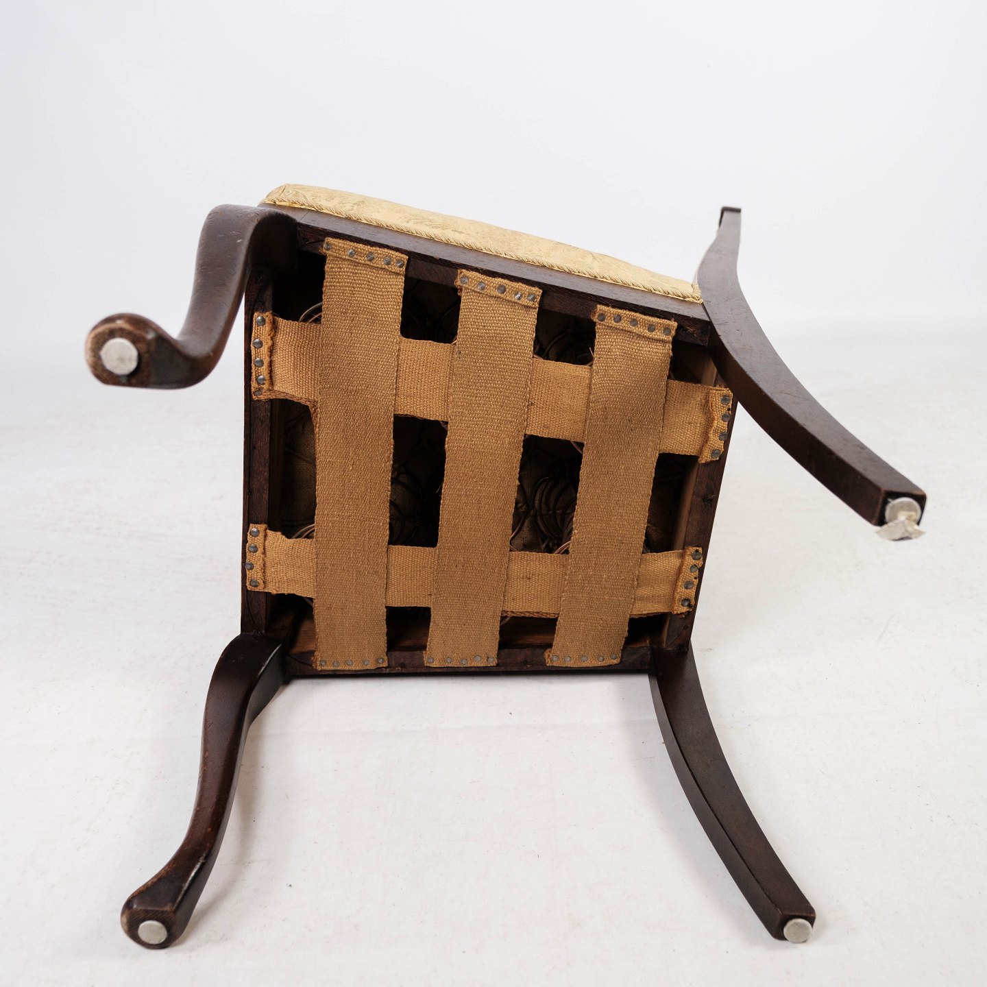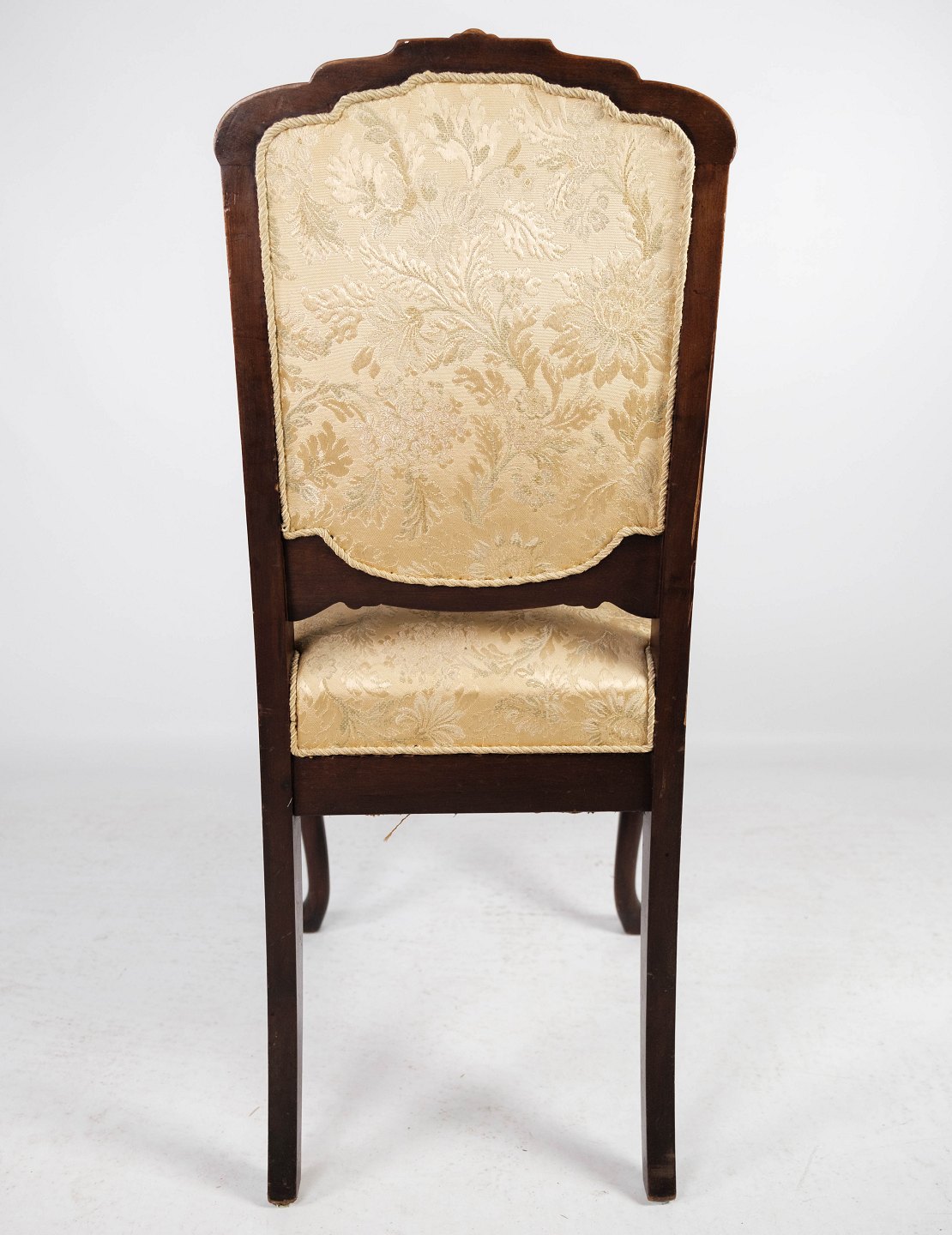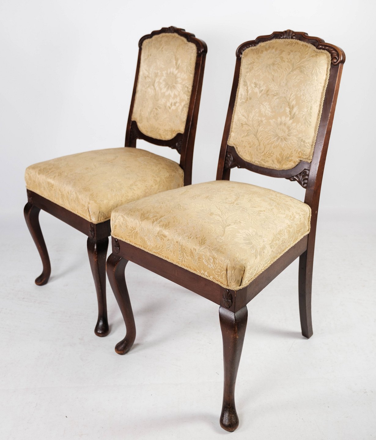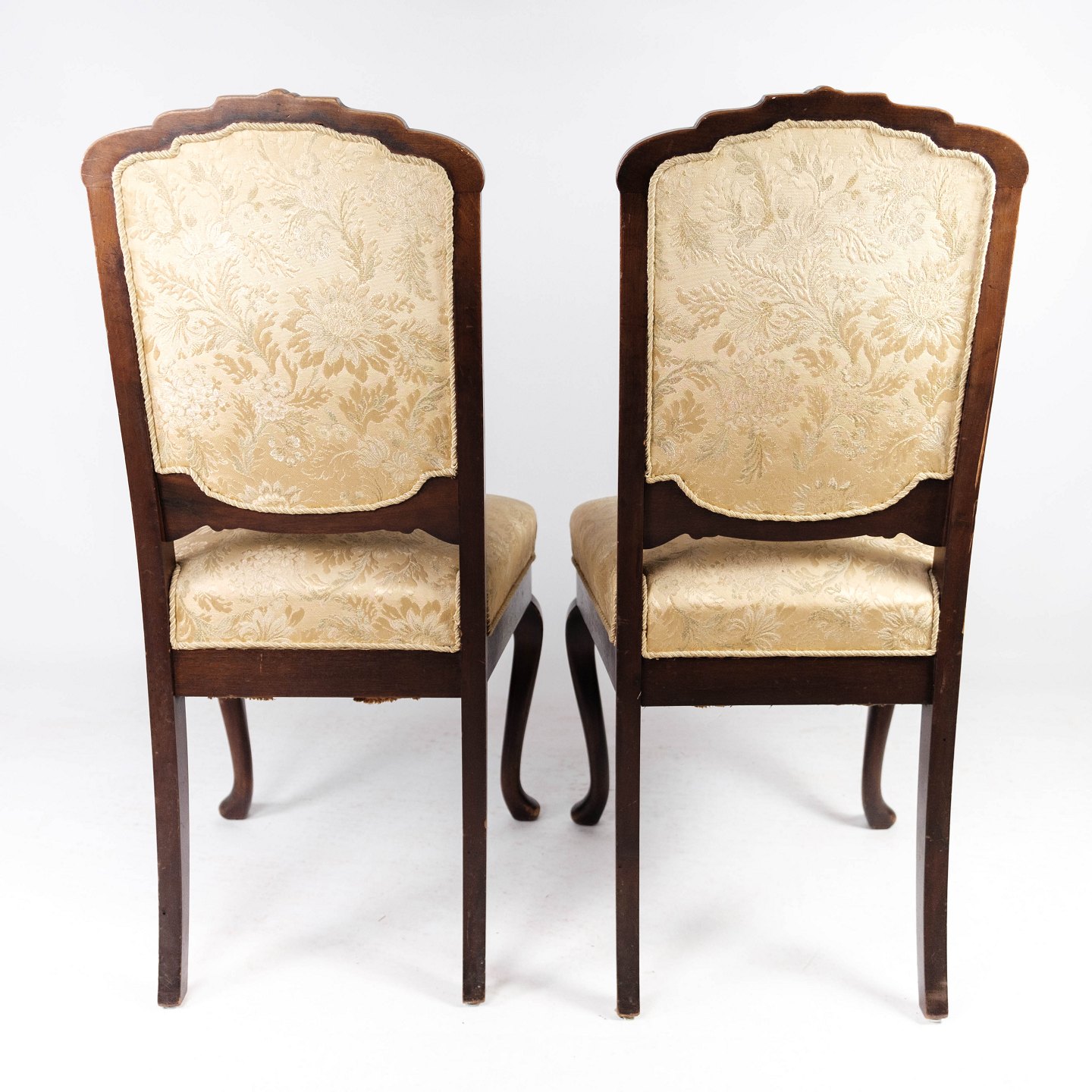 Set of dining room chairs of oak and upholstered with light fabric, in great antique condition from the 1930s.