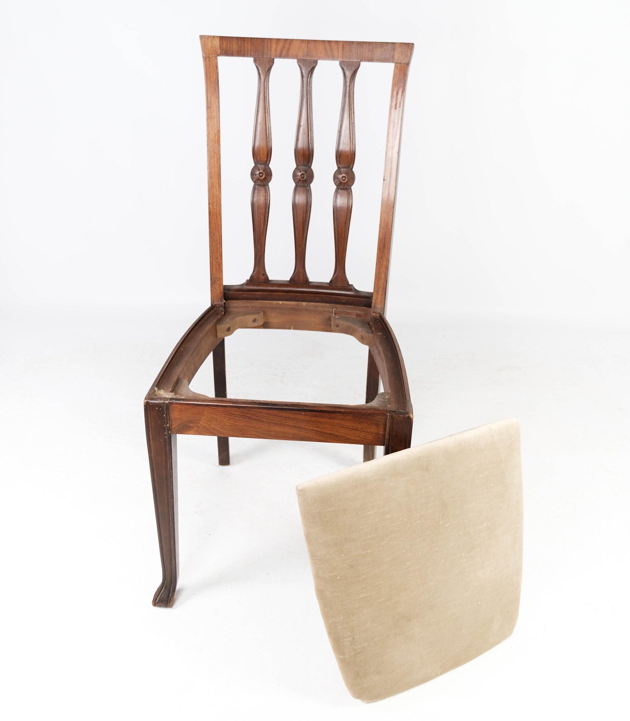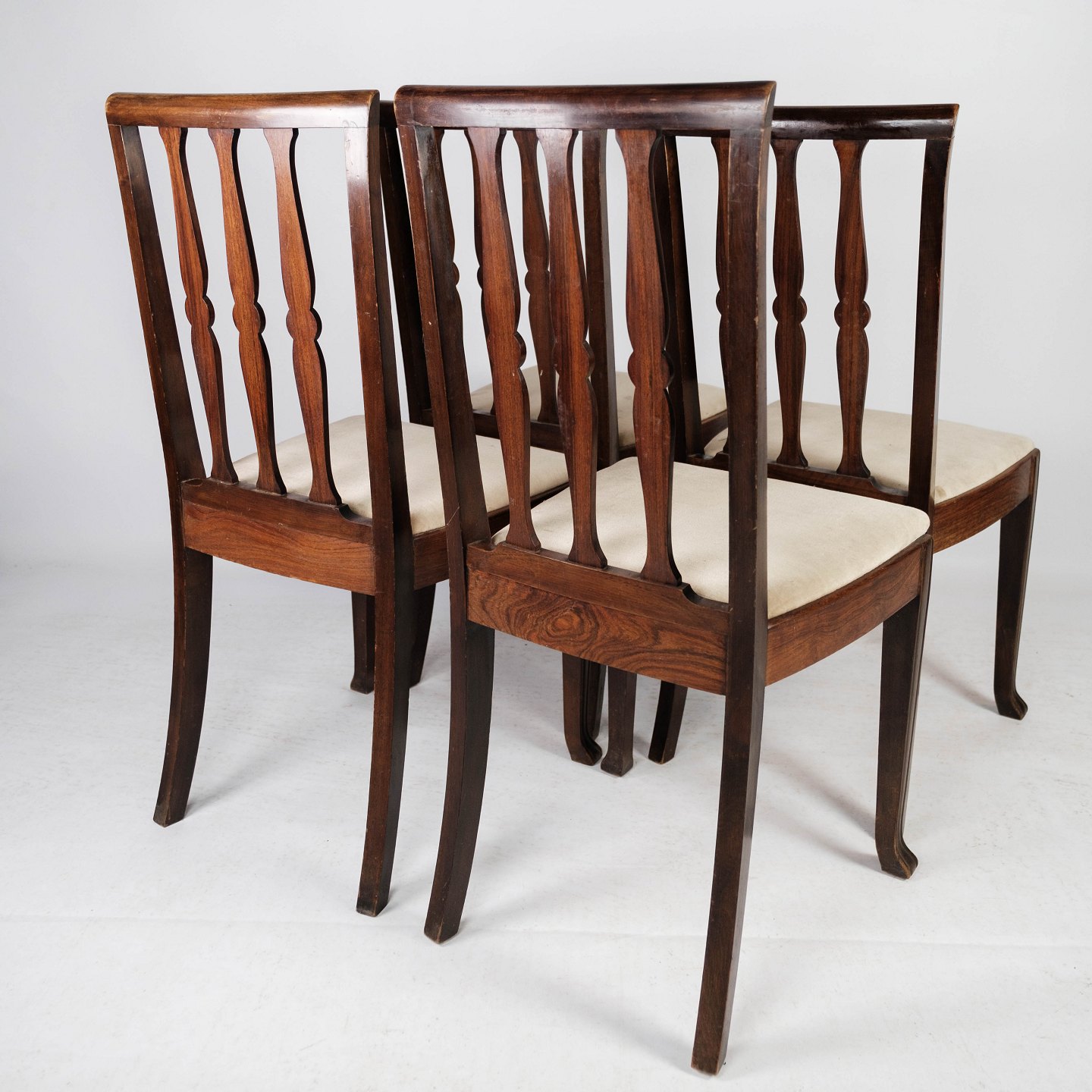 Set of four dining room chairs in rosewood and upholstered with light fabric, in great antique condition from the 1920s.
