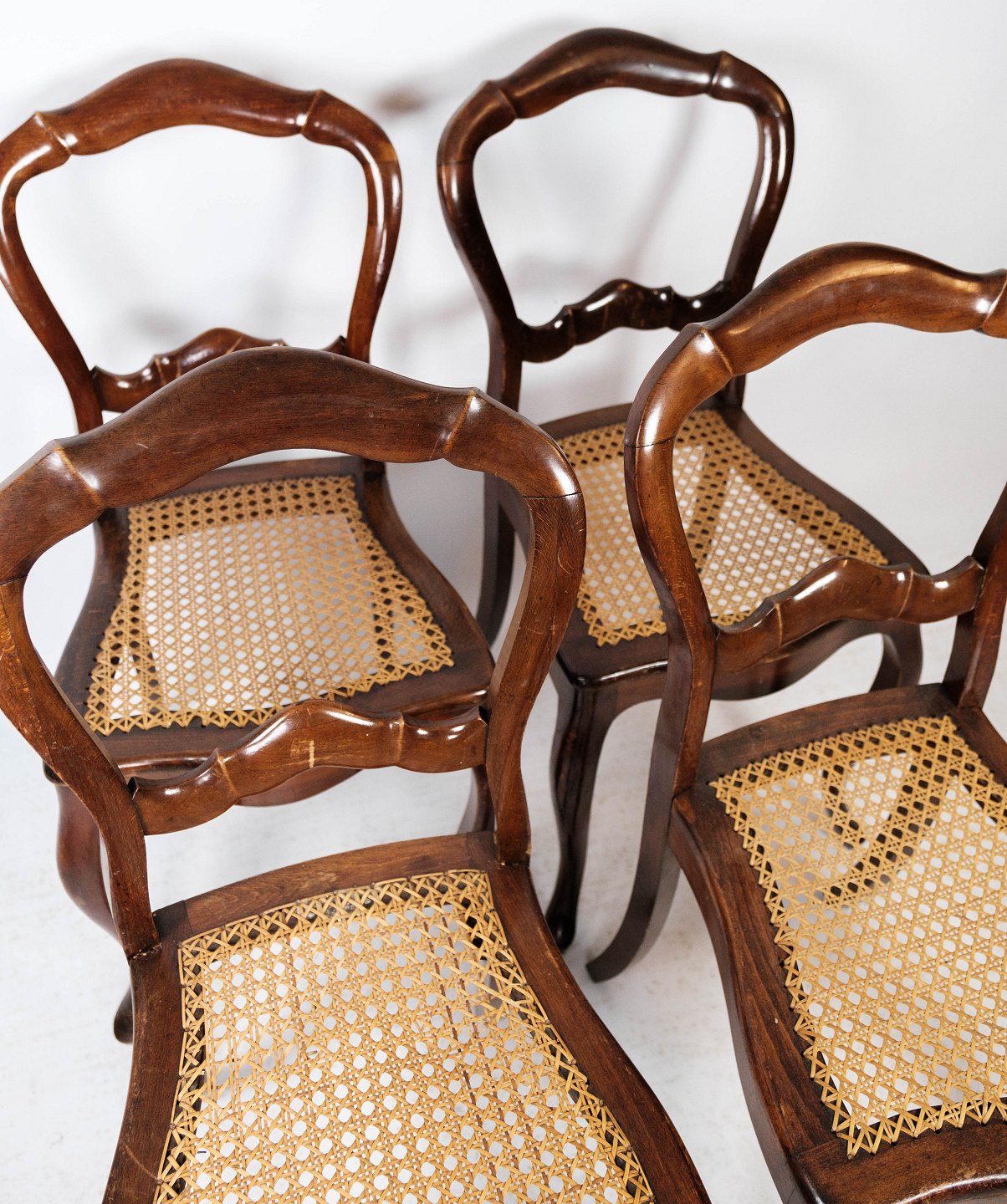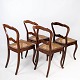 Sæt af fire rokoko spisestuestole af mahogni og med sæde af fransk rørflet fra 1860.