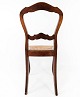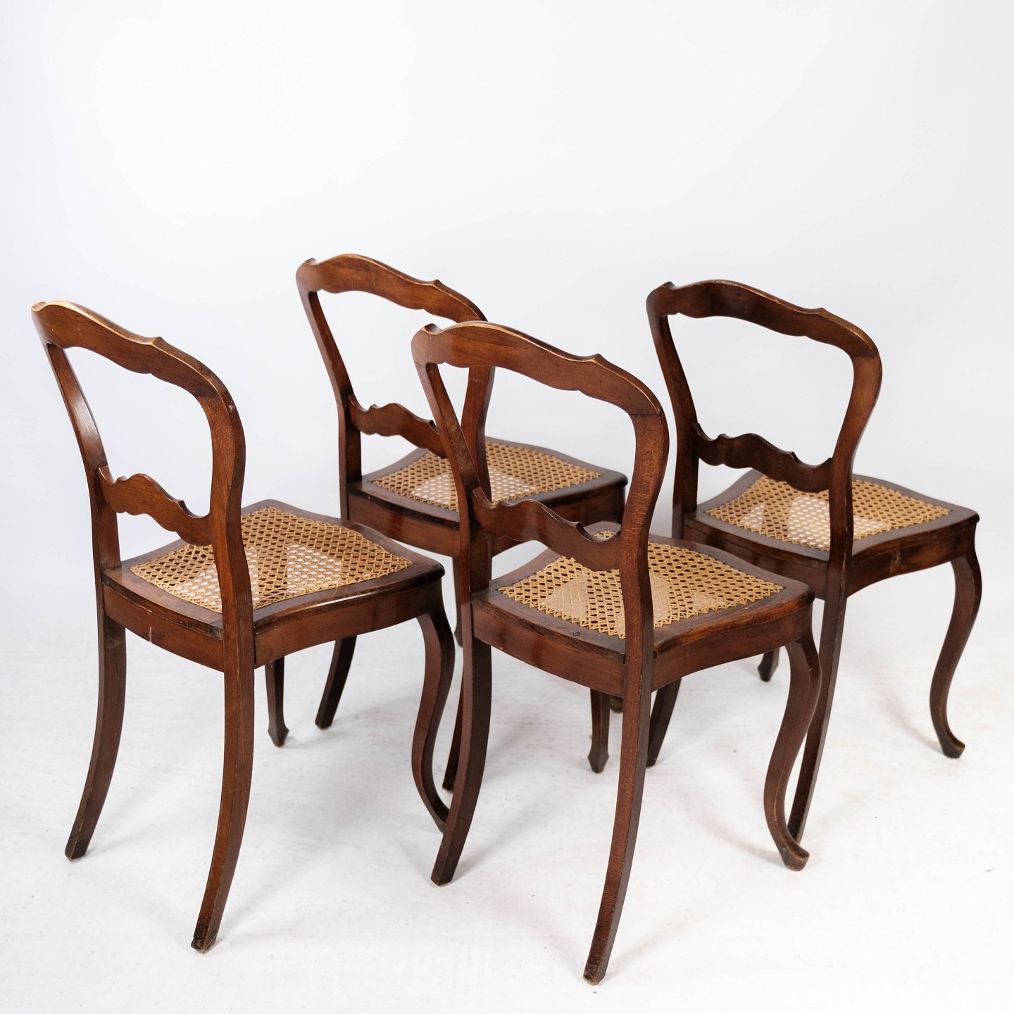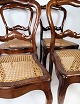 Sæt af fire rokoko spisestuestole af mahogni og med sæde af fransk rørflet fra 1860. Stolene er i flot antik stand.
