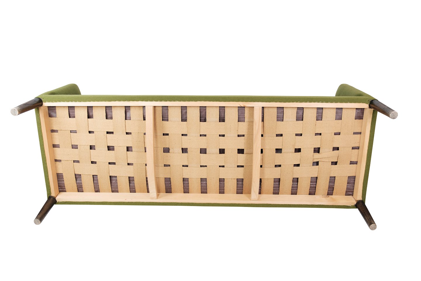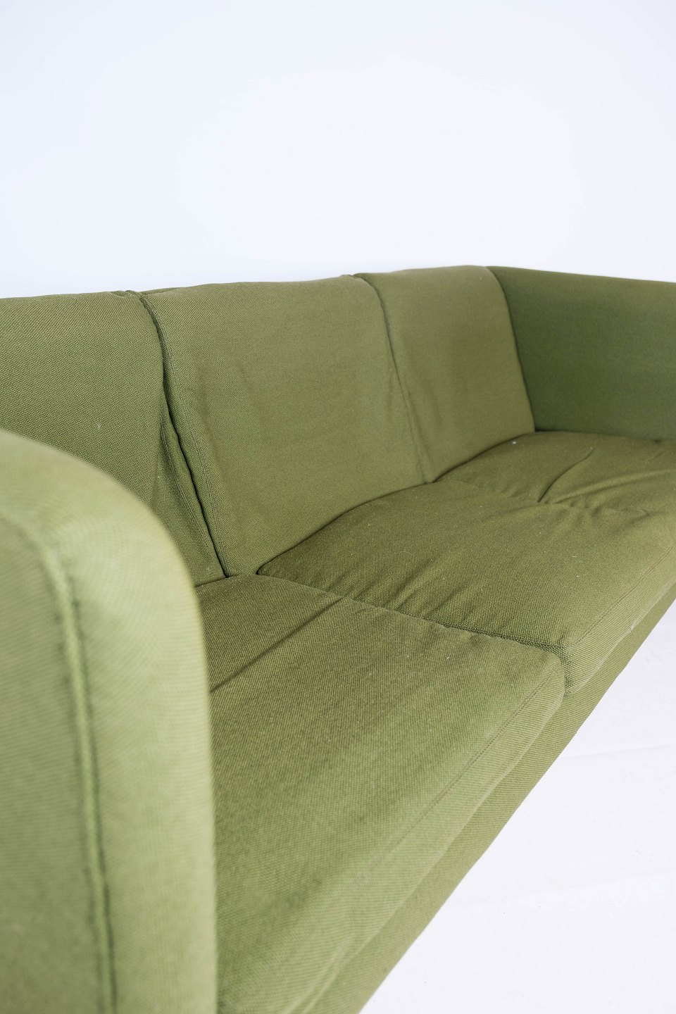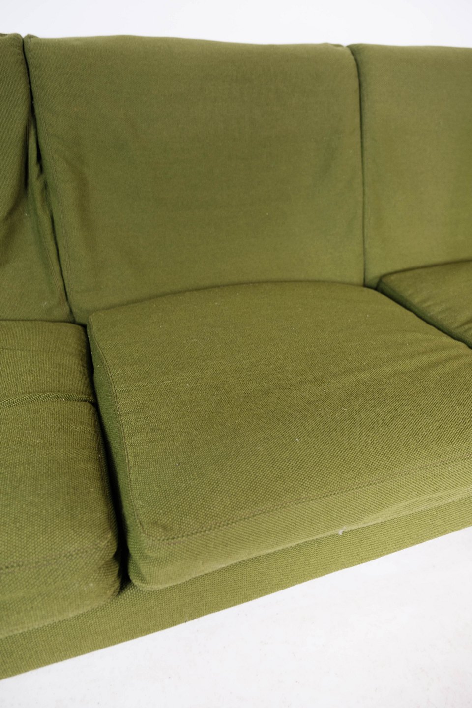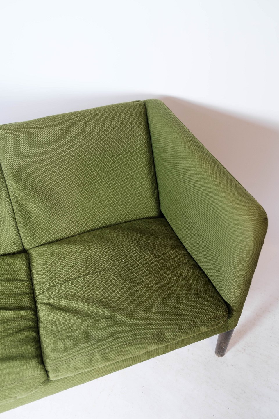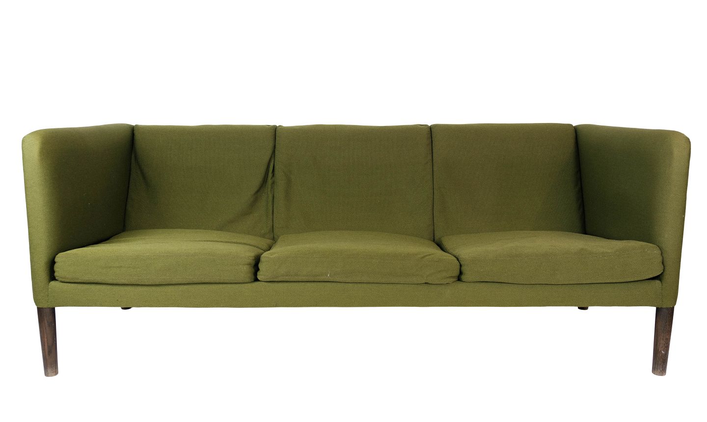 Tre personers sofa, Model AP 18S, polstret med grønt uldstof og ben af mørkt træ, designet af Hans J. Wegner fra 1960erne.