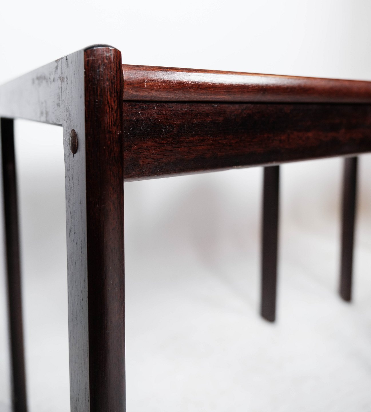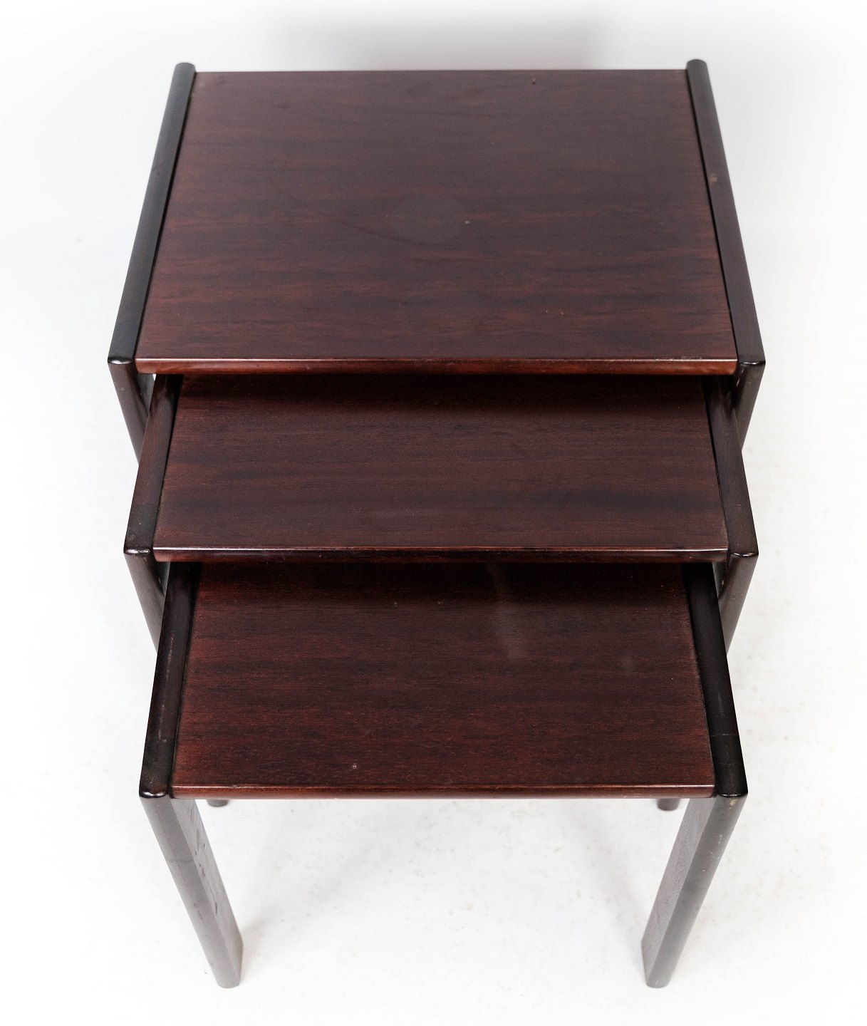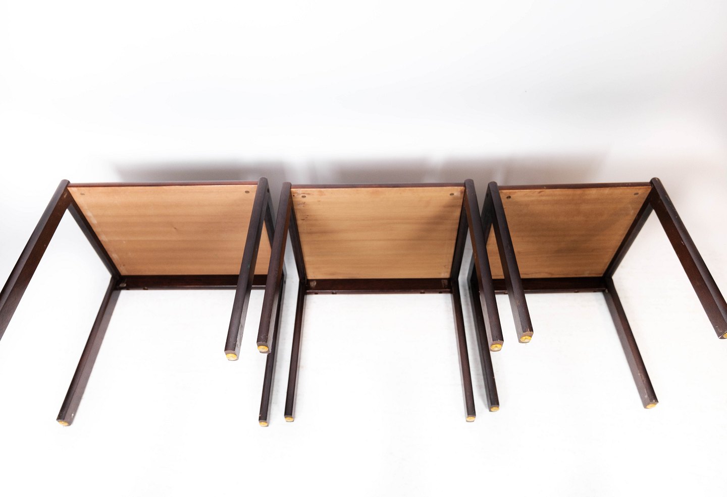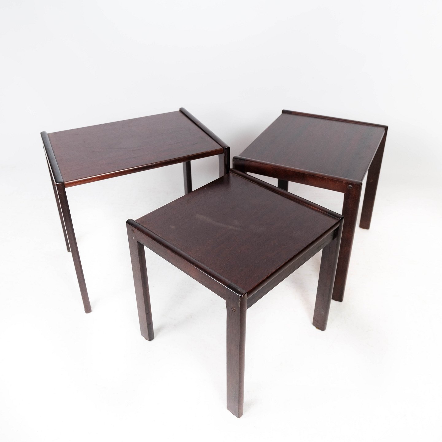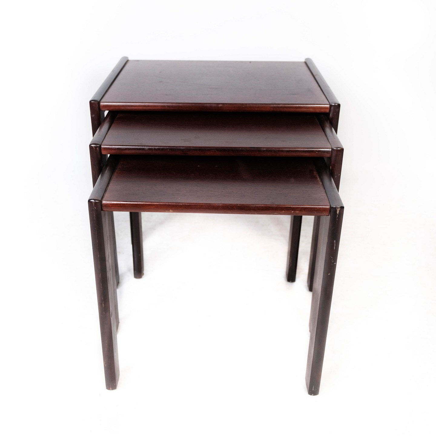 Dette sæt indskudsborde er et elegant eksempel på dansk design fra 1960'erne, skabt med et smukt mørkt træ, der udstråler en tidløs elegance.