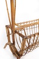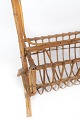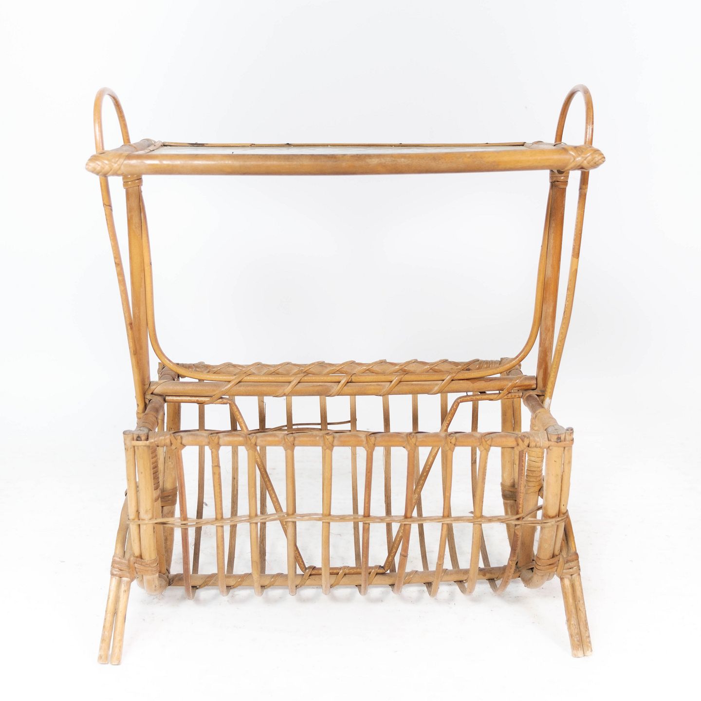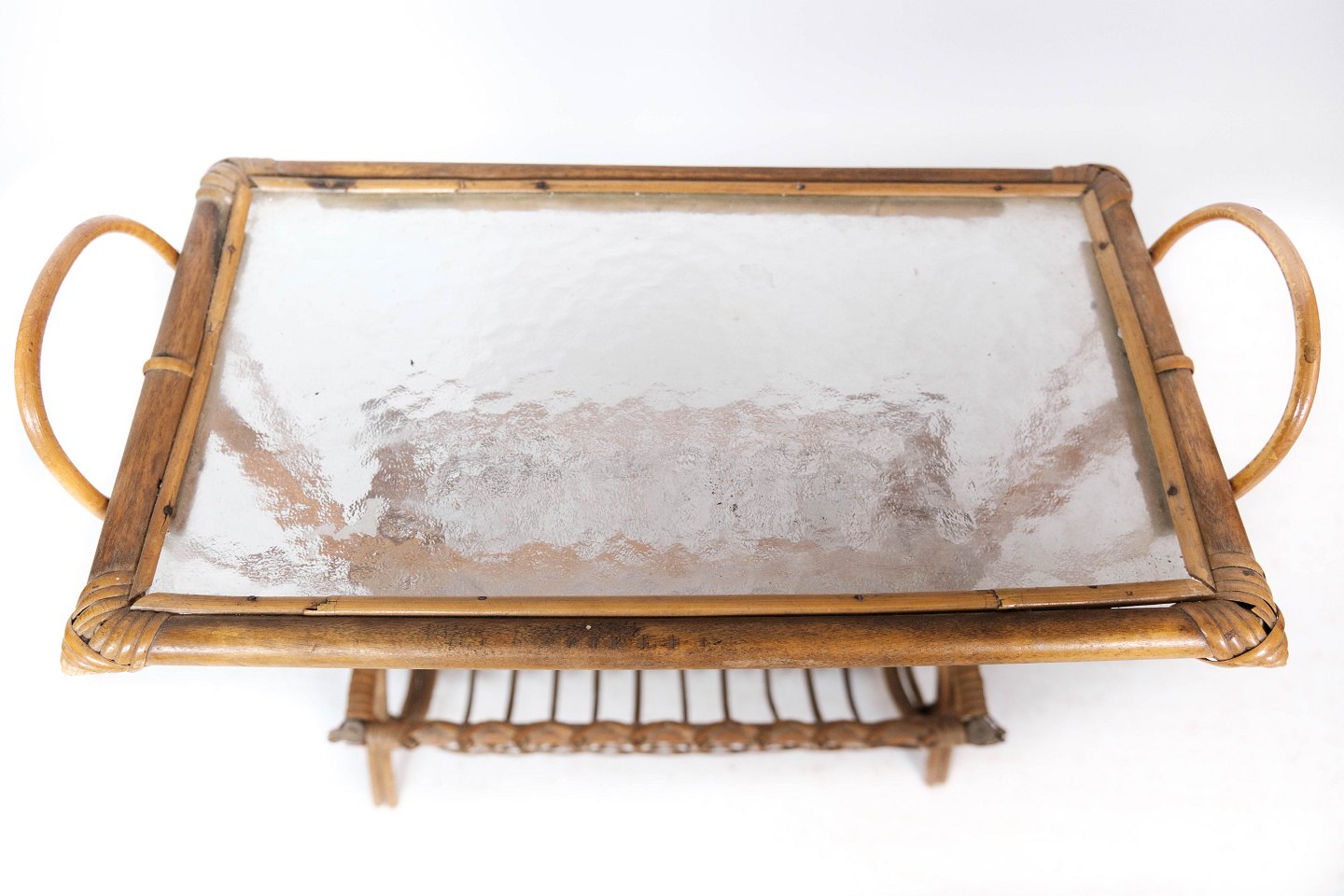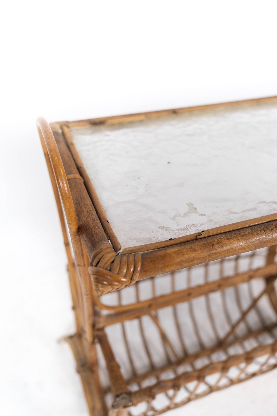 Sidebord af lyst træ med glasplade og opbevaring under, i flot brugt stand.