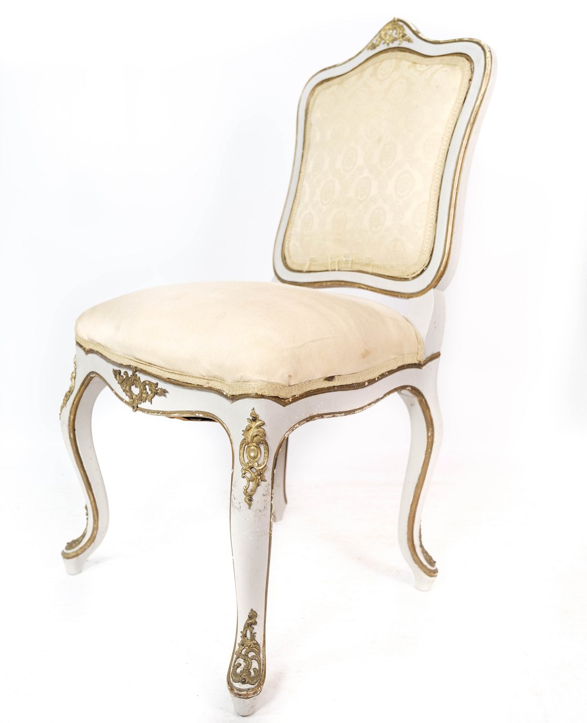 Dining chair of white painted wood and upholstered with light fabric, in great antique condition from around 1880.