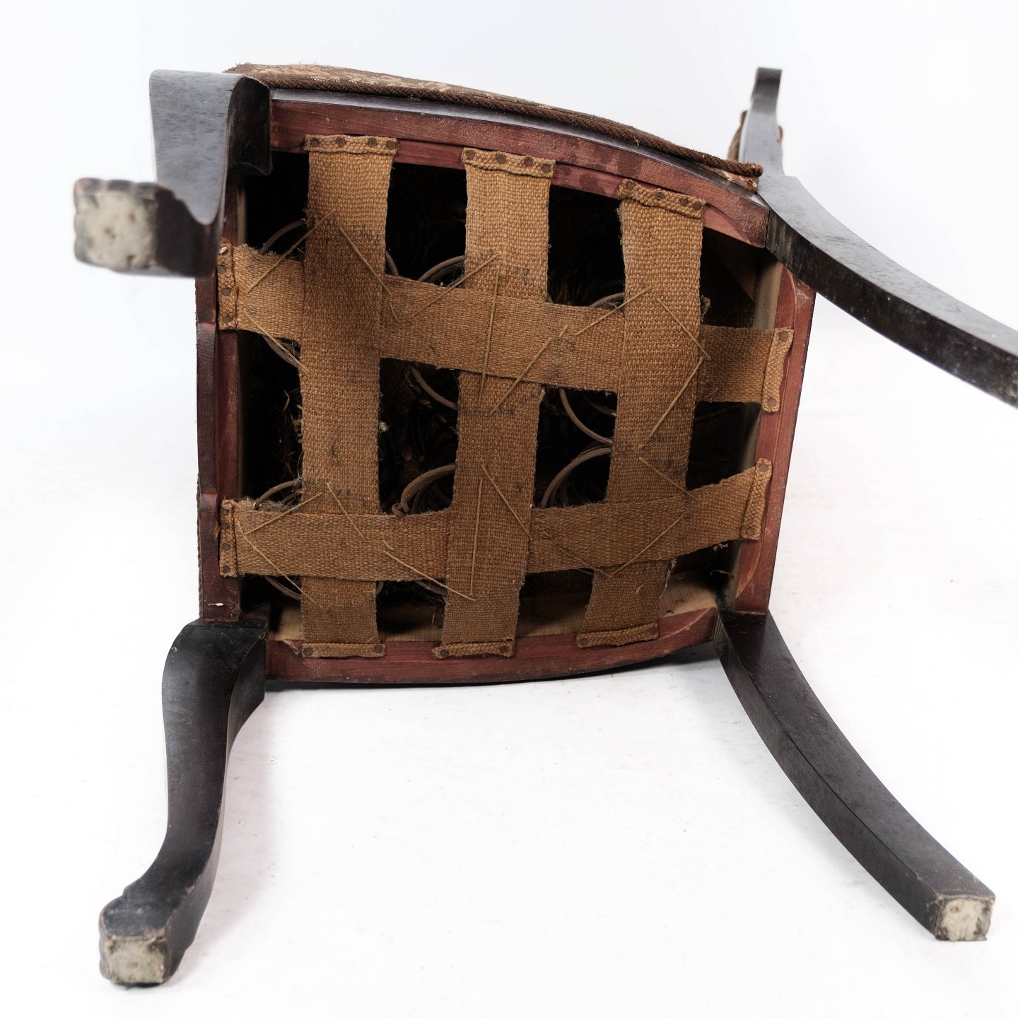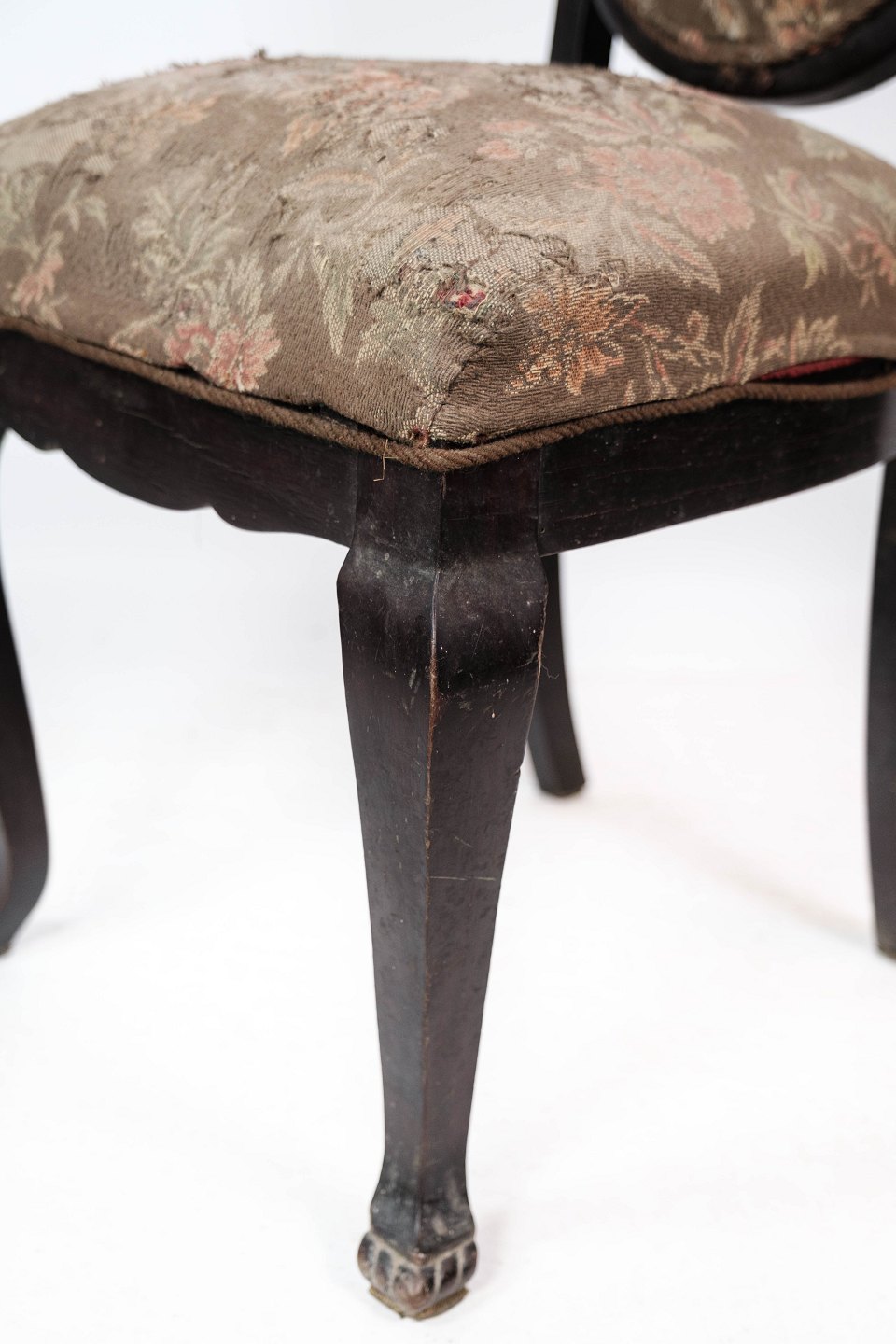 Spisestuestol af mahogni og polstret med blomstret stof, i flot antik stand.
