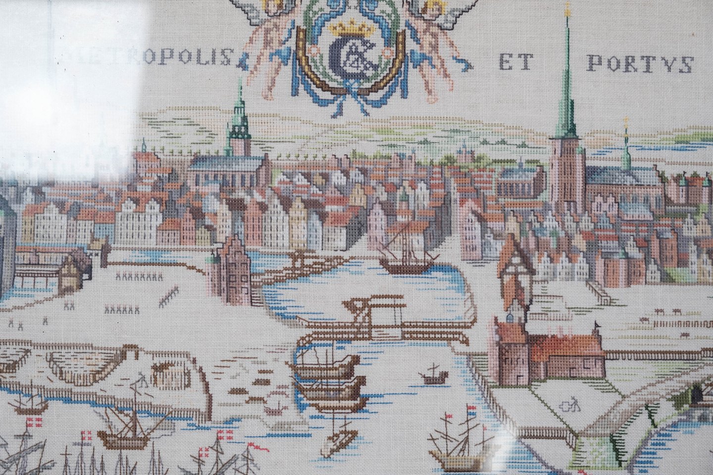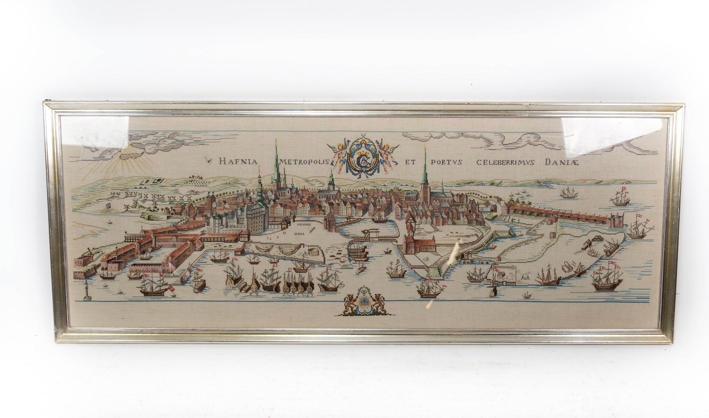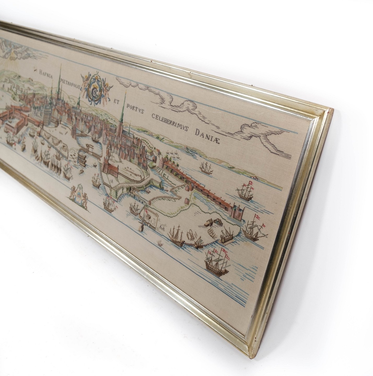 Stort broderi med sølv farvet ramme, fra omkring 1940.