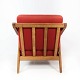 Armstol i eg og polstret med rødt stof, designet af H. Brockmann Pedersen fra 1960erne.