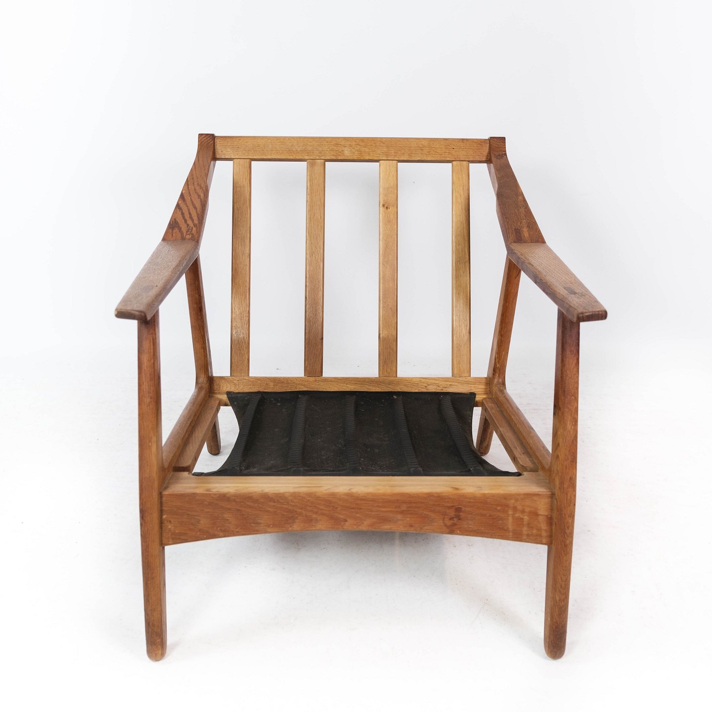 Armstol i eg og polstret med rødt stof, designet af H. Brockmann Pedersen fra 1960erne.Stolen er i flot brugt stand.
