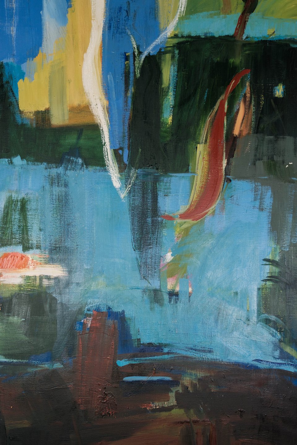 Højt oliemaleri på lærred i mørke farver af den dansk kunster Åse Højer, f. 1952.