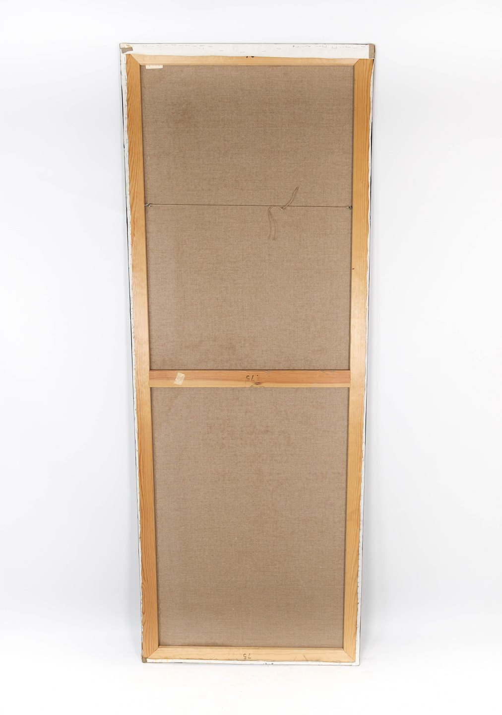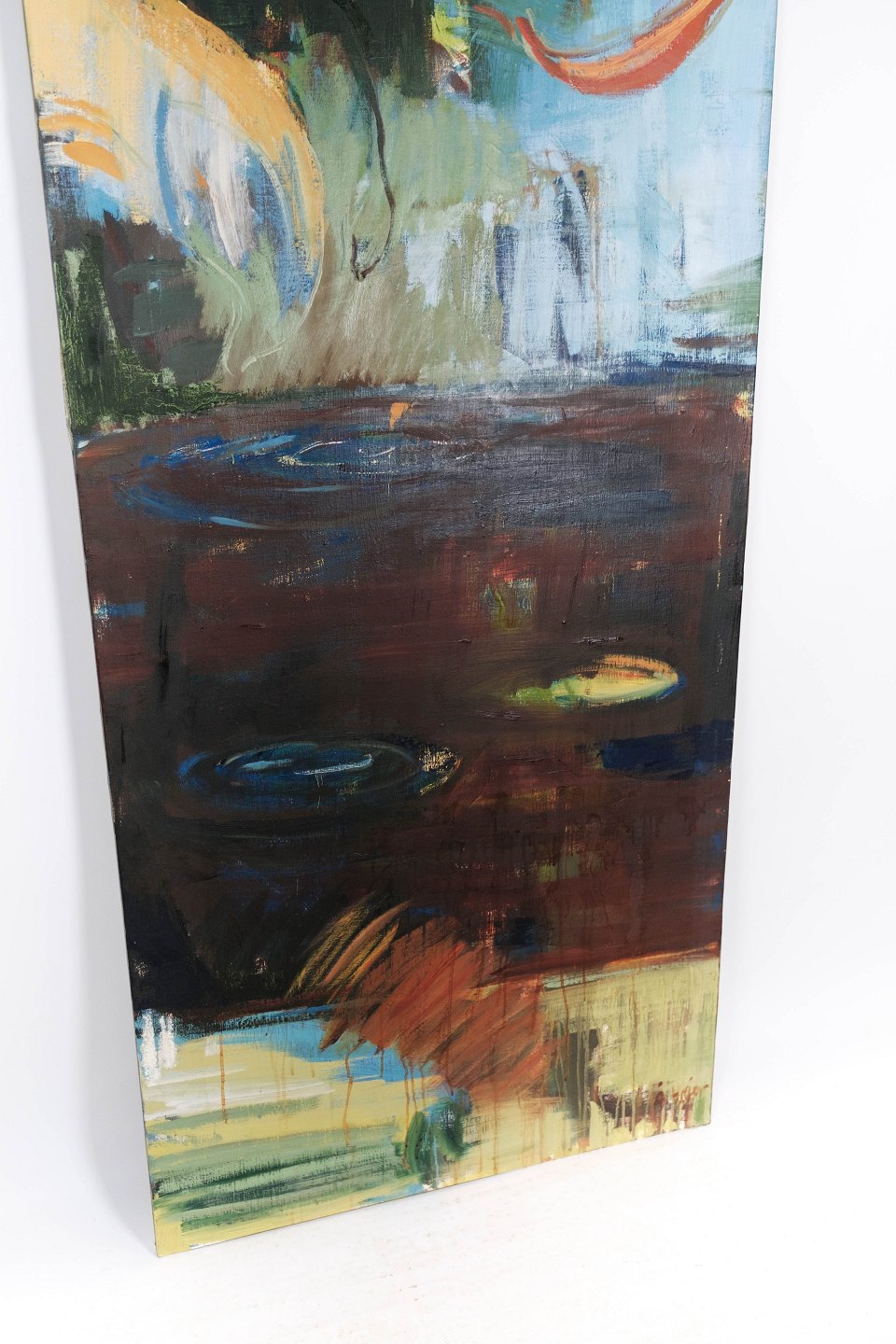 Tall oil painting on canvas in dark colors by the danish artist Åse Højer, b. 1952.