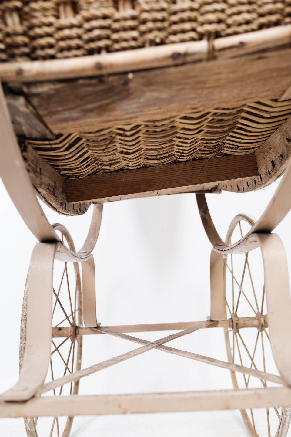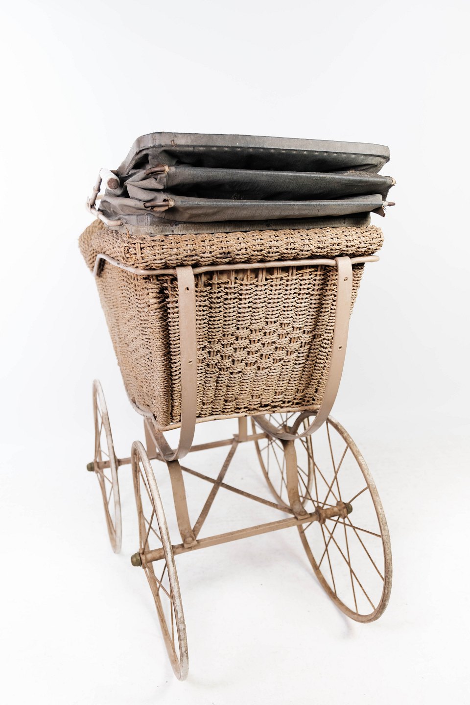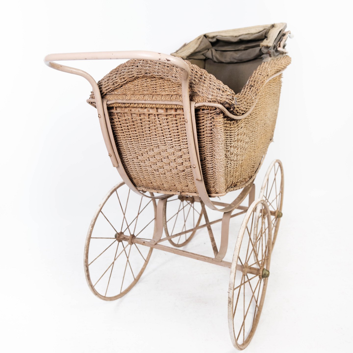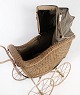 Antik barnevogn af flet med kaleche og metal hjul, fra omkring 1930erne.