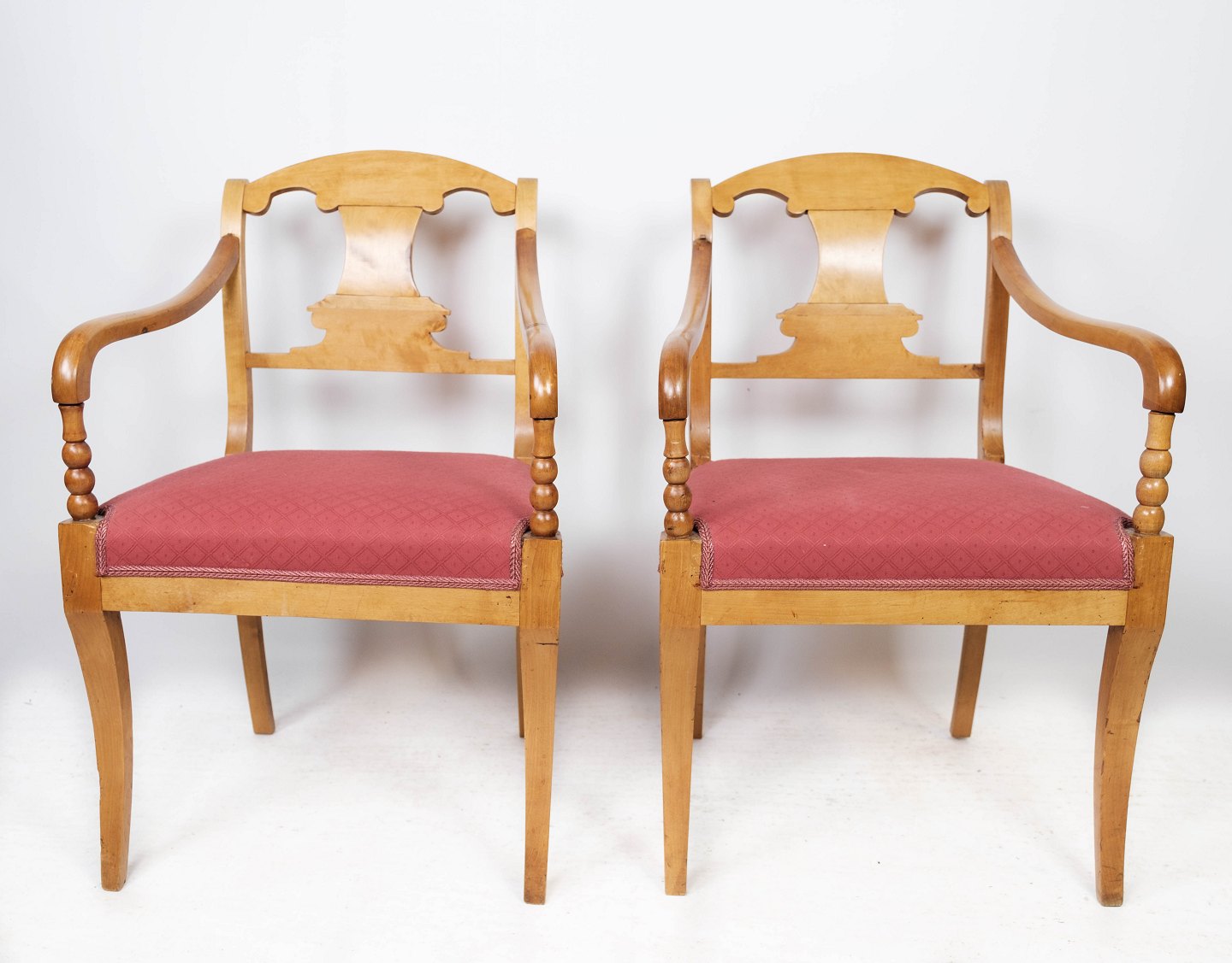 Et par sen Empire armstole af birketræ og polstret med velour, fra omkring 1840erne.