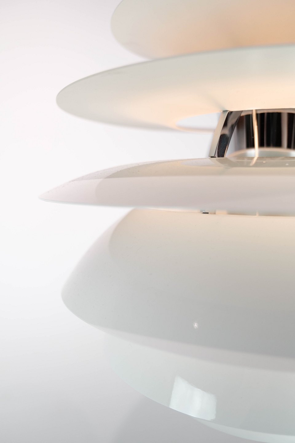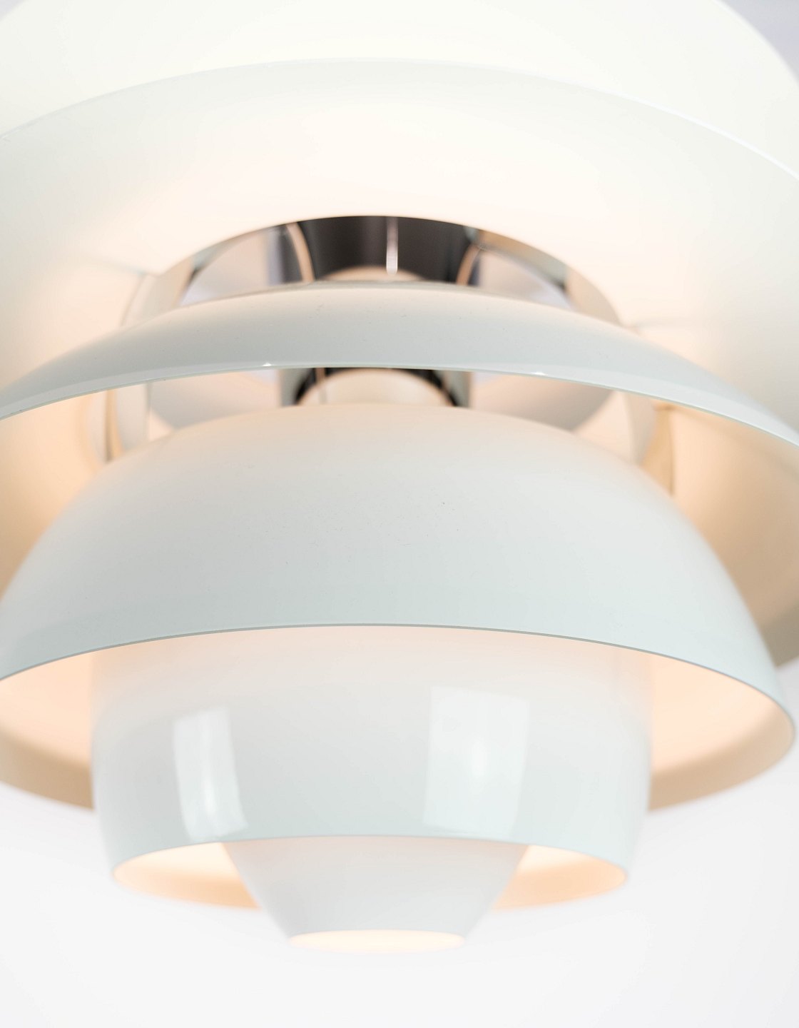 PH kuglelamel også kaldet Snowball i højglans hvid designet af Poul Henningsen og fremstillet af Louis Poulsen. Lampen er i flot brugt stand.
