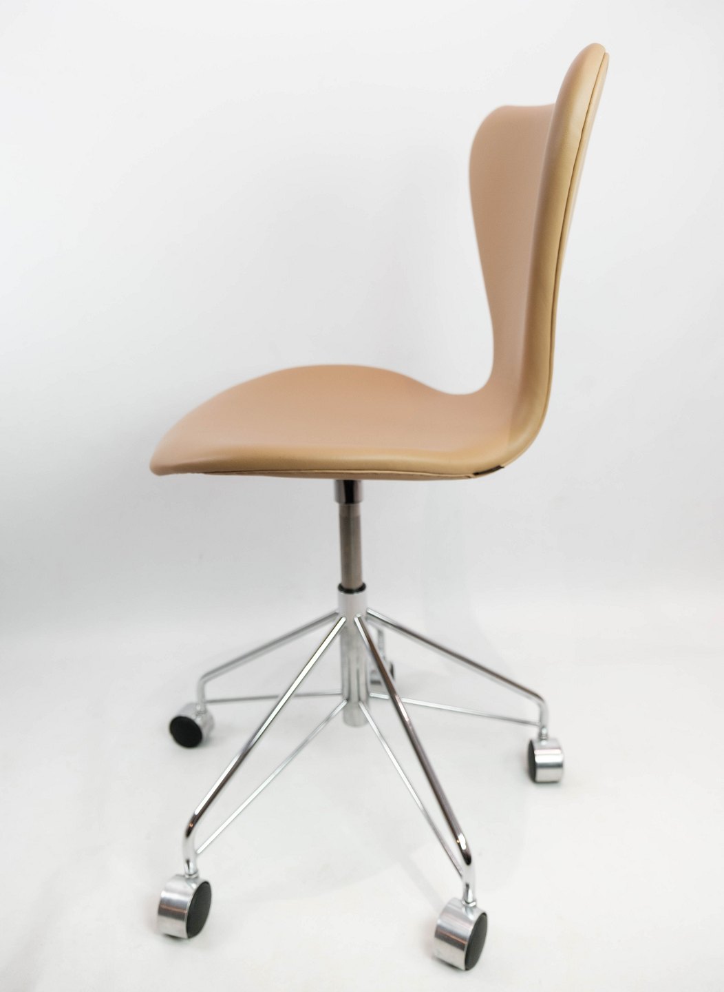 Series Seven office chair, model 3117, without armrests and swivel function with original upholstery in light natural leather designed by Arne Jacobsen in the 1950s and manufactured by Fritz Hansen. The chair is in great vintage condition.