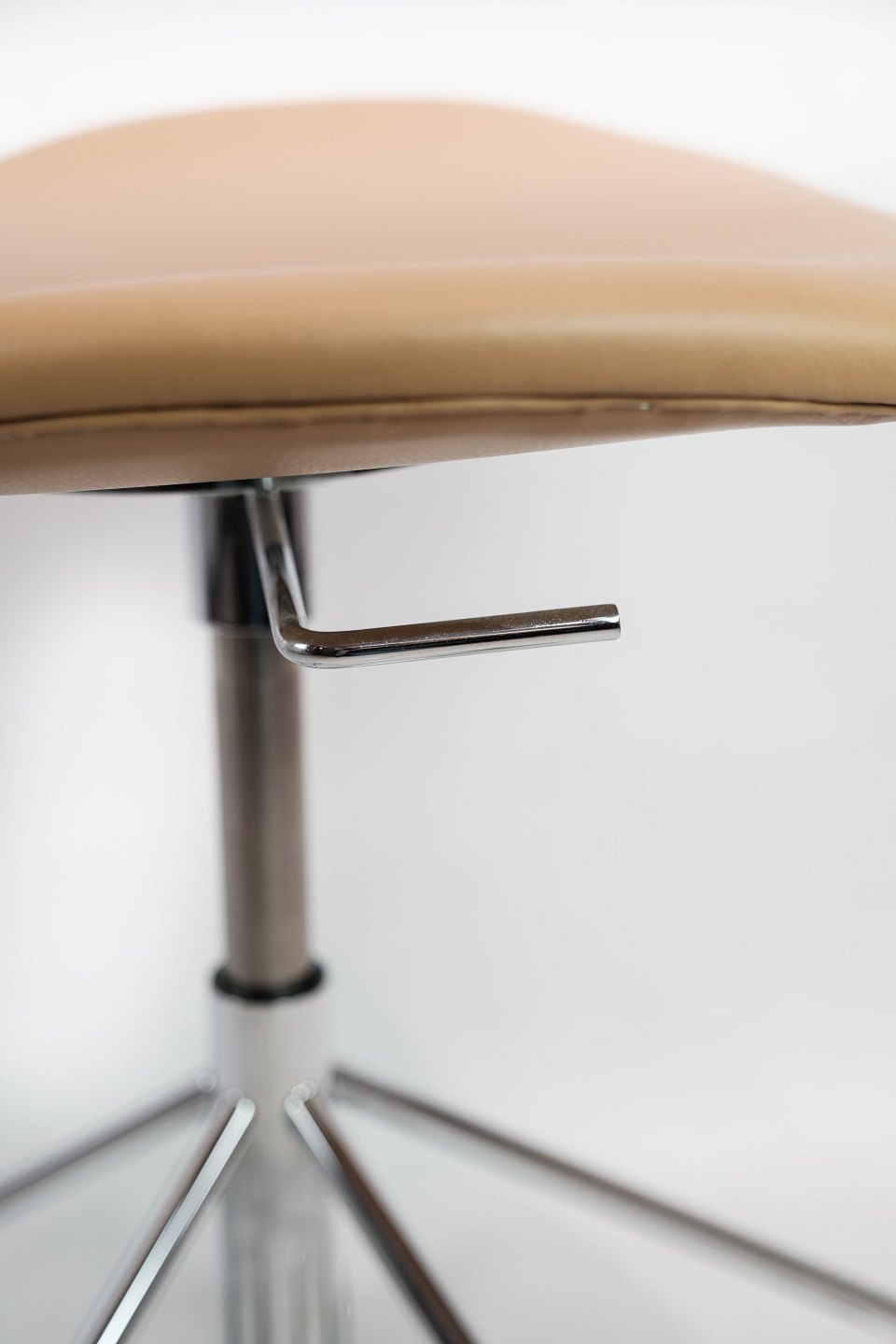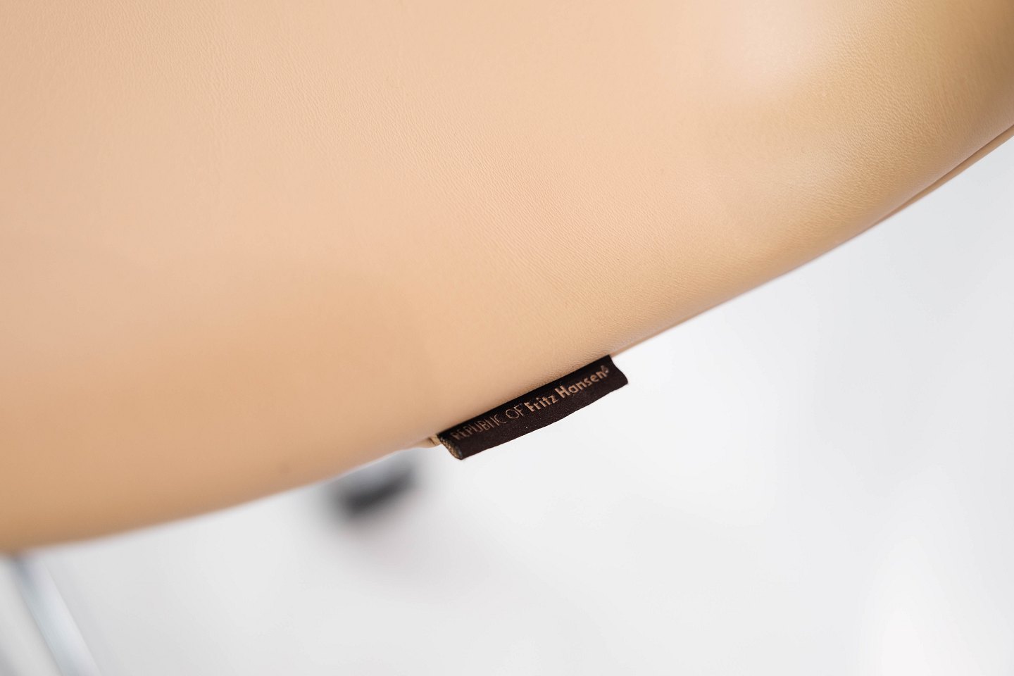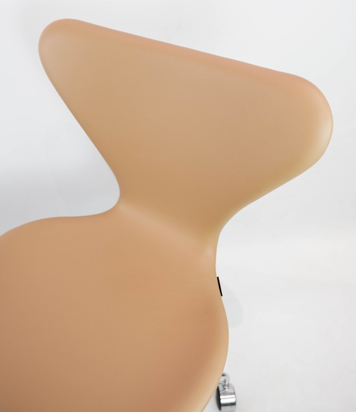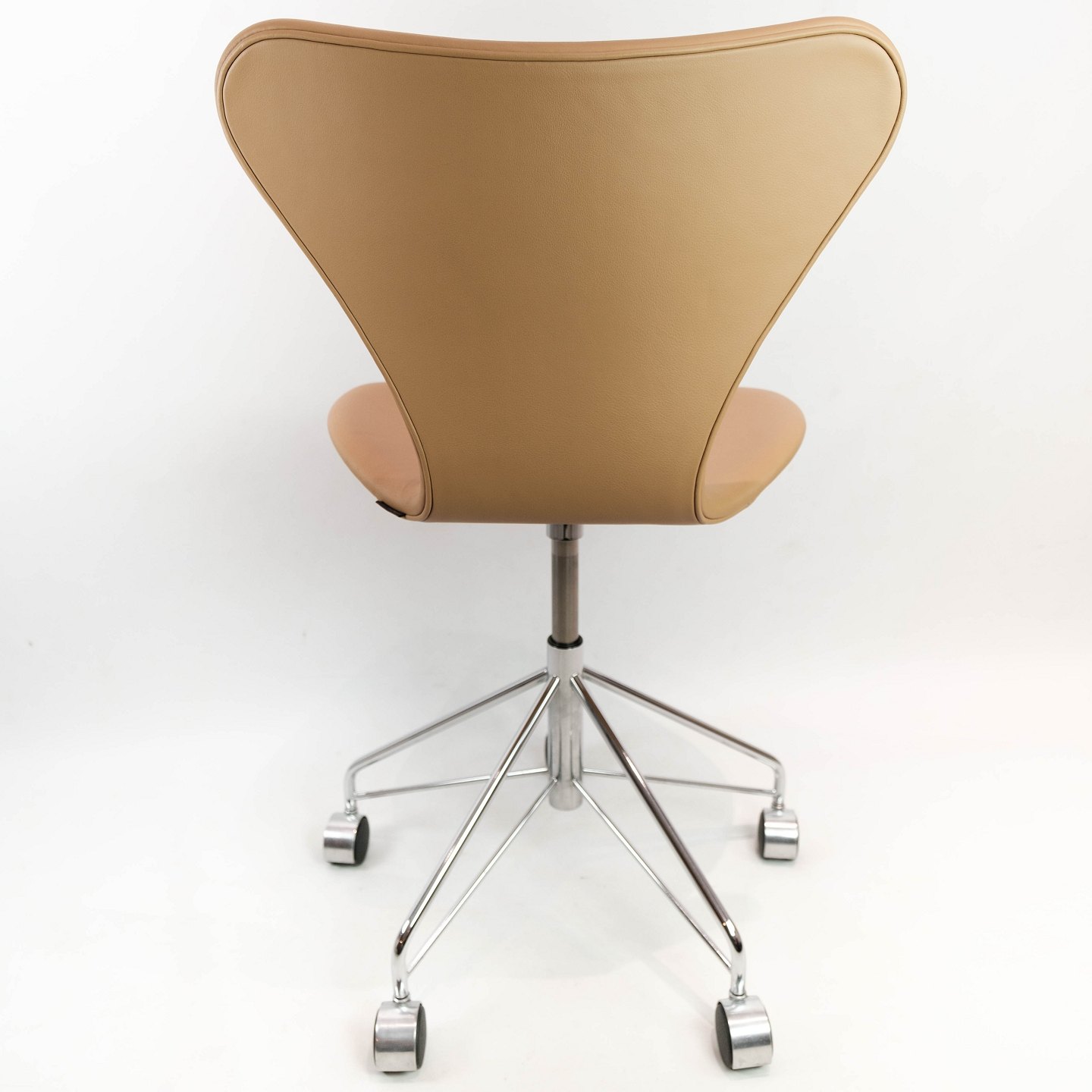 Series seven office chair, model 3117, without armrests and swivel function with original upholstery in light natural leather designed by Arne Jacobsen in the 1950s and manufactured by Fritz Hansen.
