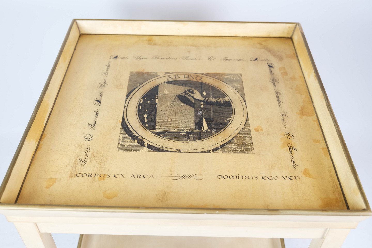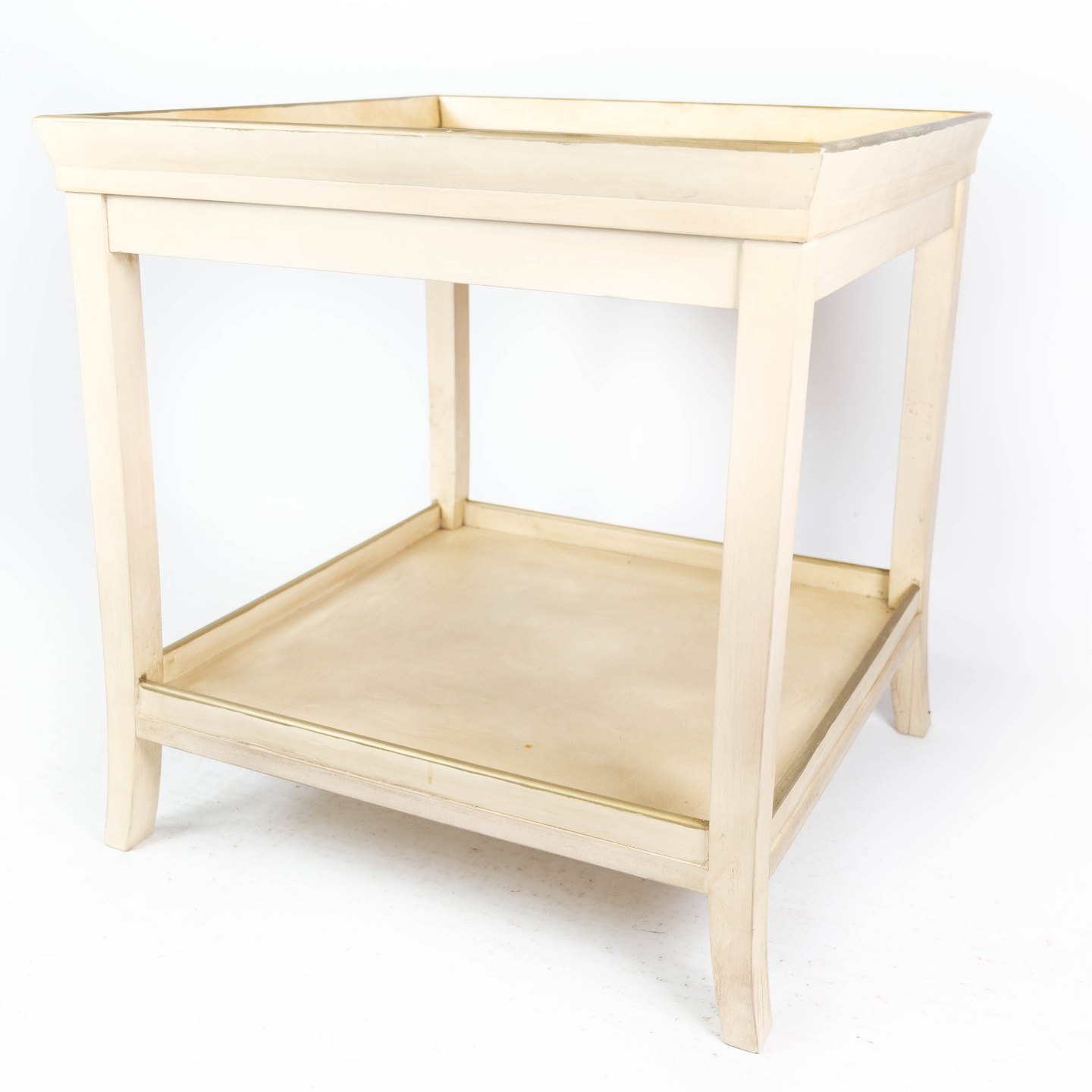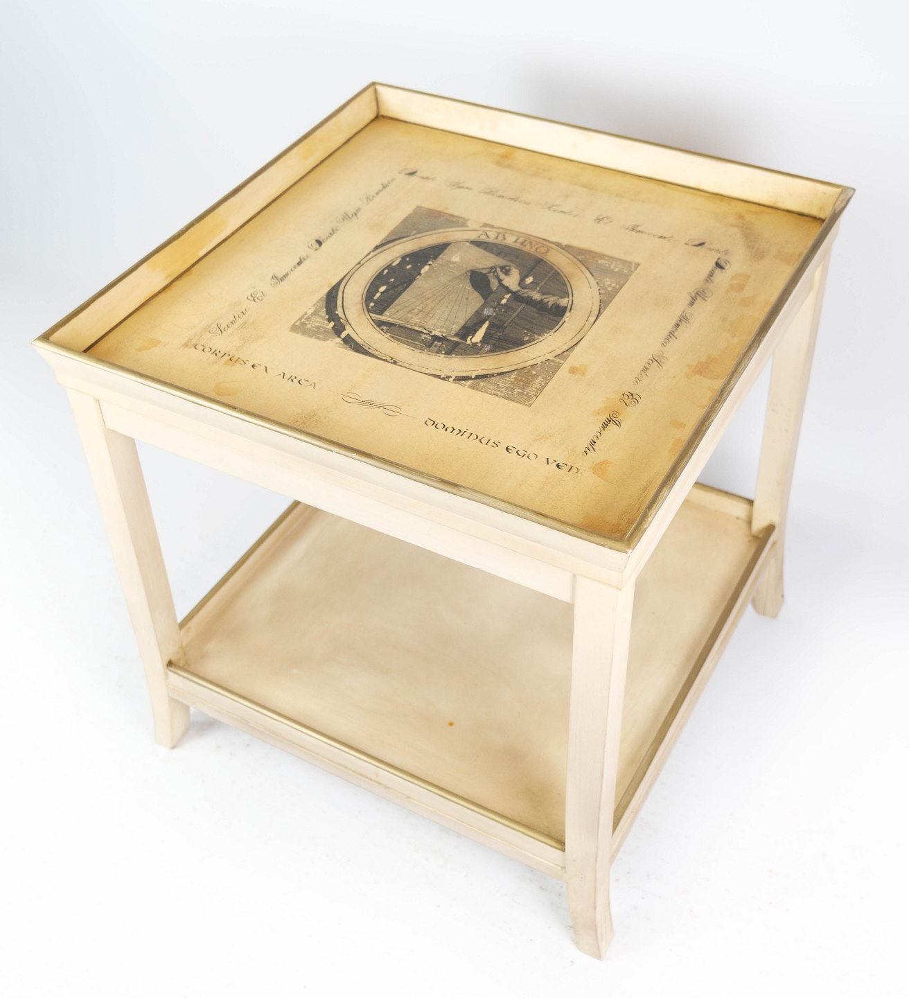 Antikt sidebord af hvid malet træ og dekoreret med tryk.