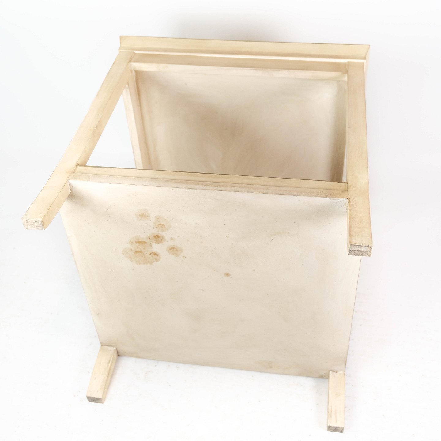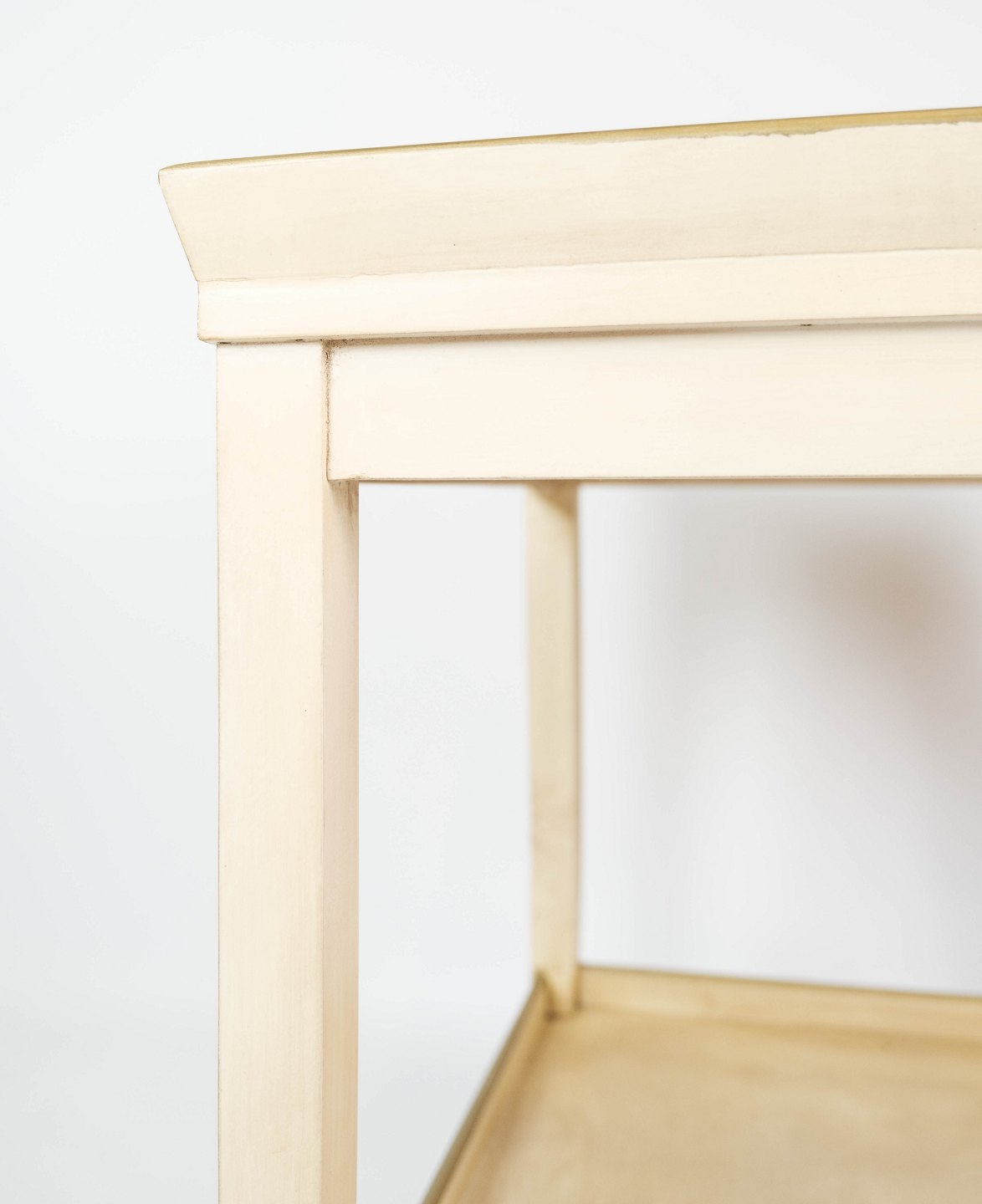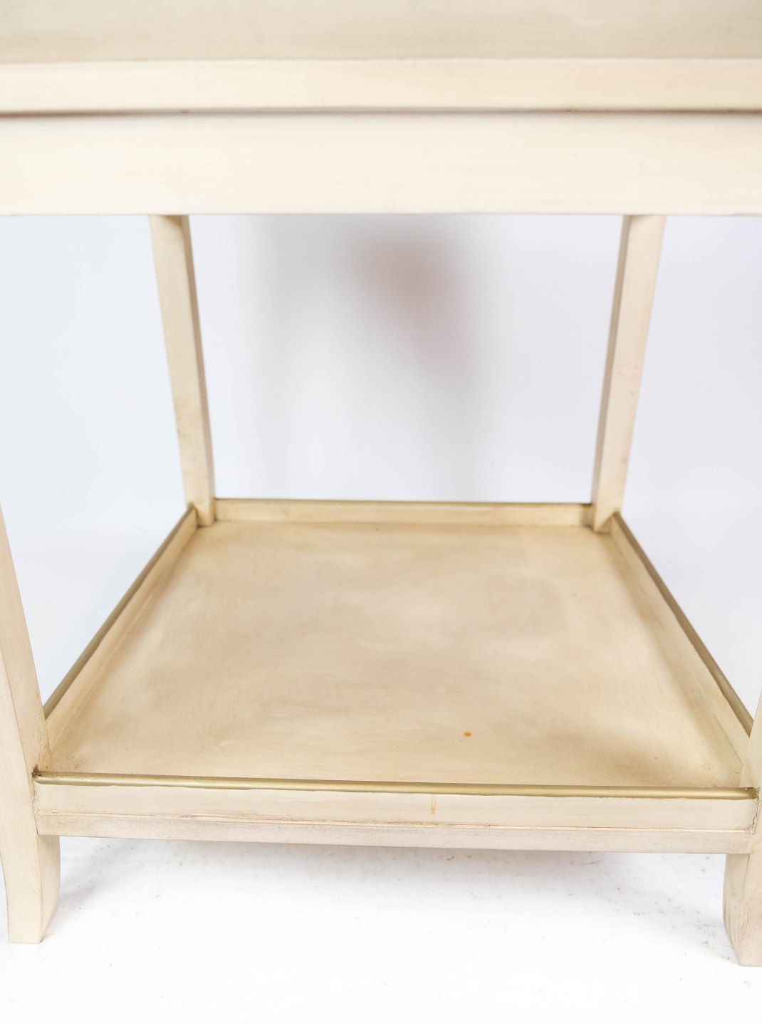 Antikt sidebord af hvid malet træ og dekoreret med tryk.