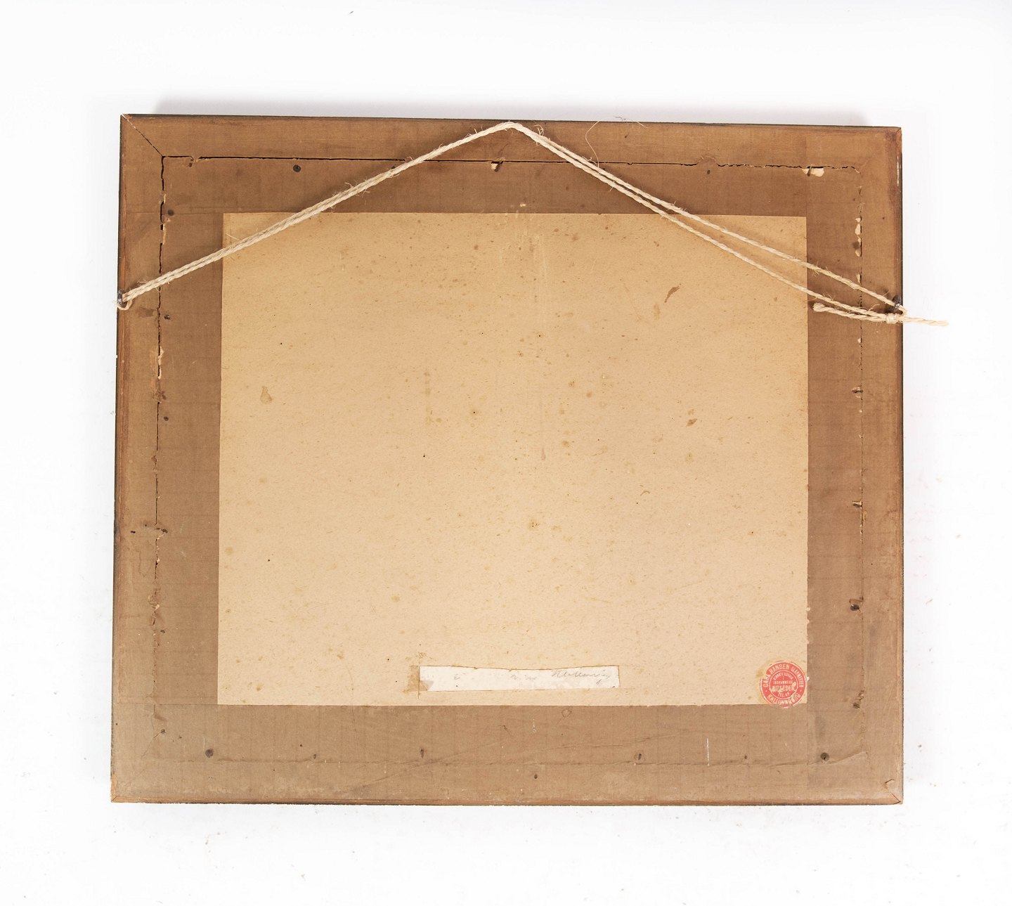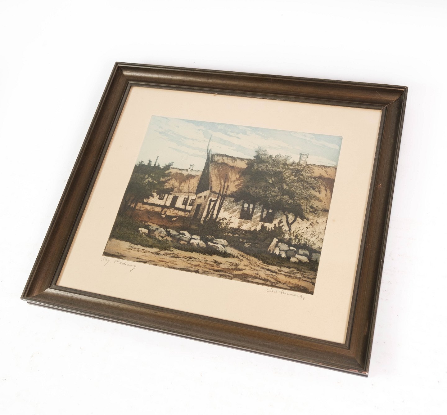Tegning af stråtækt hus med ukendt signatur og mørk træramme fra 1930erne.