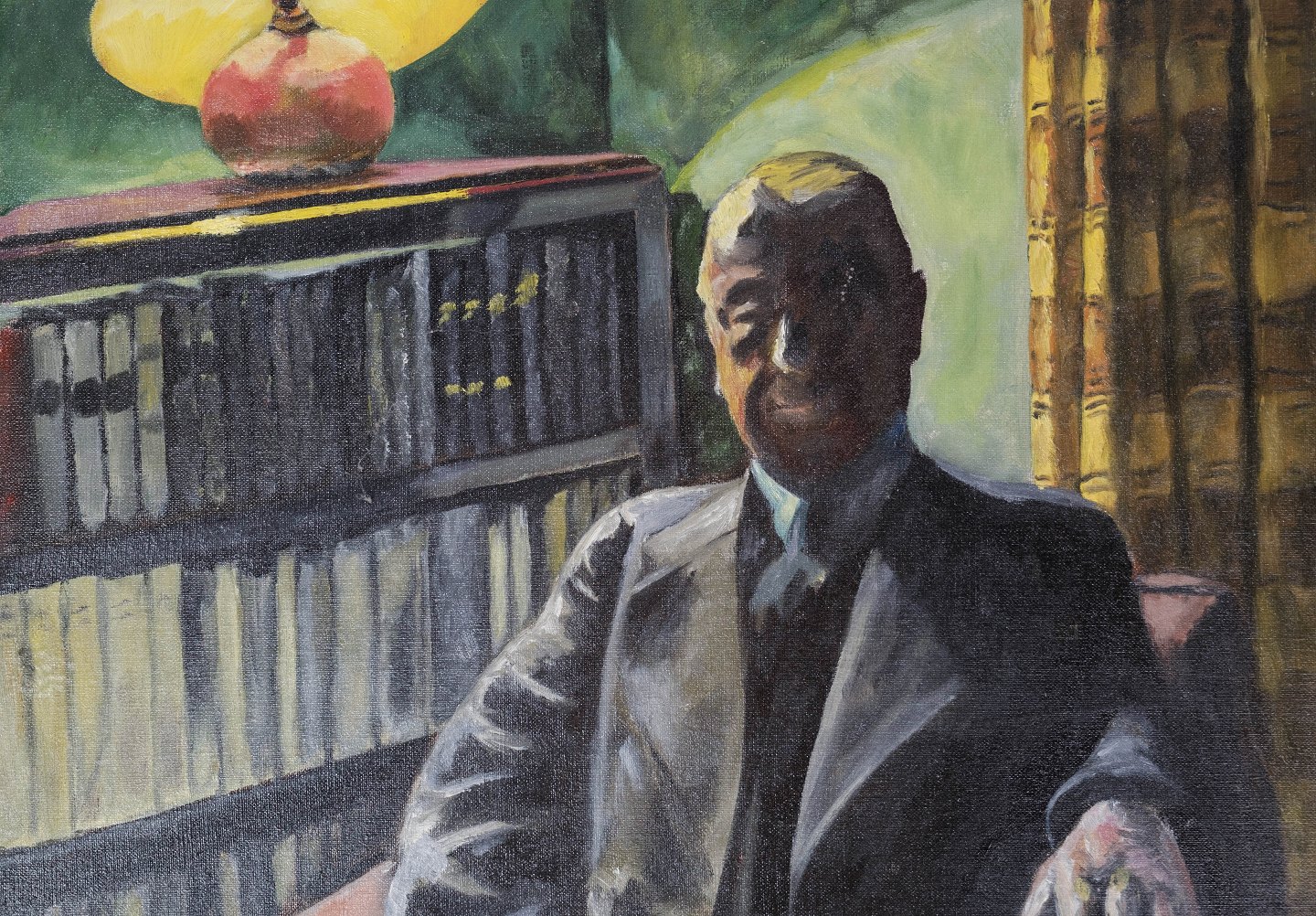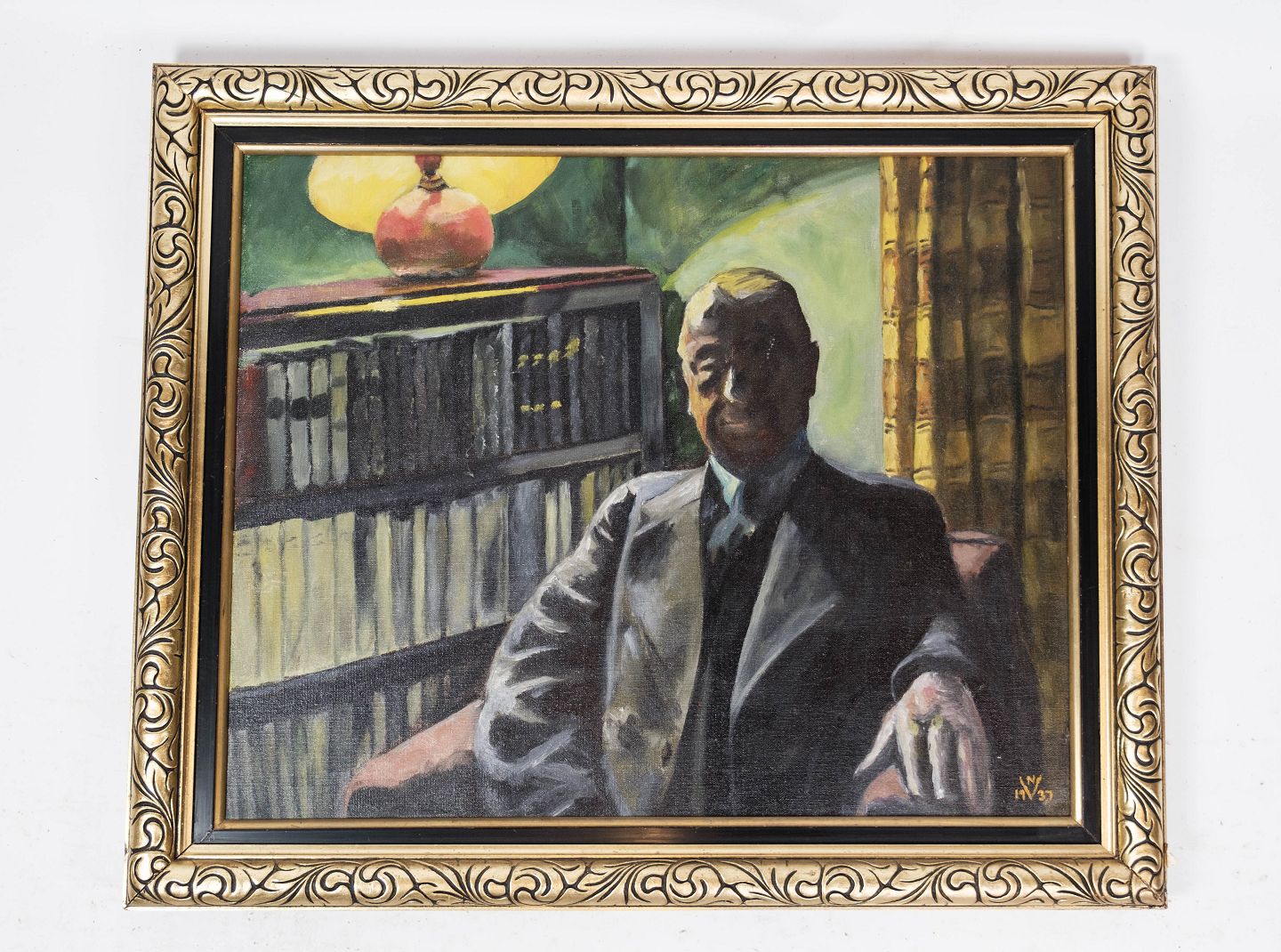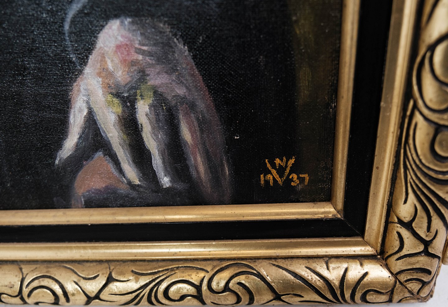 Maleri på lærred med portræt og forgyldt ramme, signeret NV fra 1937.
