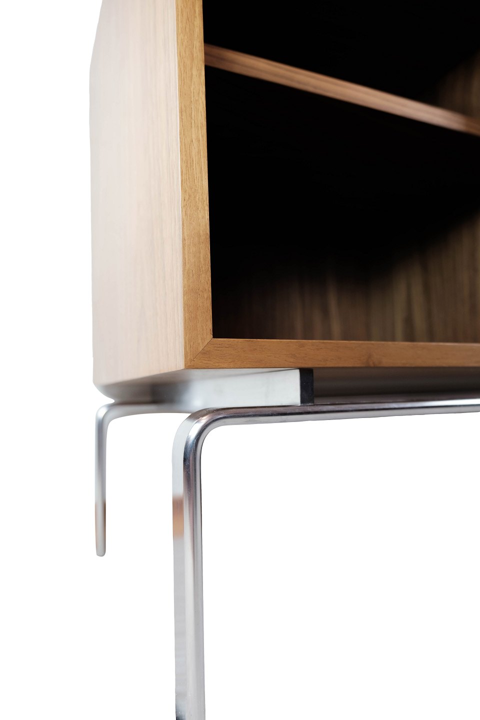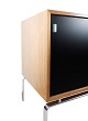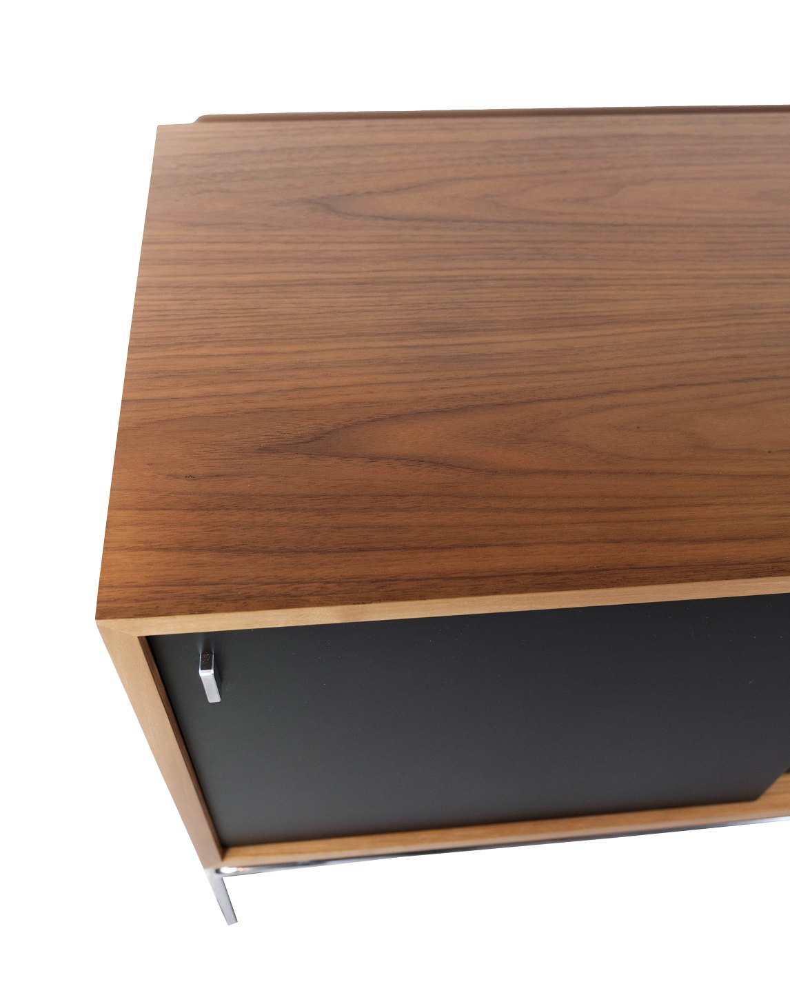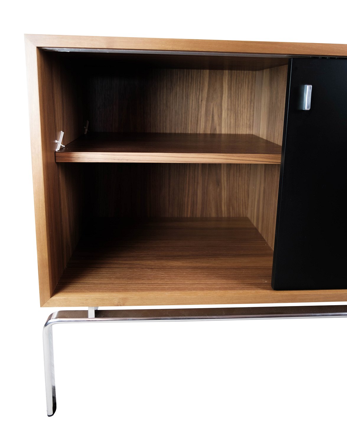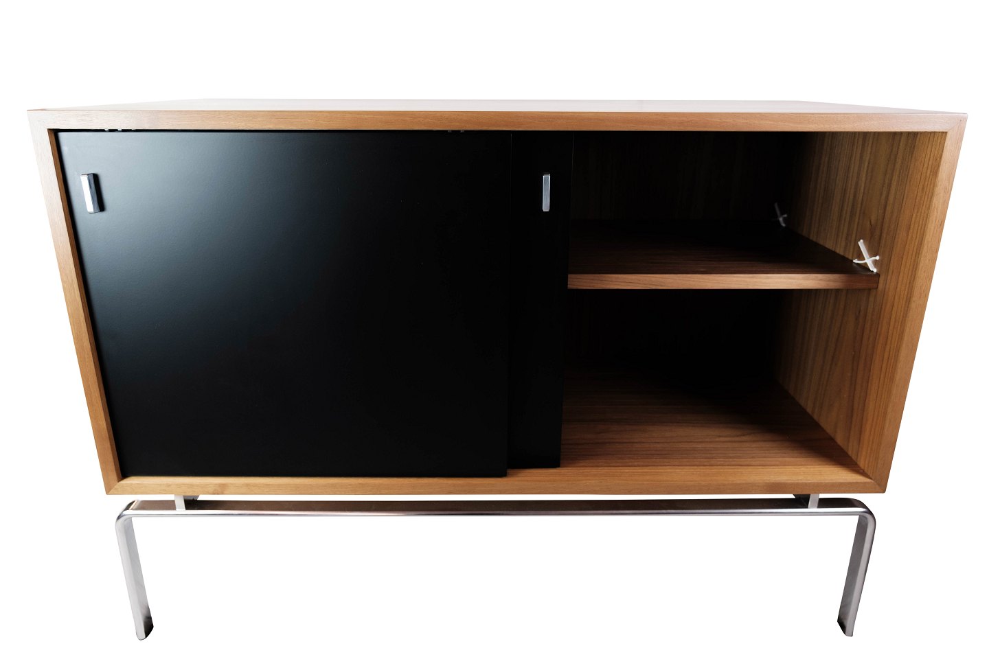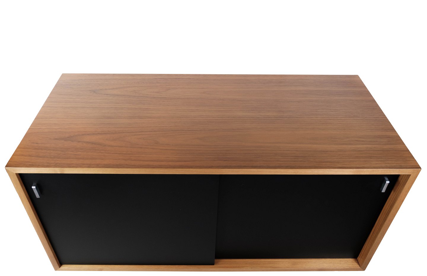SolgtSkænk, model FK 100, af Santon palisander og sorte skydedøre, designet af Fabricius og Kastholm, samt fremstillet af Lange Production. Skænken er i flot brugt stand.