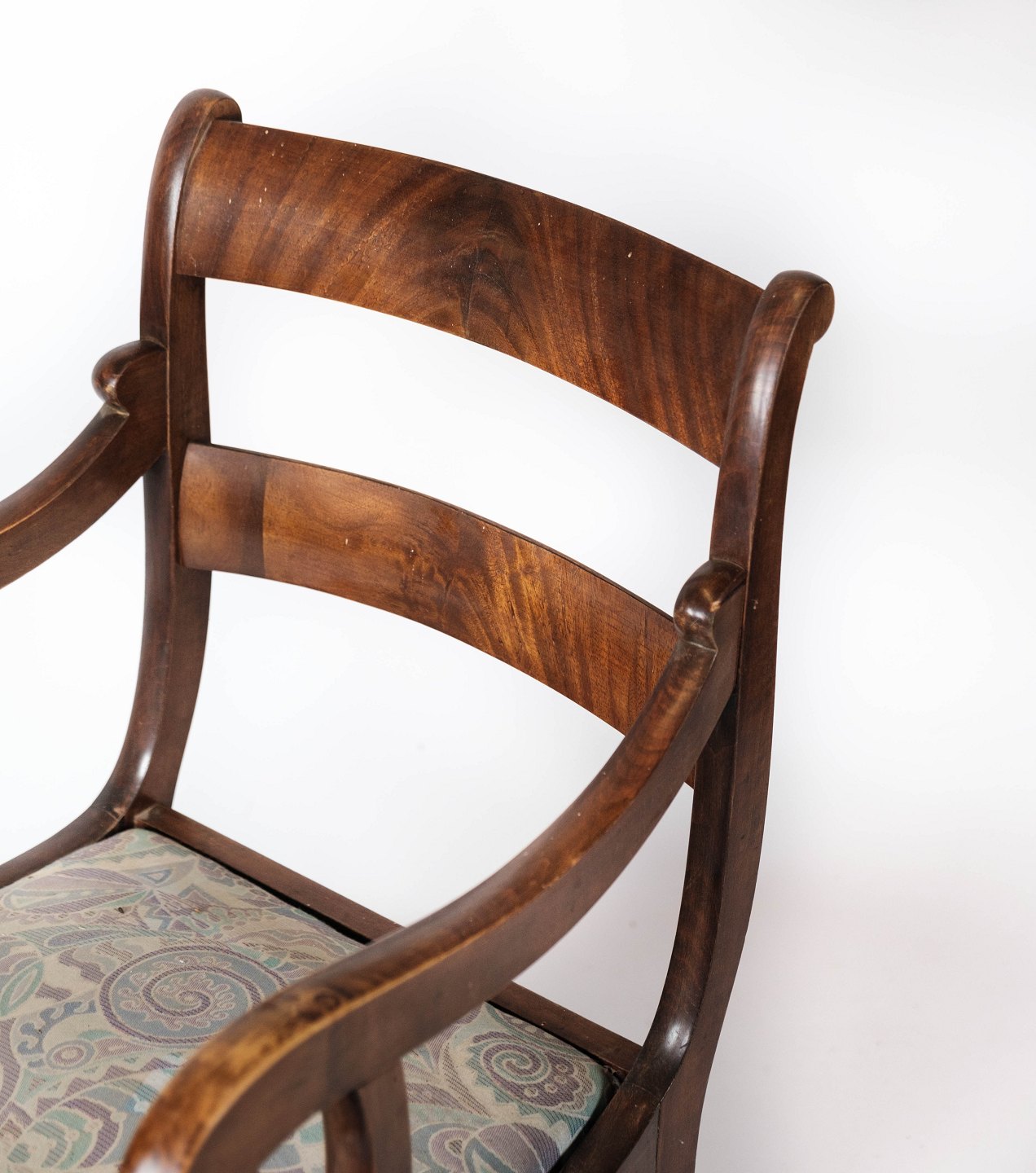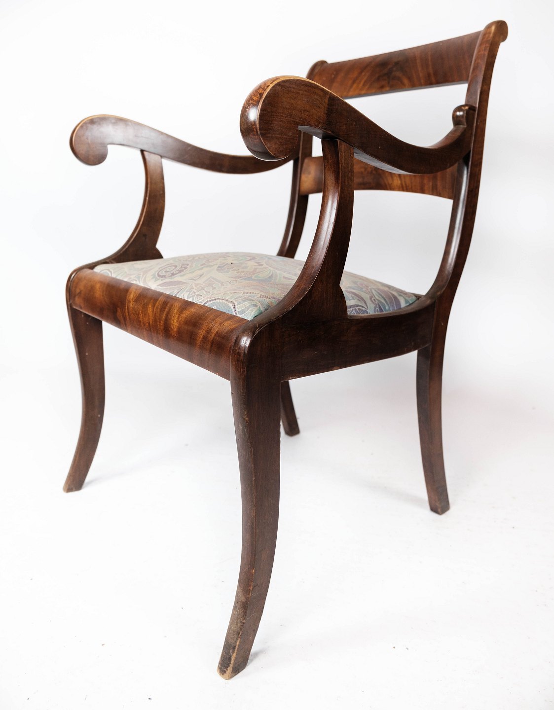 Empire antique armchair of mahogany and upholstered with light fabric from the 1840s.