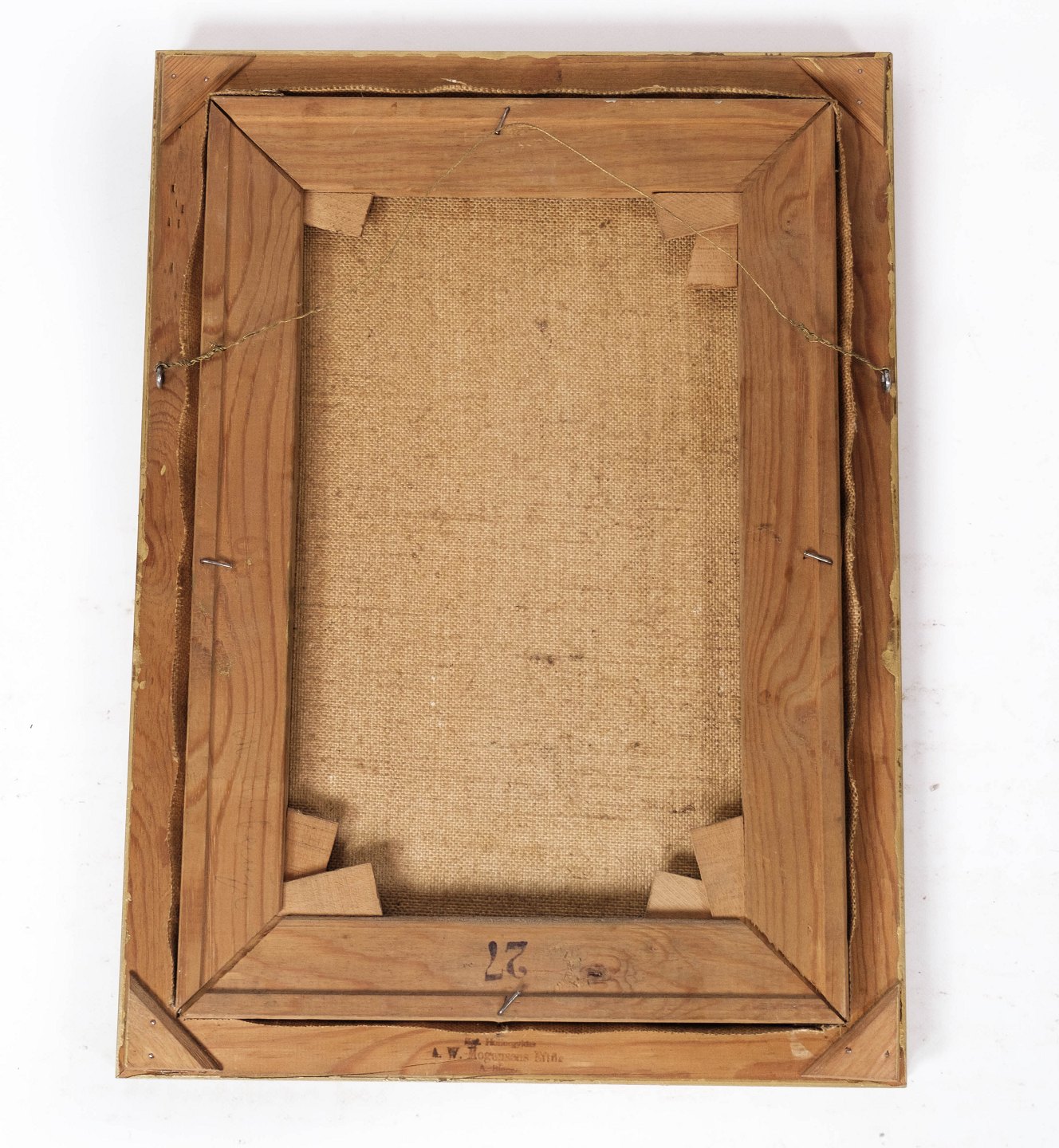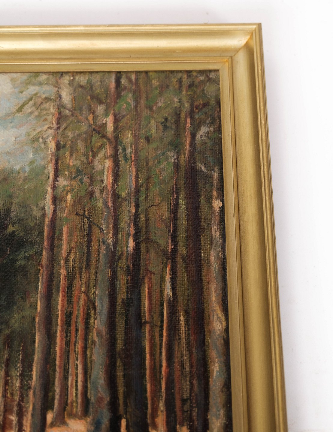 Maleri på lærred med skovmotiv og forgyldt ramme, signeret A. Toftlind 1950.