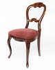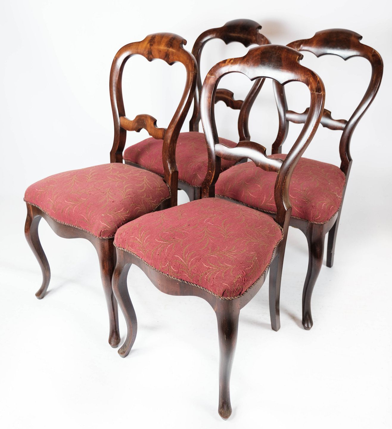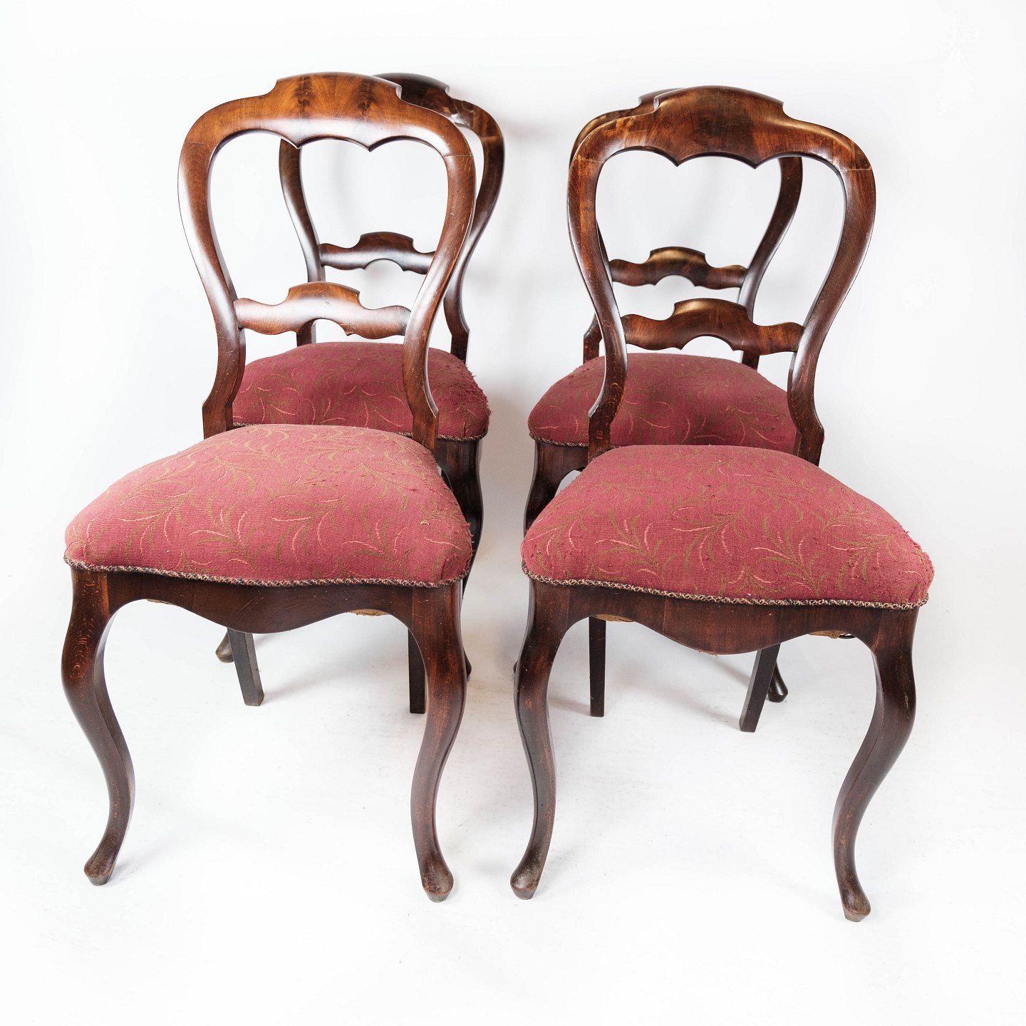 Set of four dining room chair of mahogany and upholstered with red fabric from the 1860s. The chairs are in great antique condition.