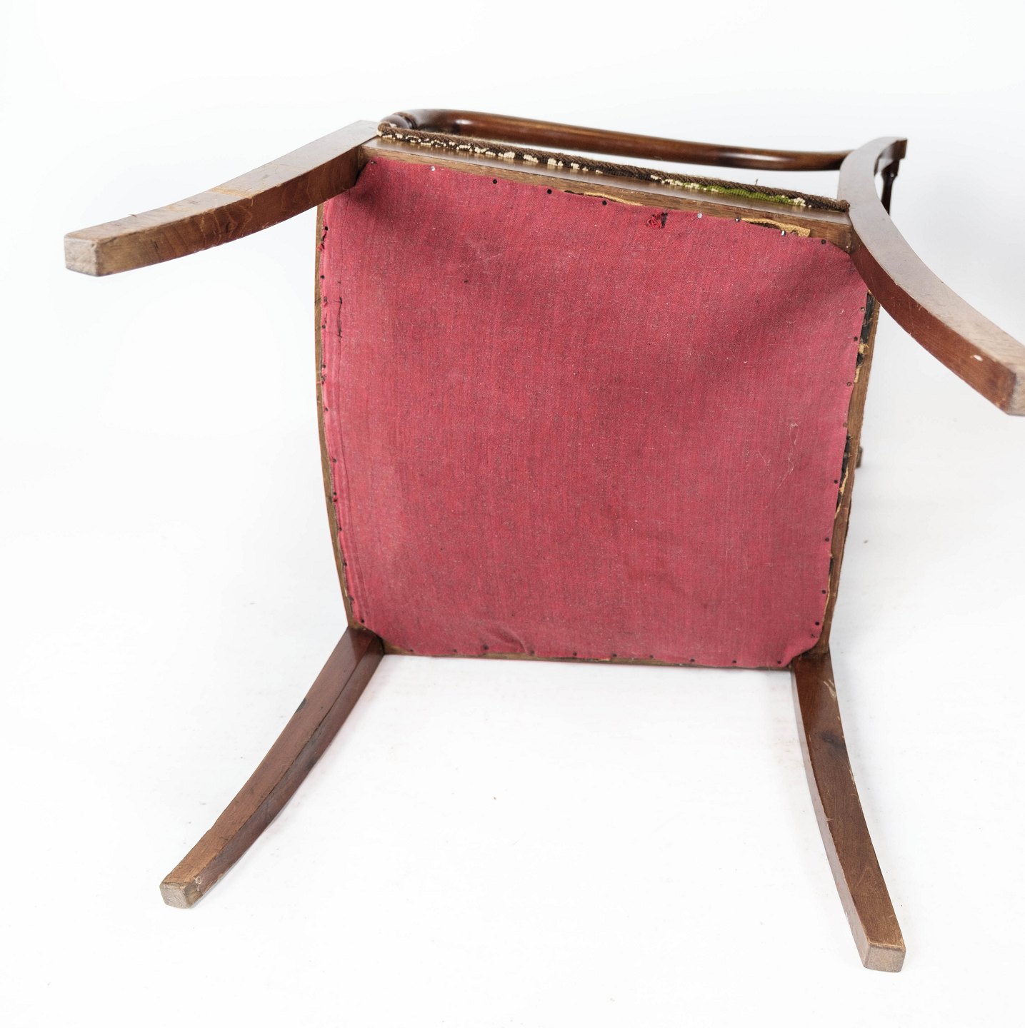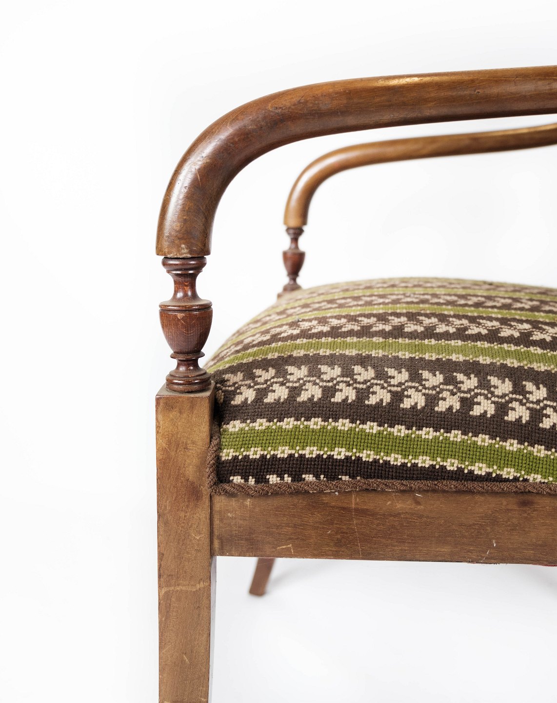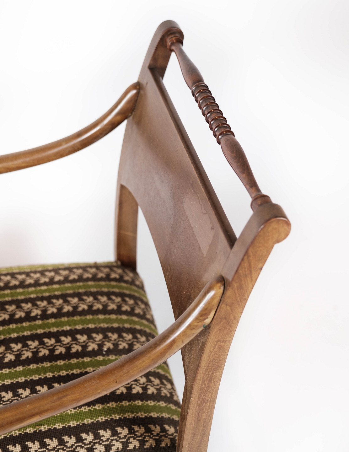 Armchair of polished mahogany and upholstered with green striped fabric from the 1860s.