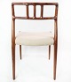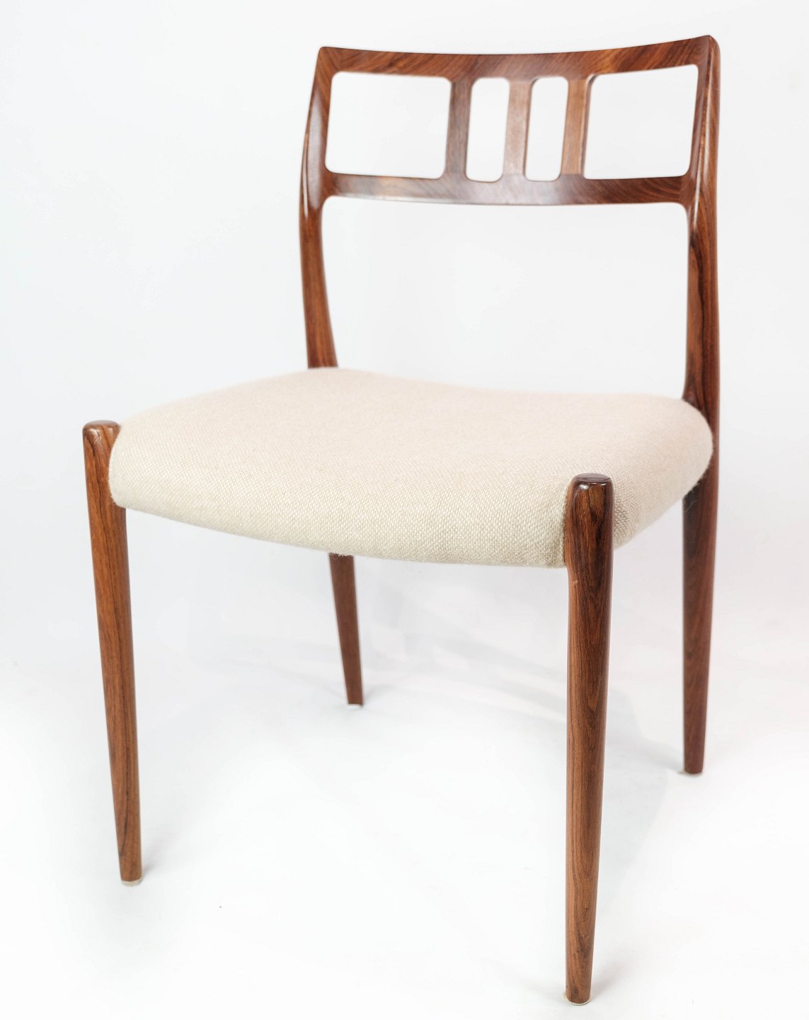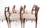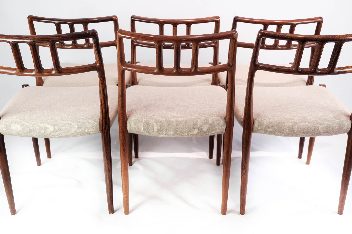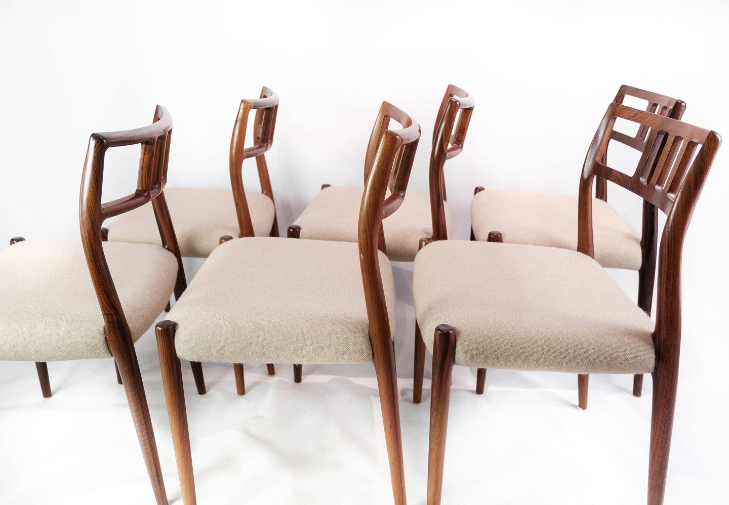SolgtEt sæt af seks spisestuestole, model 79, designet af N.O. Møller i 1966 og fremstillet af J.L. Møller i slutningen af 1960erne. Stolene er af palisander og med lyse sæder. Sælges kun samlet.