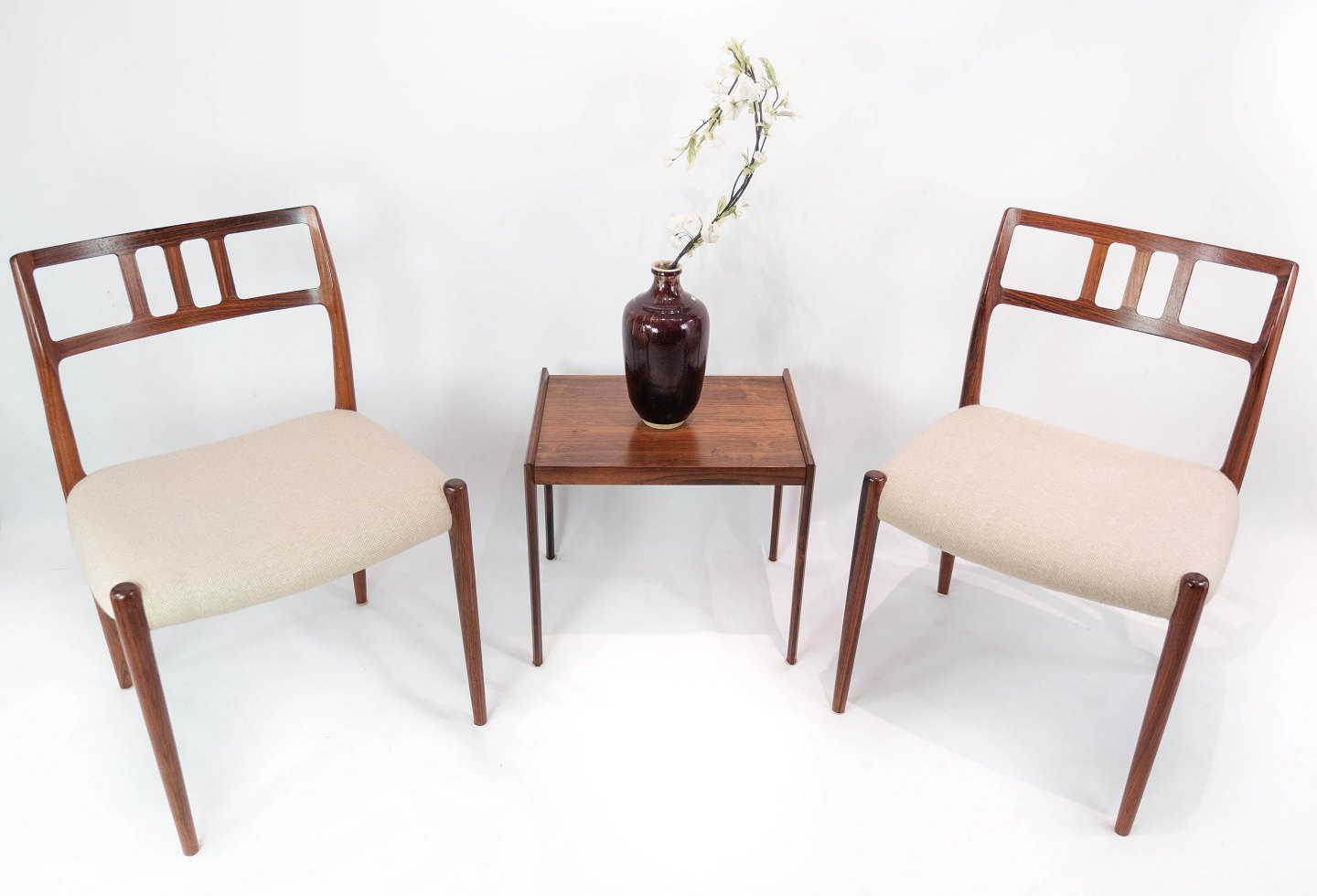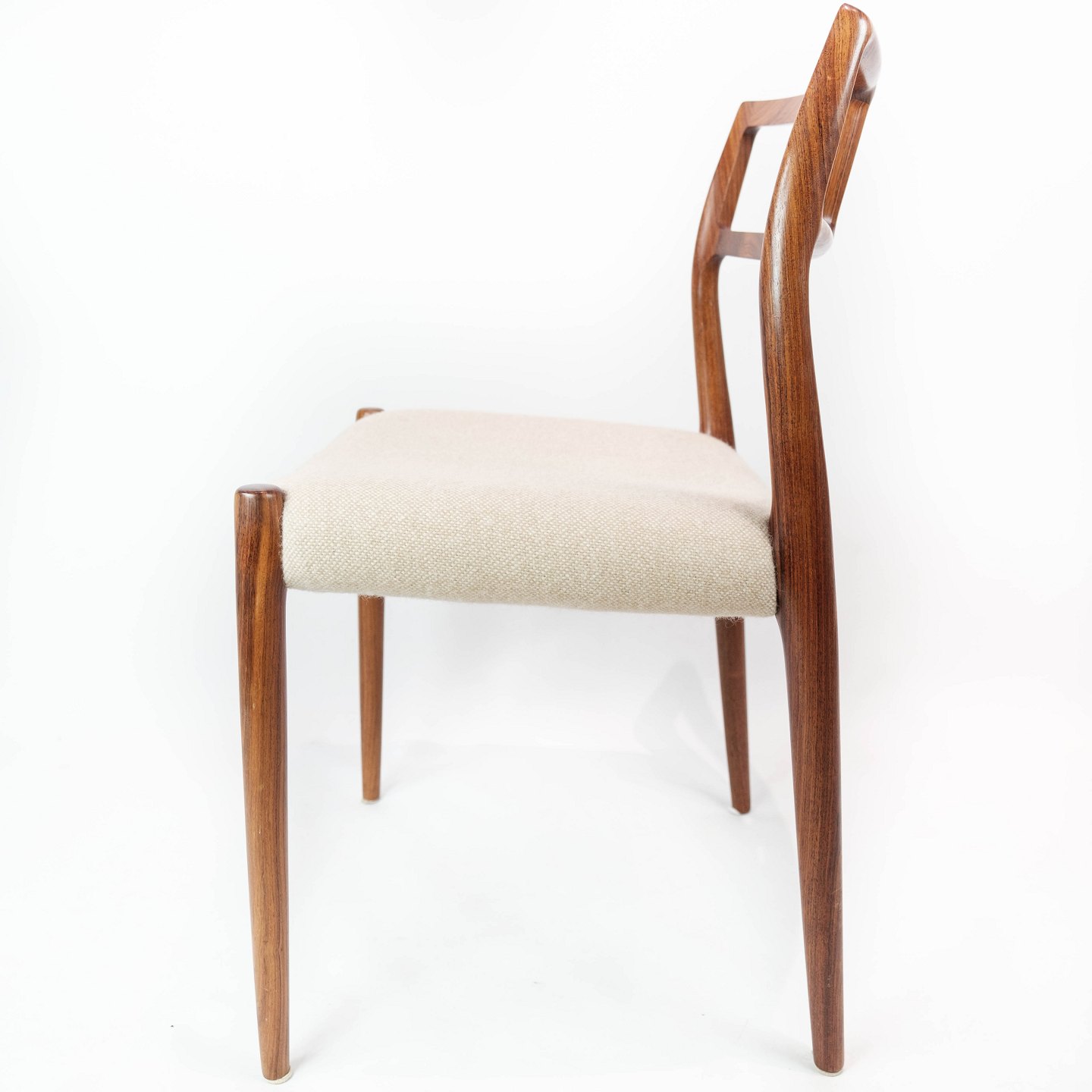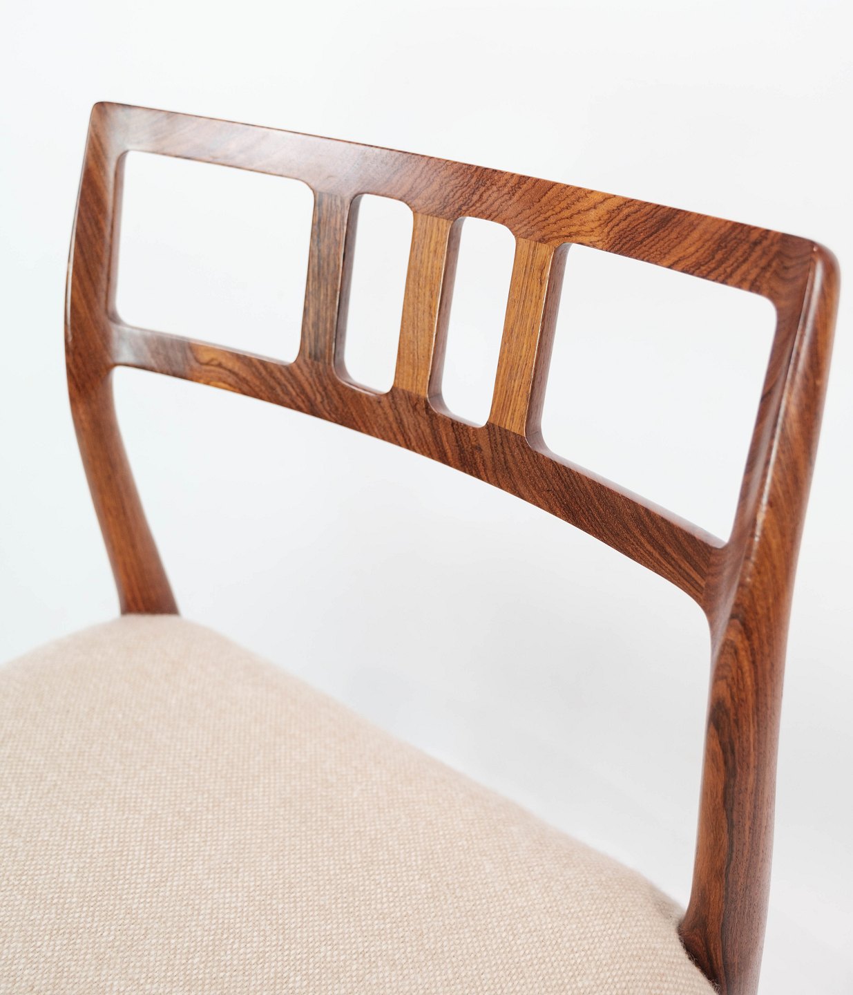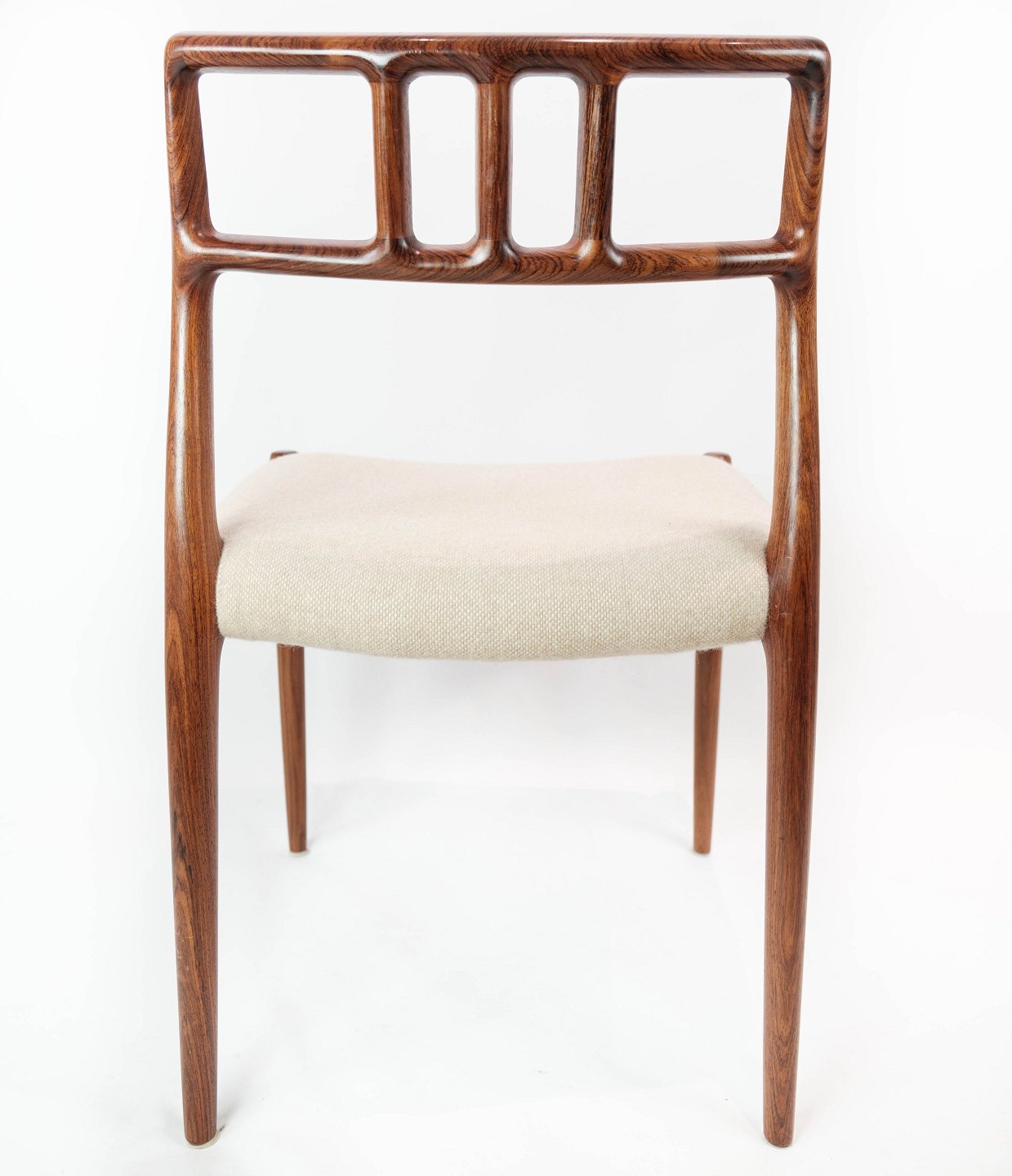 SolgtEt sæt af seks spisestuestole, model 79, designet af N.O. Møller i 1966 og fremstillet af J.L. Møller i slutningen af 1960erne. Stolene er af palisander og med lyse sæder. Sælges kun samlet.