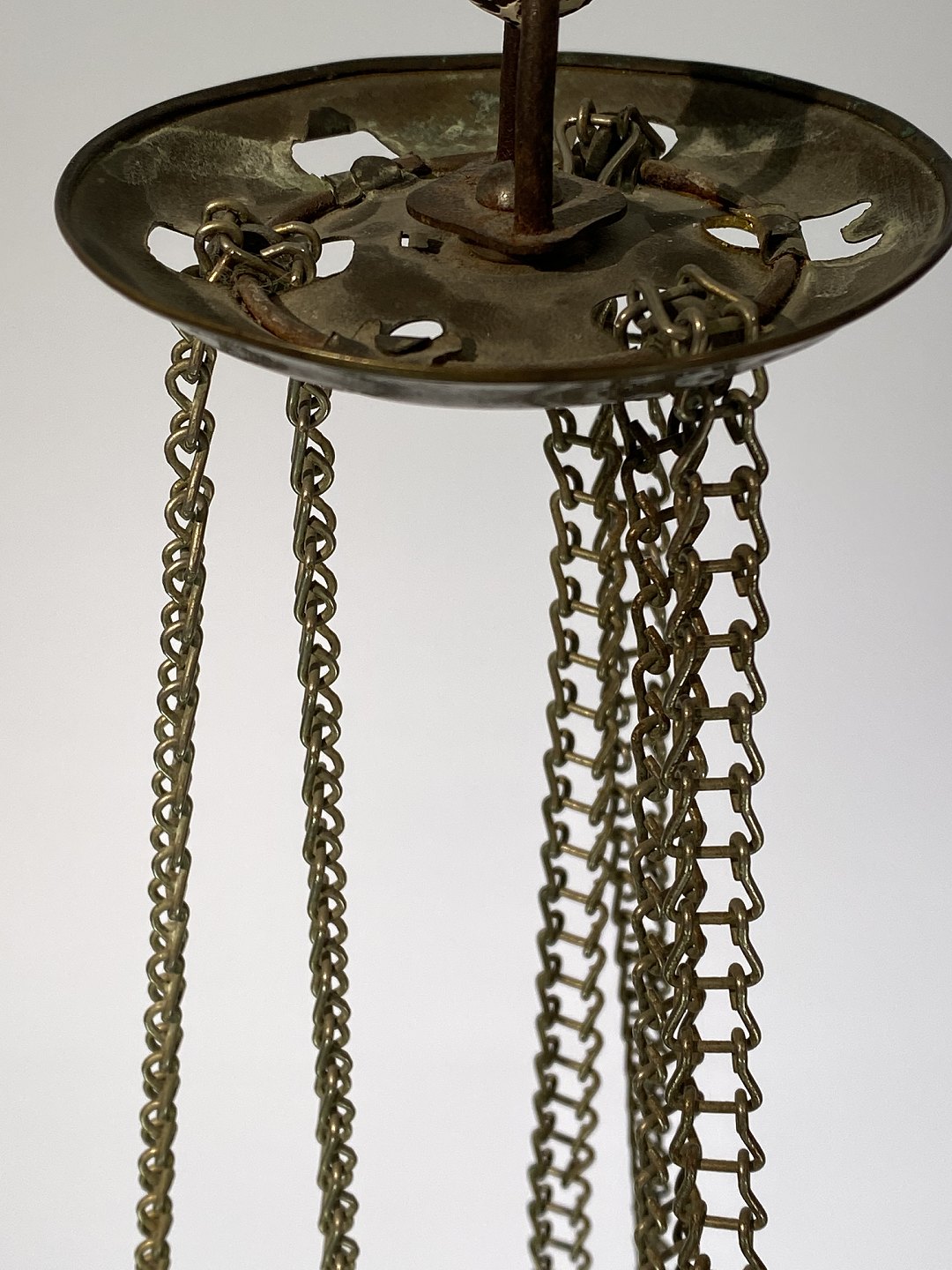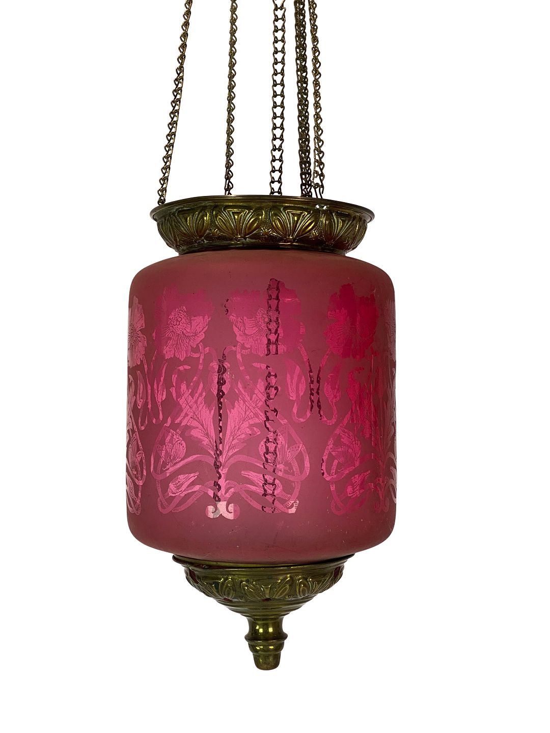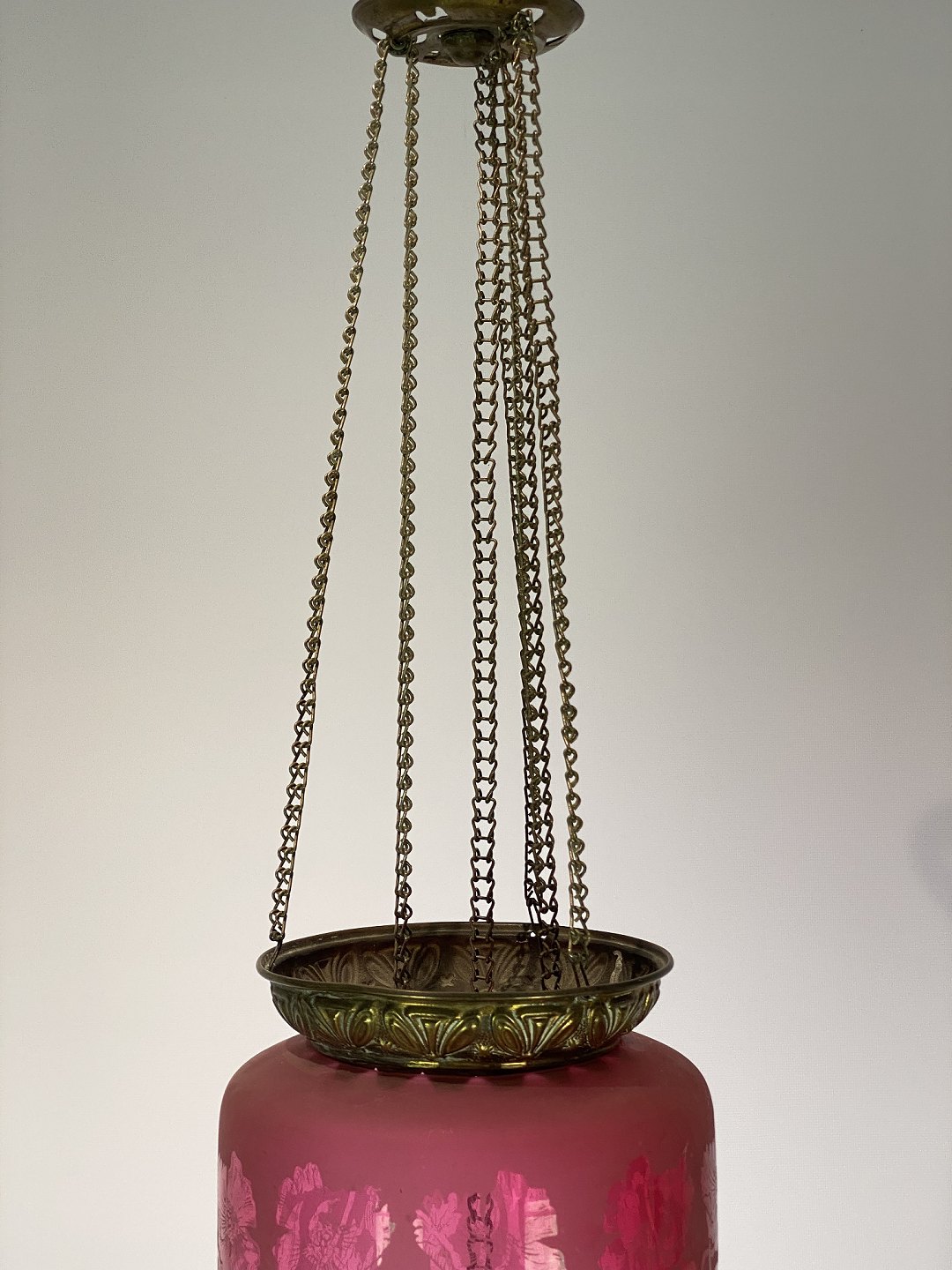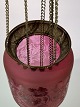 SolgtAntik Ampel med lyserødt opal glas med messing kant og ophæng, af Fyns Glasværk fra 1860erne. Pendlen er i flot antik stand.