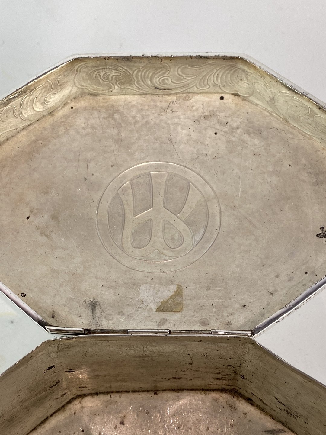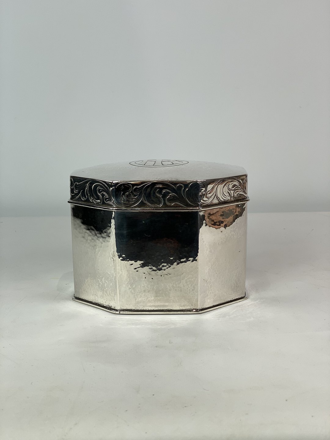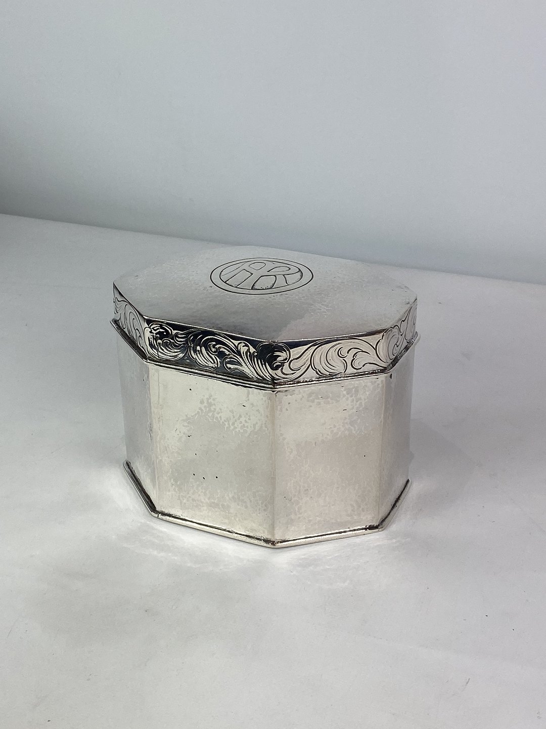 Skrin af 830 sølv, dekoreret med indgraveringer. Skrinet er ottekantet og fra 1940erne.