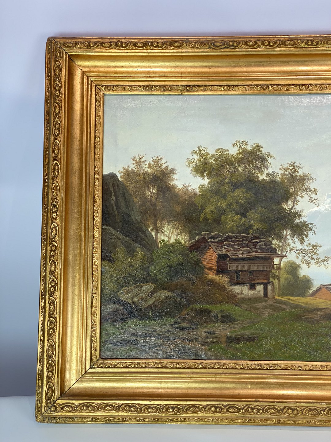 Maleri på lærred med motiv af de Schweiziske alper og med bred forgyldt ramme, fra omkring 1680.