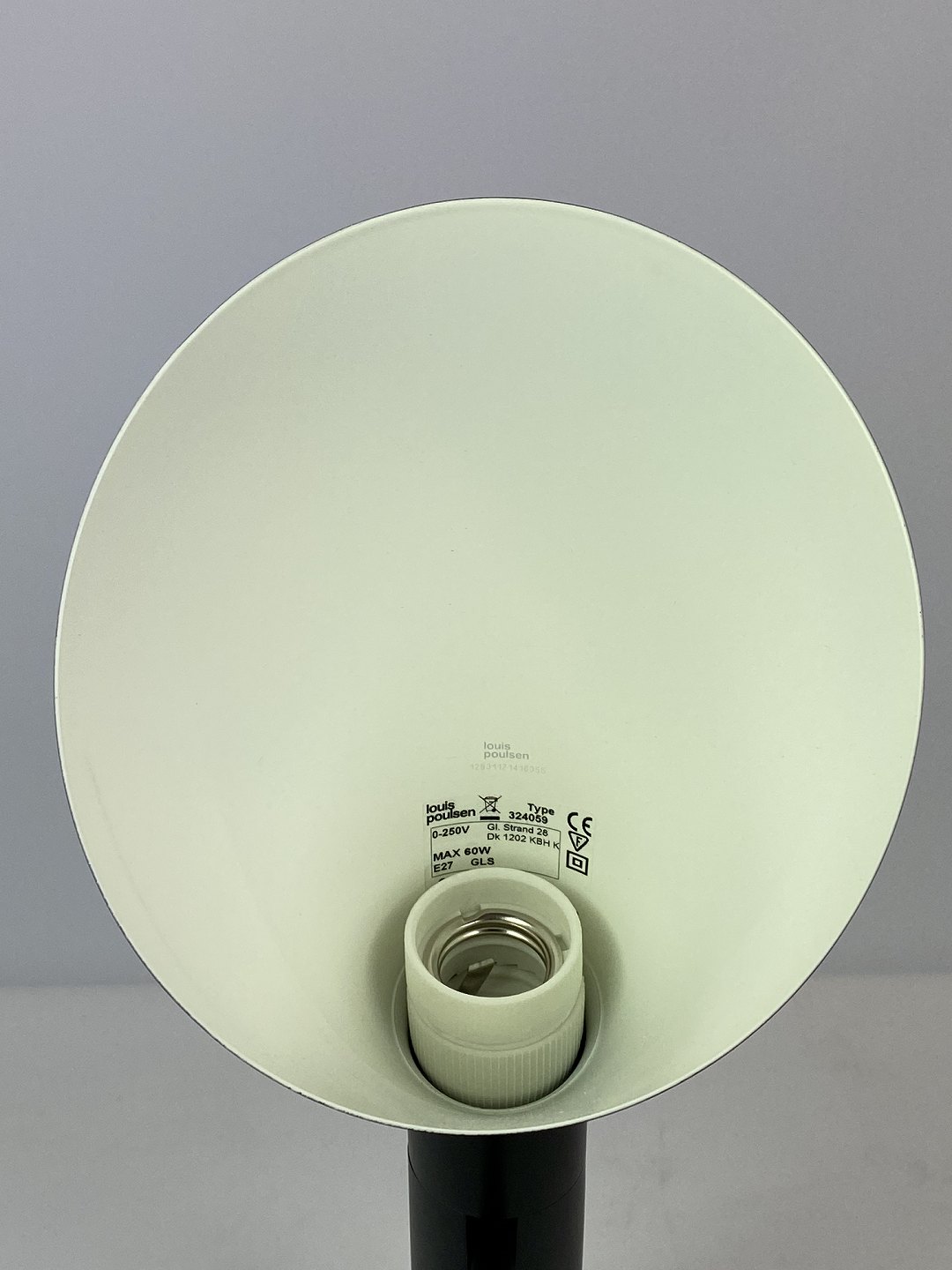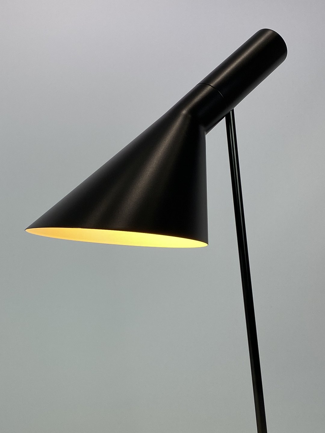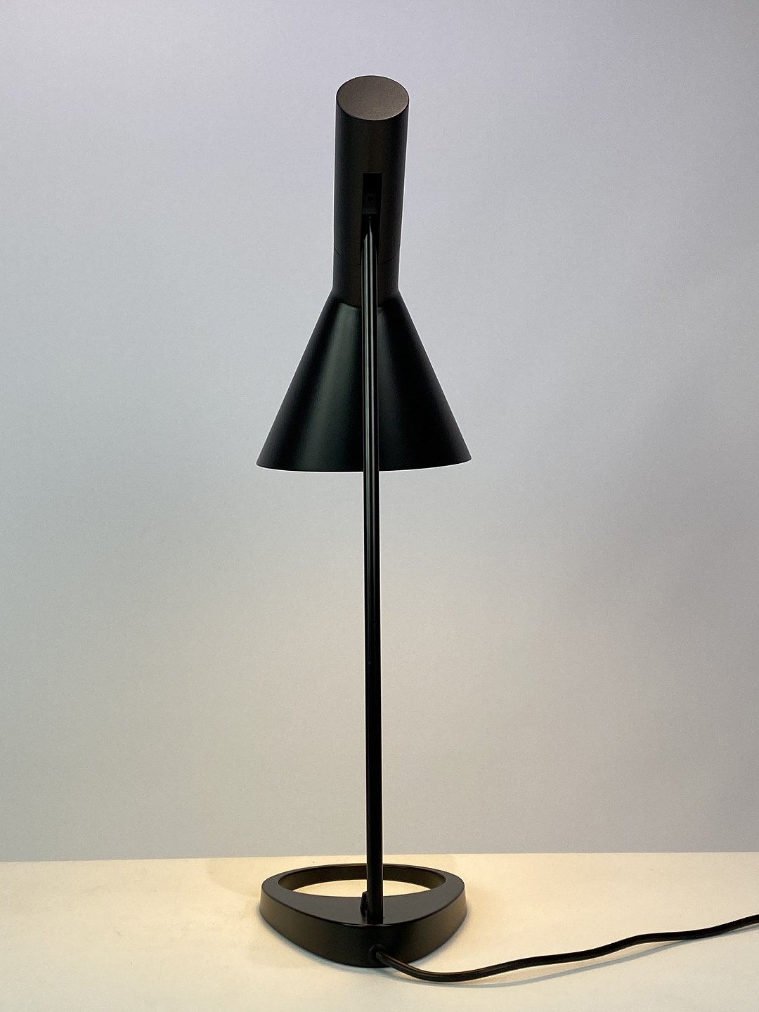 SolgtSort bordlampe designet af Arne Jacobsen og fremstillet af Louis Poulsen. Lampen blev originalt tegnet til SAS Royal Hotel i København i 1957 til hotellets designkoncept. Lampen her er den originale af stål med vipbart hoved, som udsender et direkte og retningsbestemt lys. Den er lakeret hvid på indersiden, samt sort udvendig. Lampen er i flot brugt stand.
