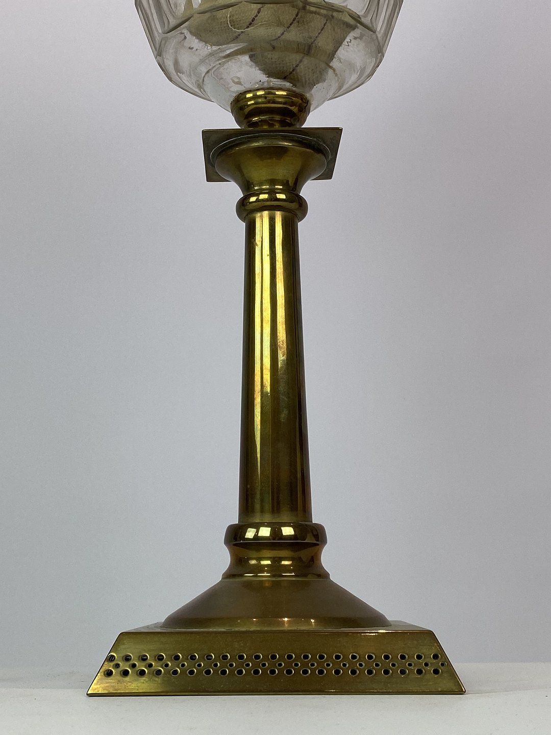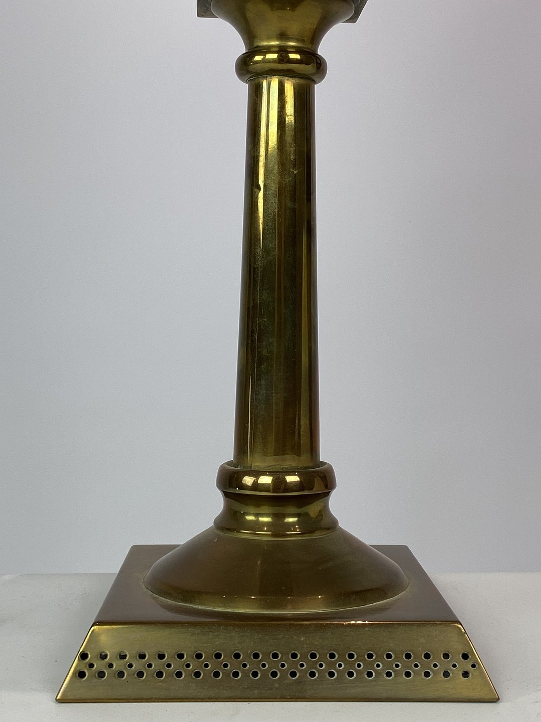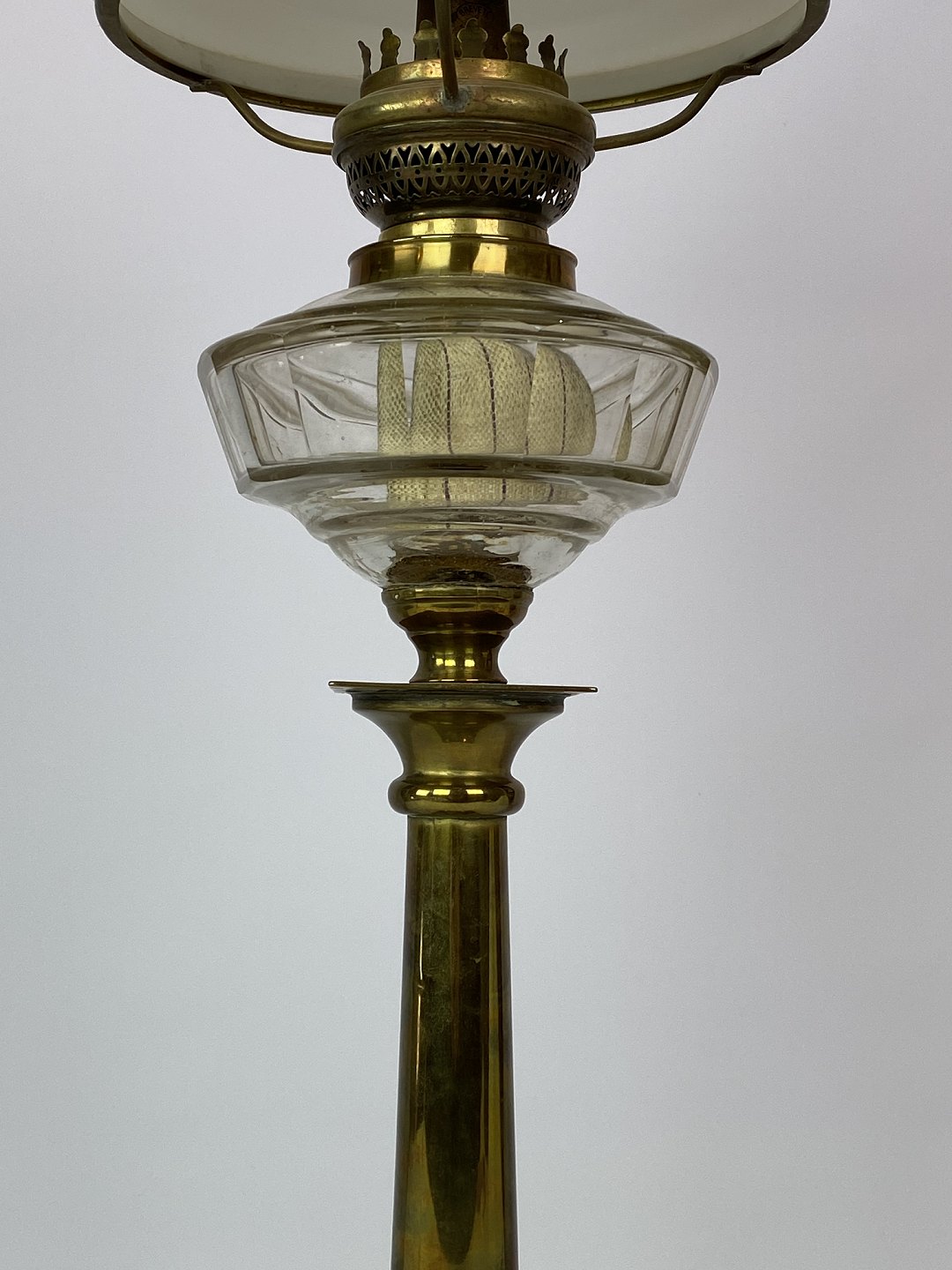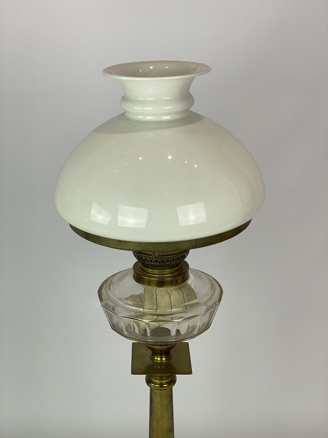 Petroleumslampe af messing med skærm af hvid opal skærm fra omkring 1860.