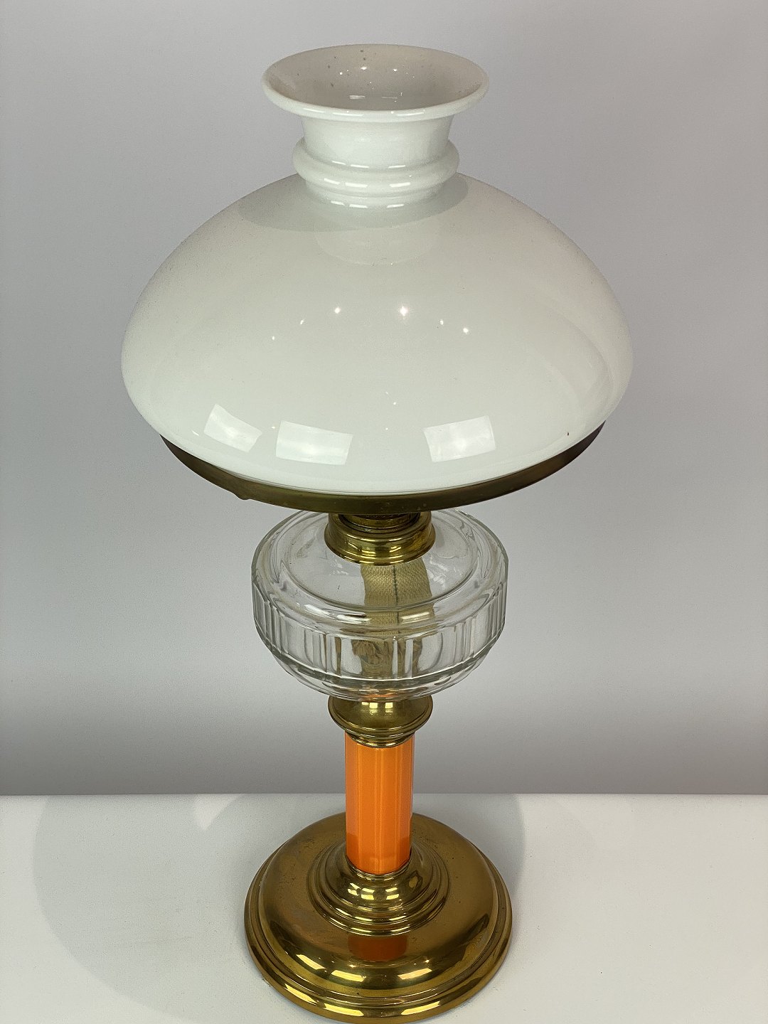 Petroleumslampe af messing med hvid opal glas skærm, samt med orange glas stamme, fra omkring 1860. Lampen er i flot antik stand.