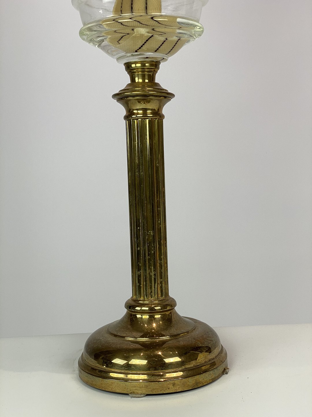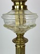 Petroleumslampe af messing med glasskærm fra omkring 1860. Lampen er i flot antik stand.