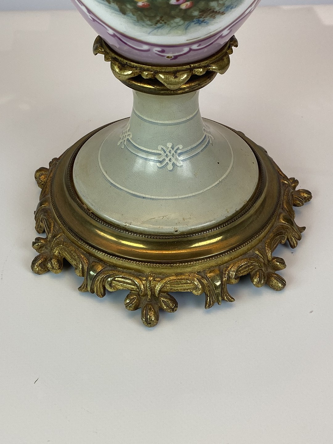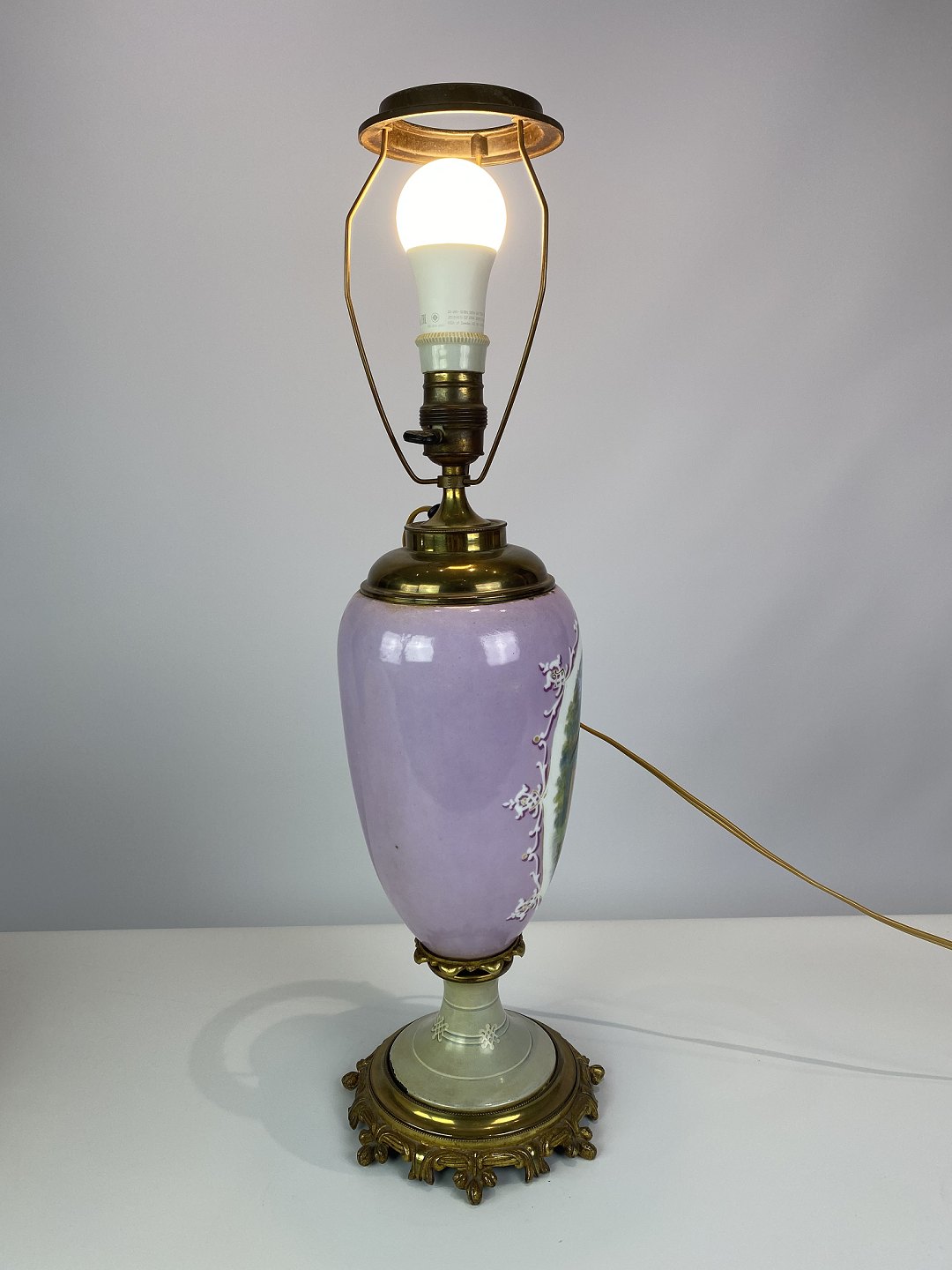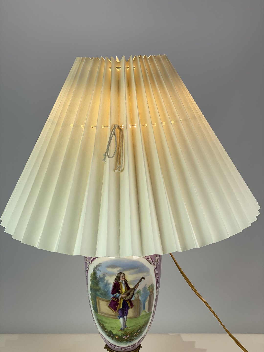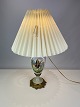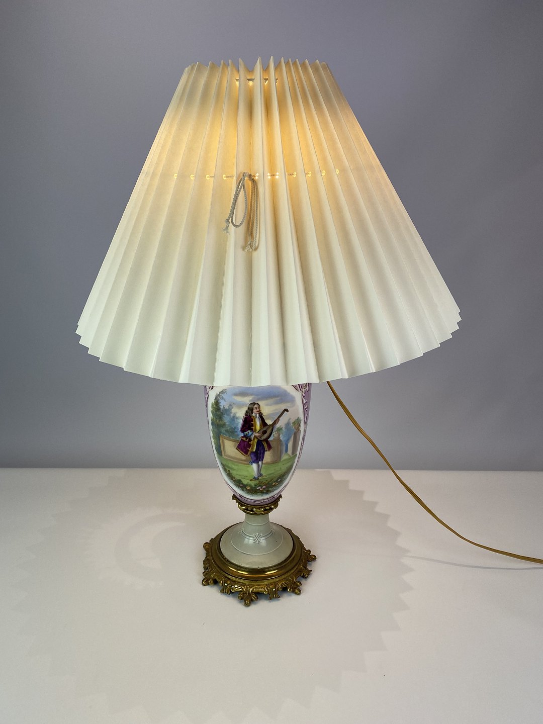 Bordlampe af porcelæn med motiv og bronze fra omkring 1920erne. Lampen er med papirskærm og er i flot antik stand.