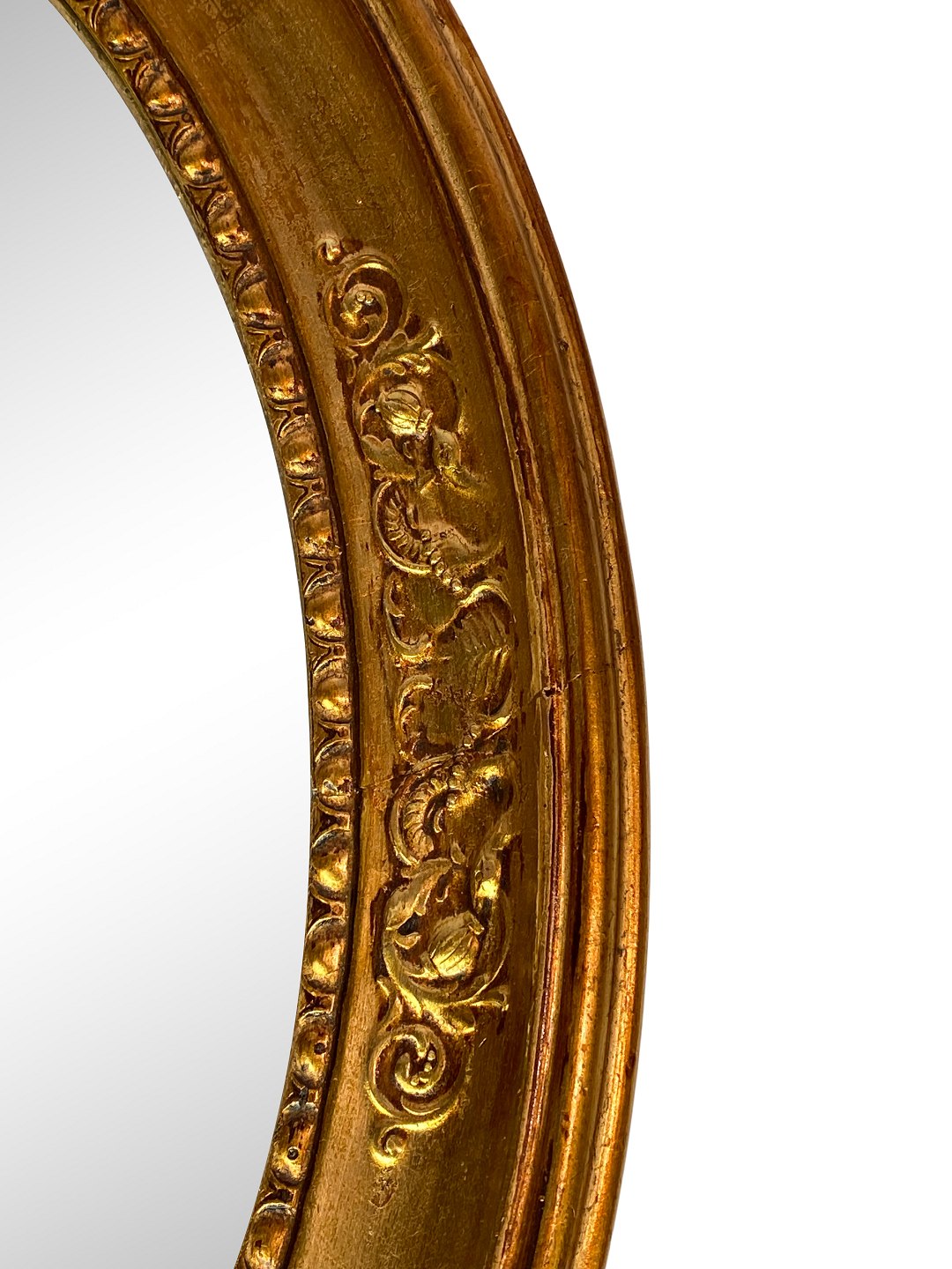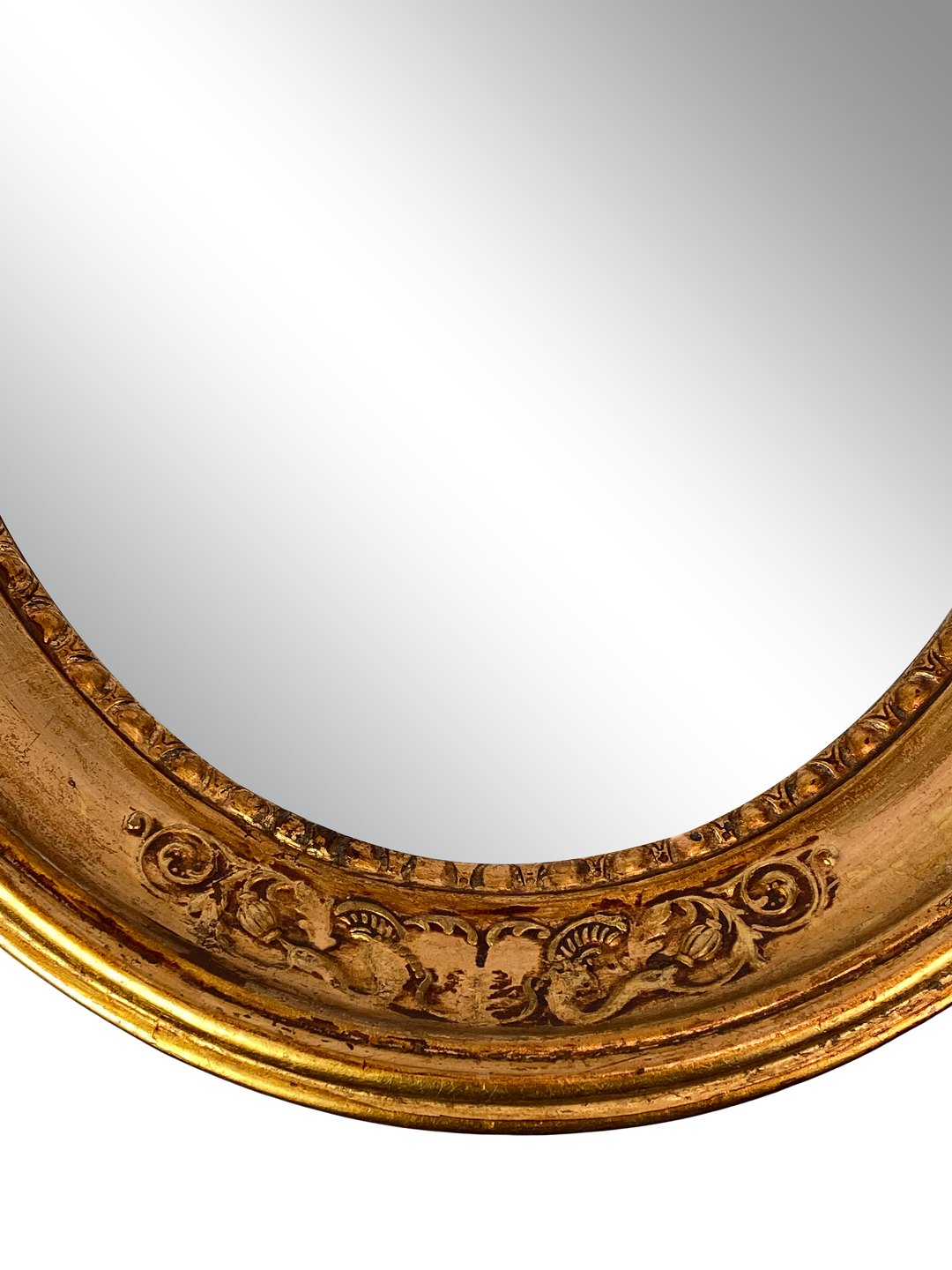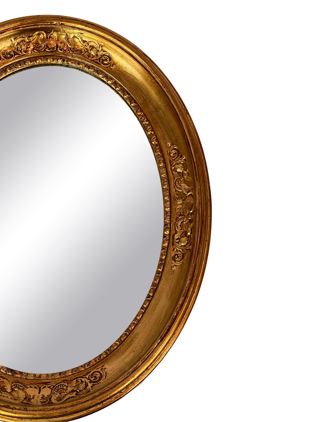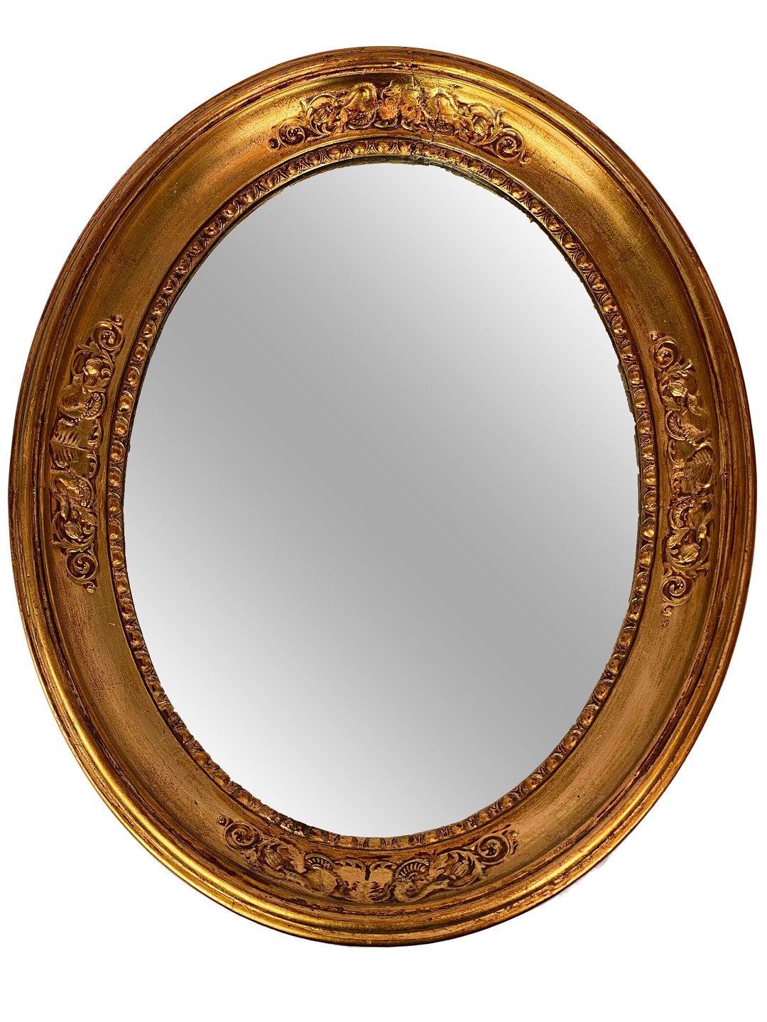 SoldOvale mirror with frame of leaf gold, from the 1920s. The mirror is in great antique condition.